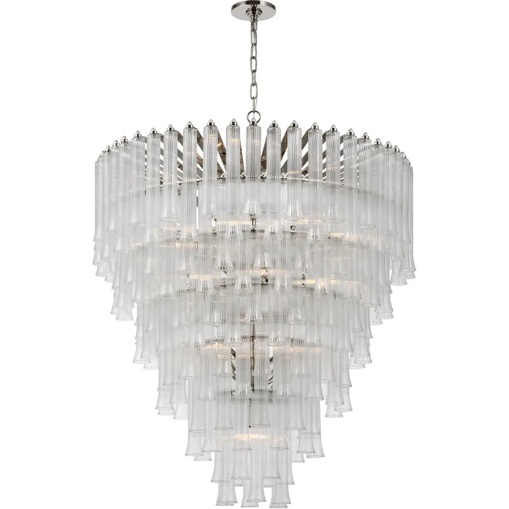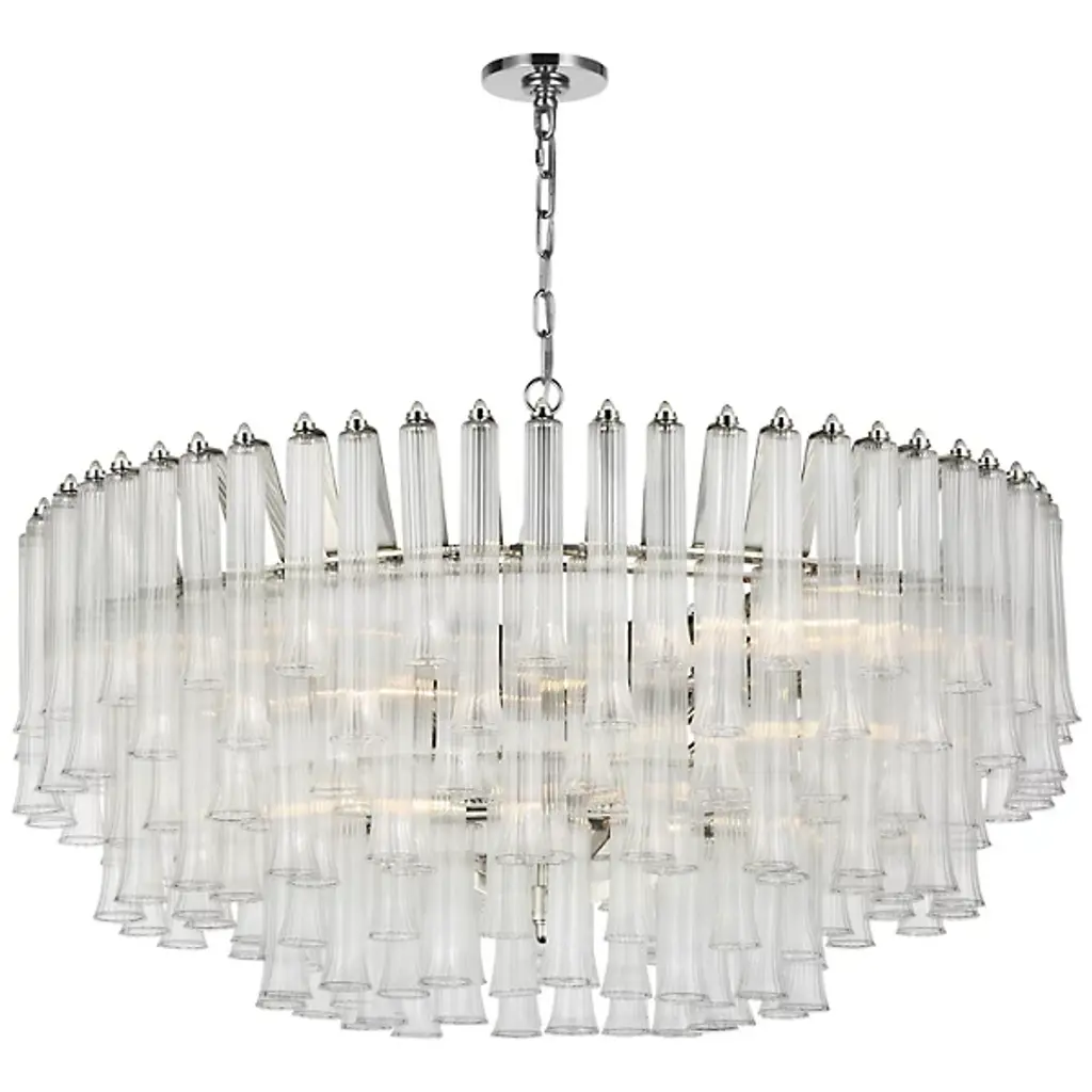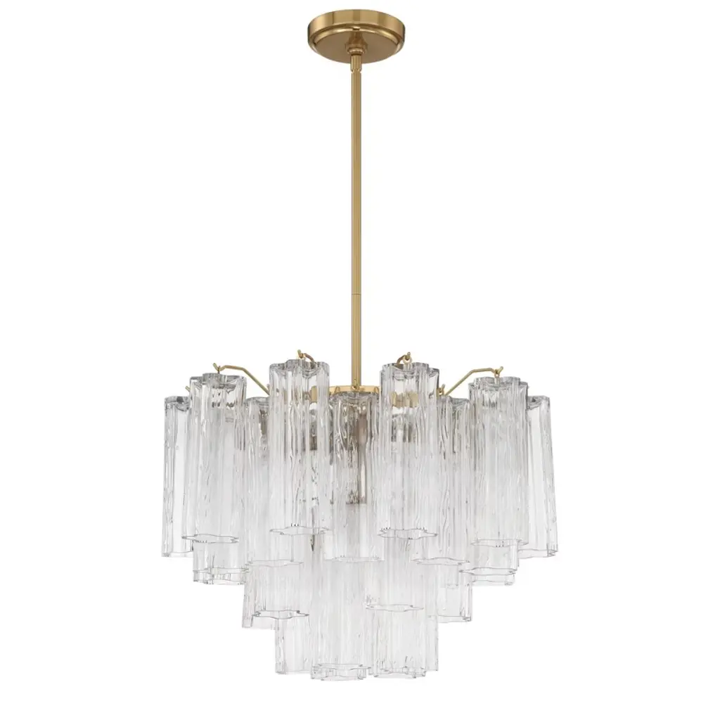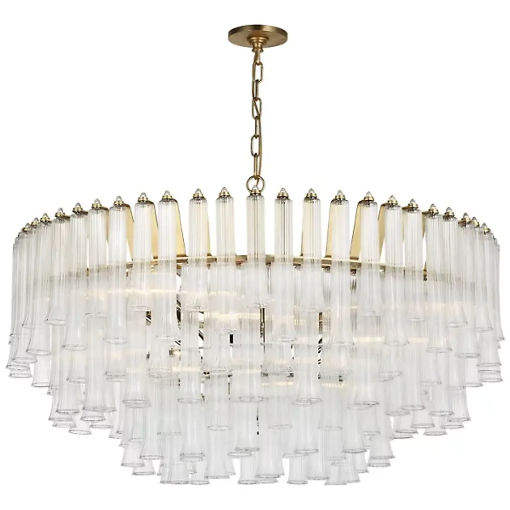 The Lorelei Chandelier from Visual Comfort Signature, formerly known as Visual Comfort, fills out the space overhead with an arresting composition of sculptural glass and a shimmering light. This grand piece proves ideal in open spaces like the foyer or living room. Its sense of scale grabs one’s attention. Crafted from metal, the chandelier’s framework cascades in elegant tiers. The fluted glass forms fix to the framework with a floating visual. The long striations and the flared curves of the glass forms lead the eyes down. Golden light textures up the glass with highlights, translating to a radiant, surrounding glow.