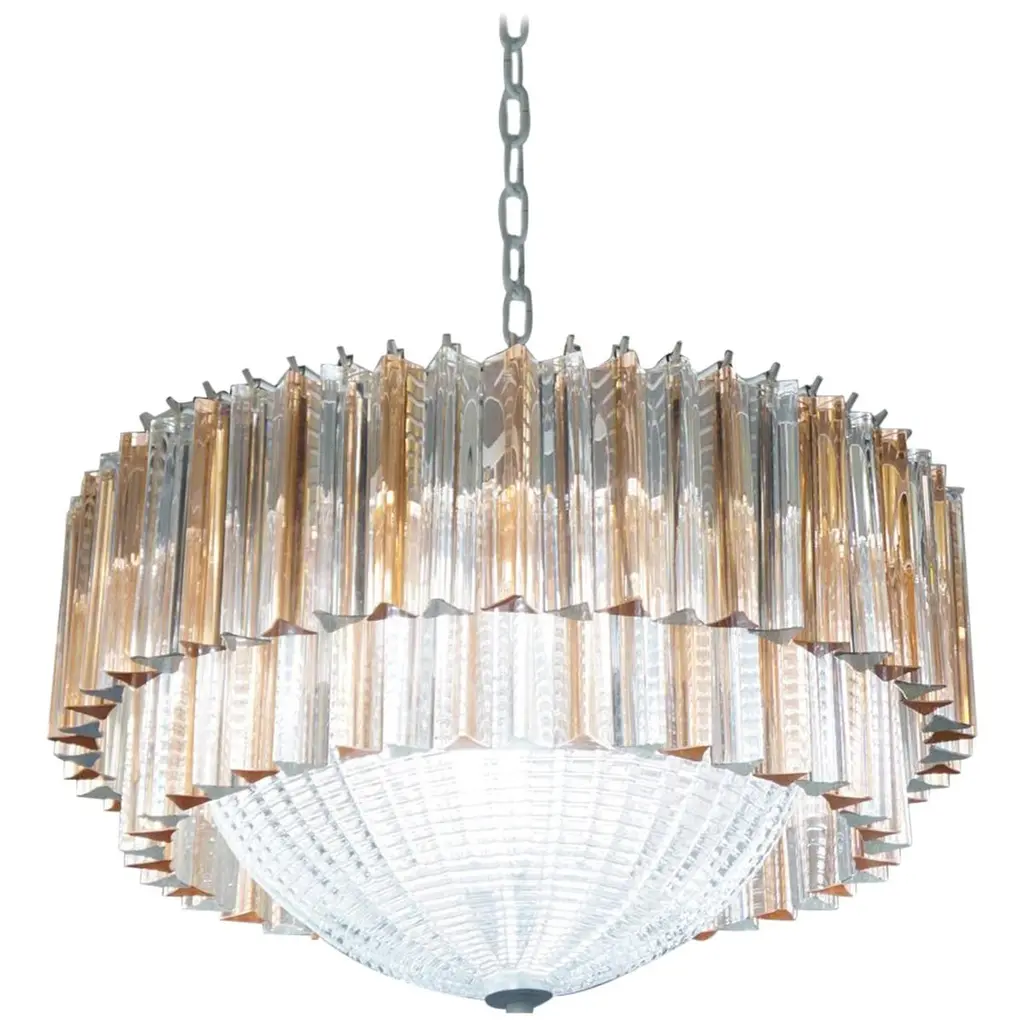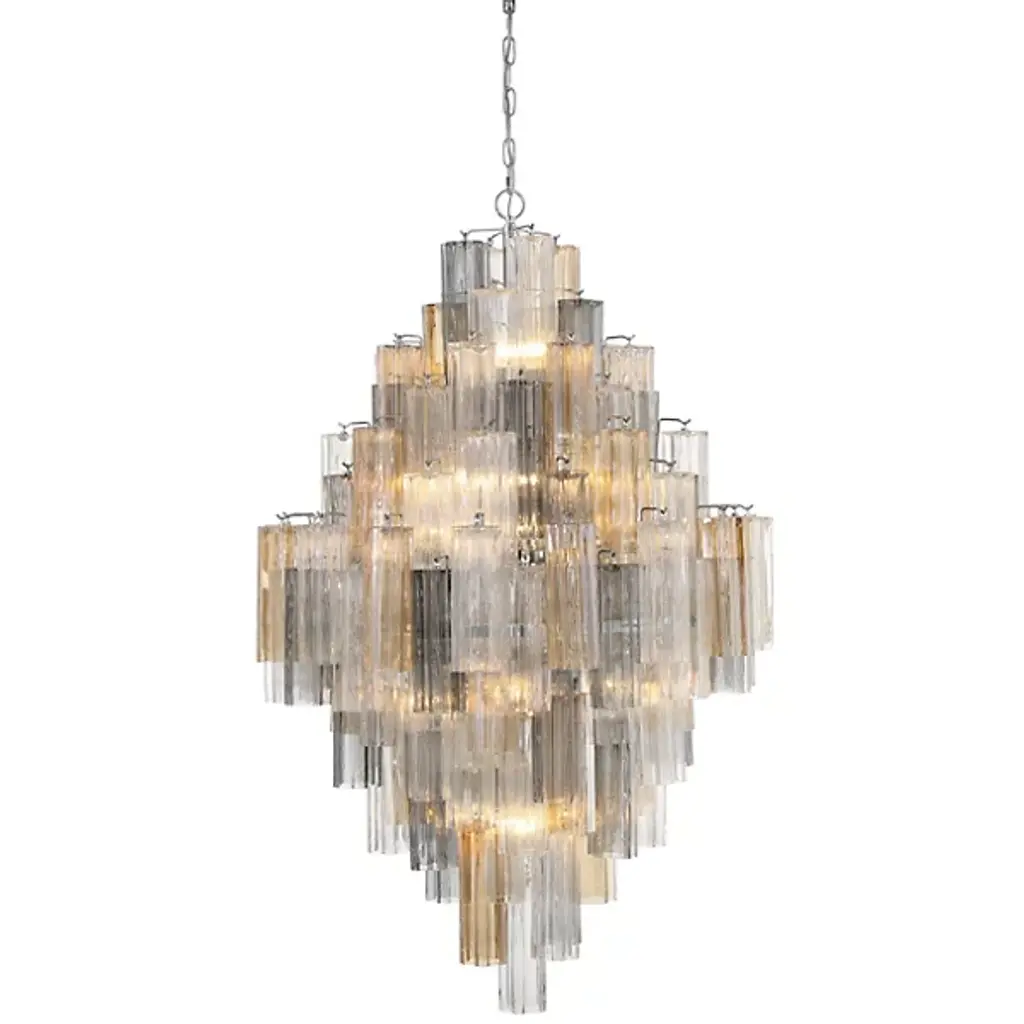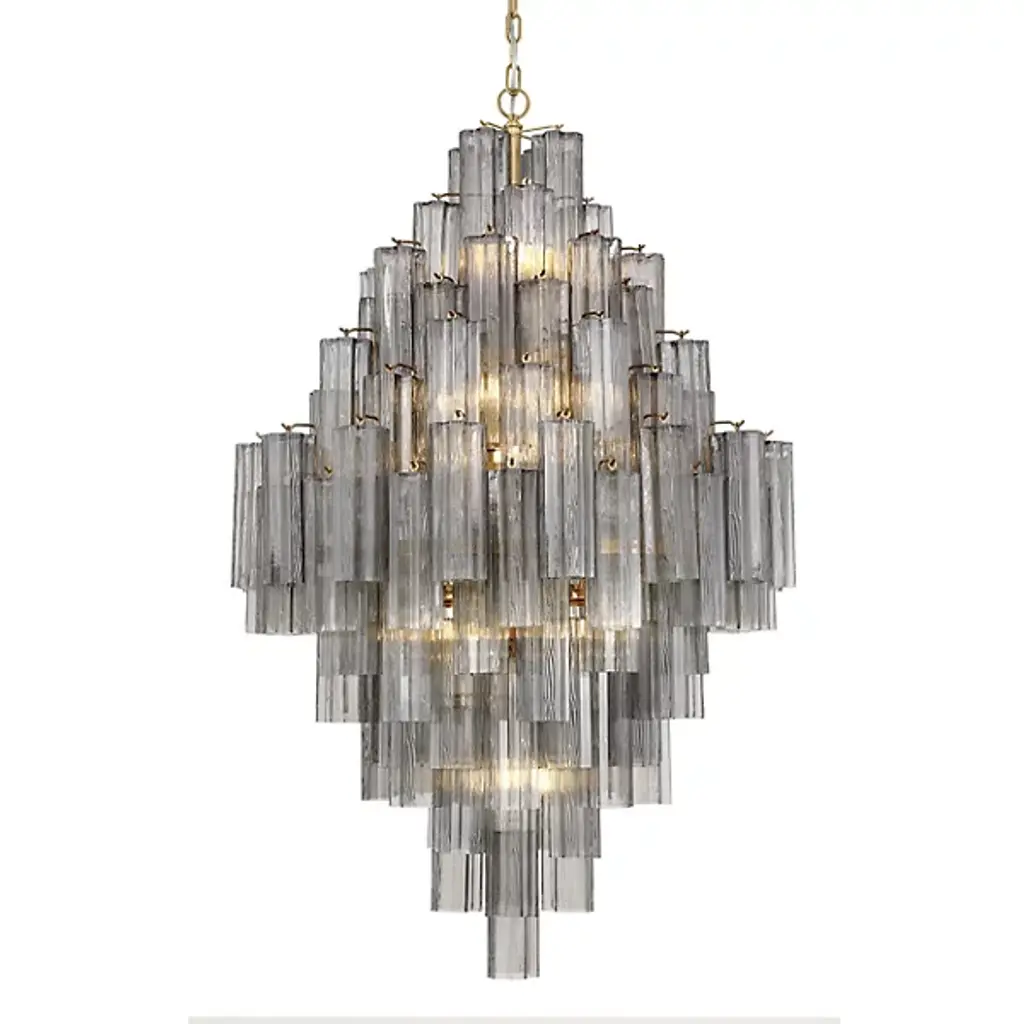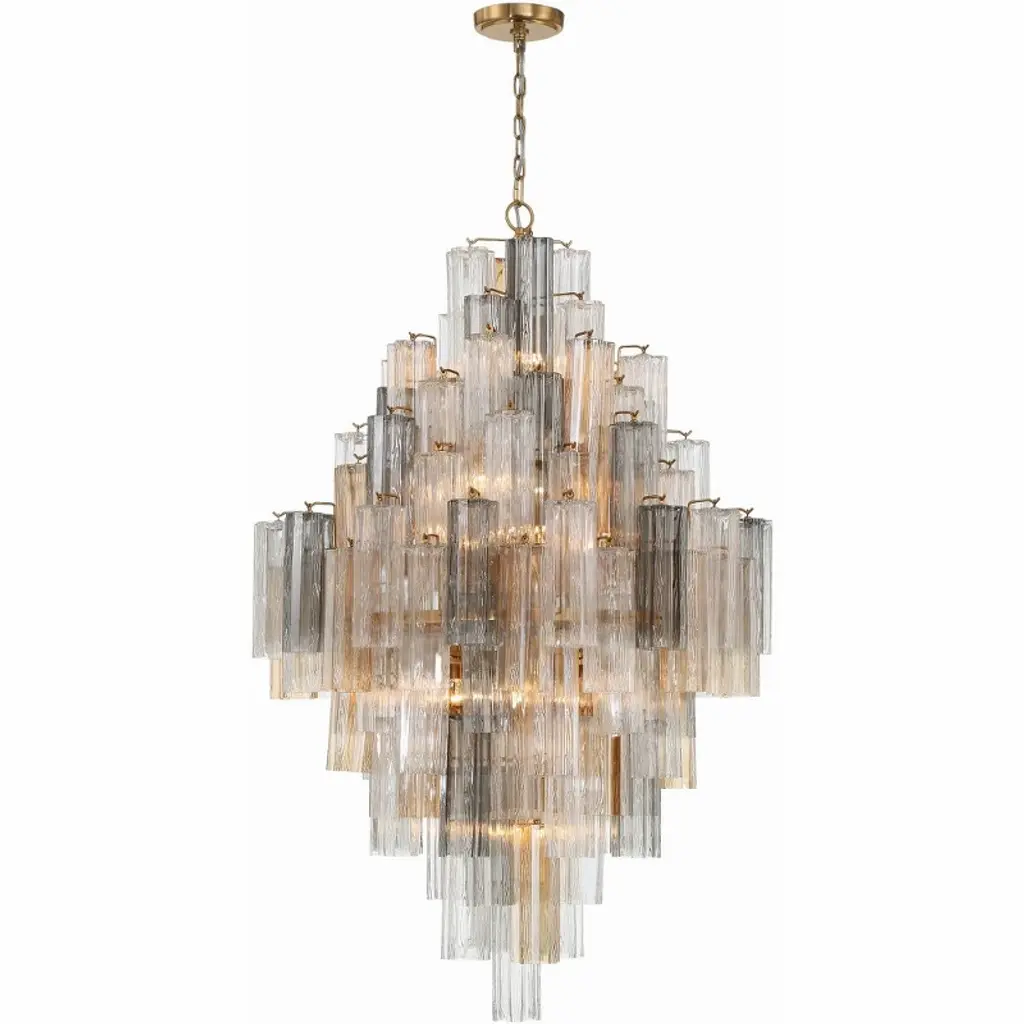 The Lorelei Chandelier from Visual Comfort Signature, formerly known as Visual Comfort, fills out the space overhead with an arresting composition of sculptural glass and a shimmering light. This grand piece proves ideal in open spaces like the foyer or living room. Its sense of scale grabs one’s attention. Crafted from metal, the chandelier’s framework cascades in elegant tiers. The fluted glass forms fix to the framework with a floating visual. The long striations and the flared curves of the glass forms lead the eyes down. Golden light textures up the glass with highlights, translating to a radiant, surrounding glow.