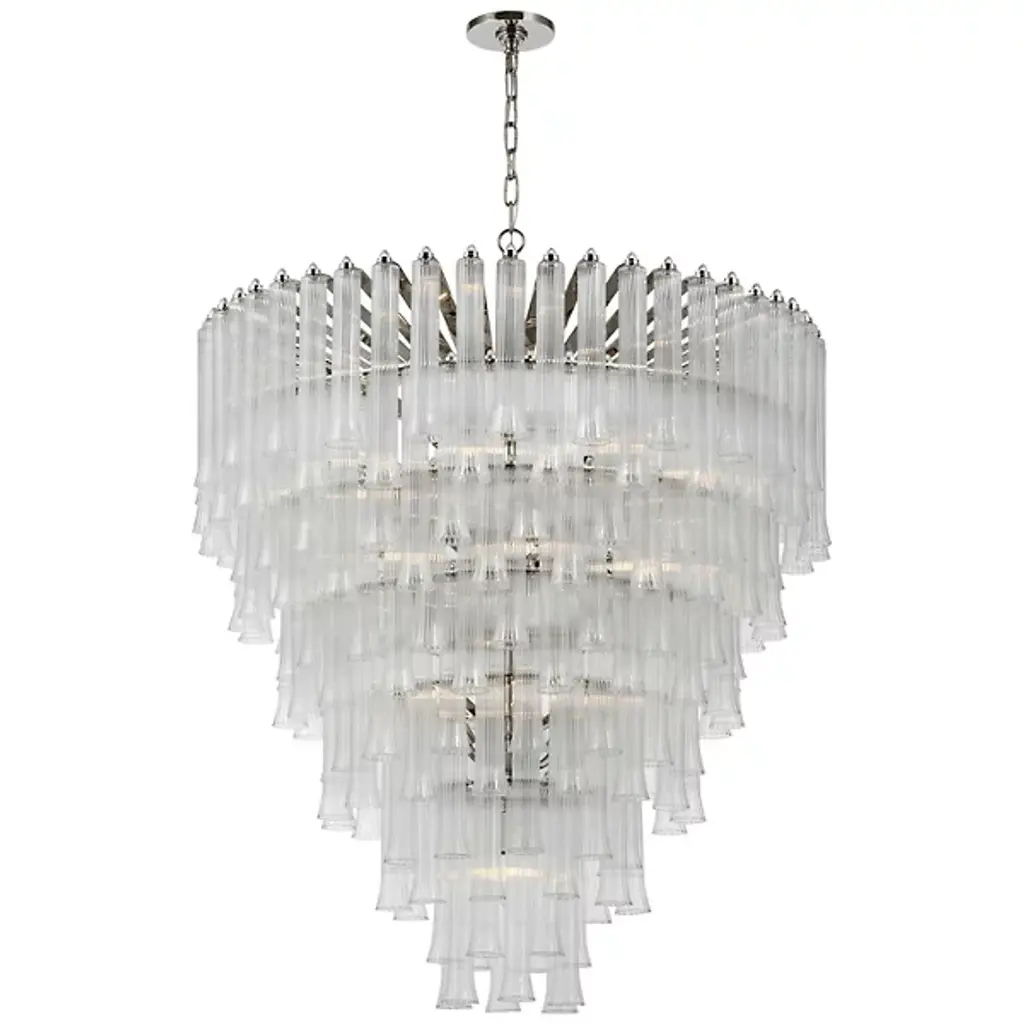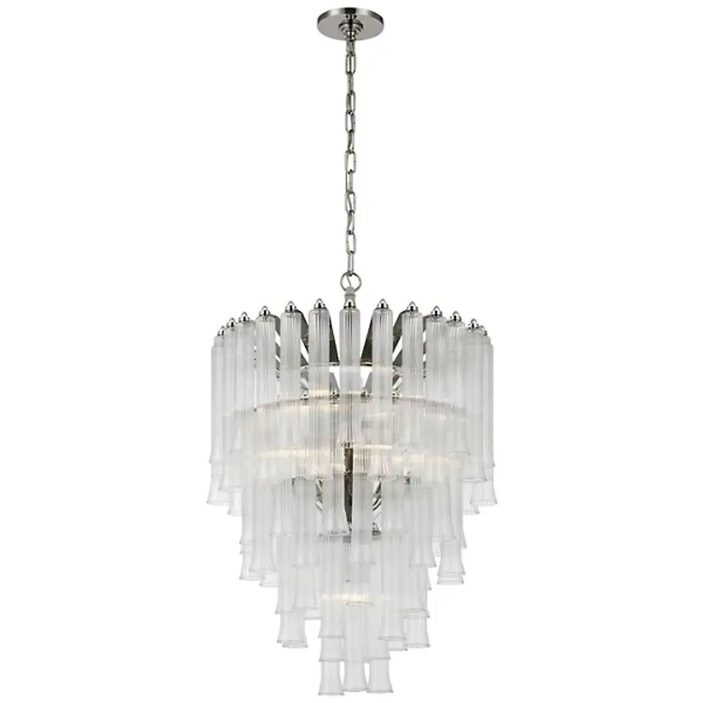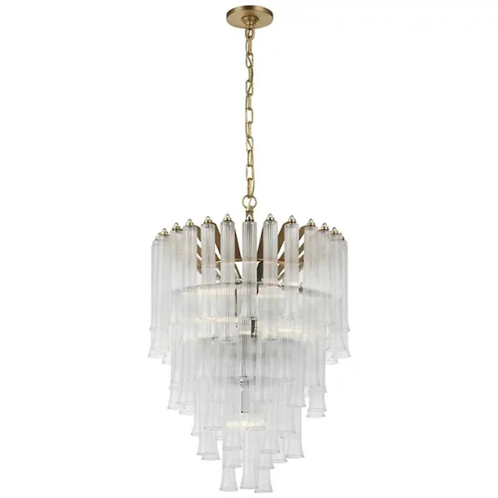 A stylish layered structure with enduring vintage appeal. Retained by a sleek circular canopy, the Lorelei Waterfall Chandelier from Visual Comfort Signature, formerly known as Visual Comfort, descends along a robust, medium-weight chain, seating several layers of damp-listed candelabra-style lamping beneath a complex shade structure below. A series of angular arms flares out around the lamping, each one dropping a single clear glass cylinder with fluted sides that flares out at its lower end, creating a stylized floral presence that reduces glare from the sides taking on a stylish inner glow.