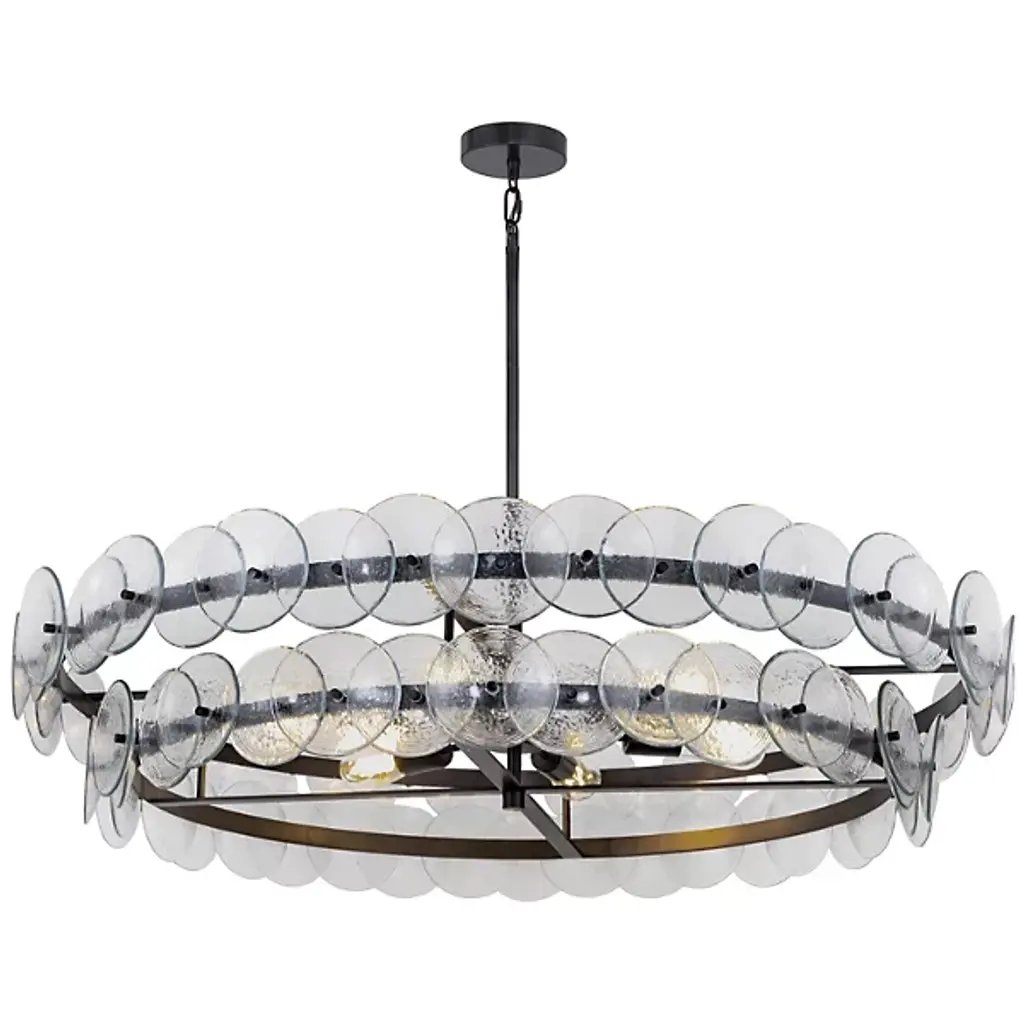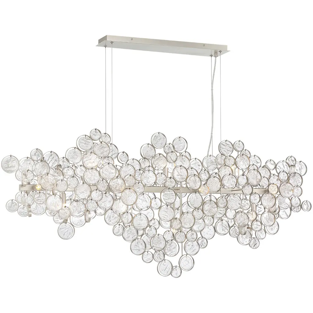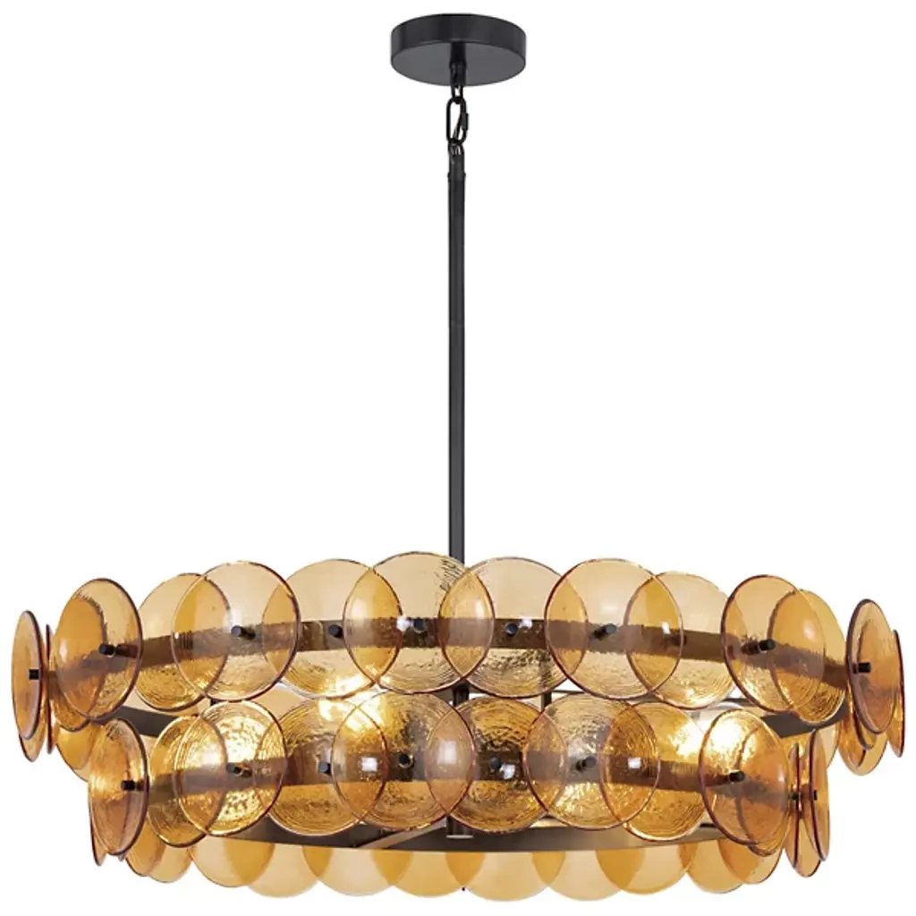 The Loren Chandelier from Maxim Lighting showcases a captivating design with overlapping handmade pressed glass disks inspired by Mid-Century Italian aesthetics. The textured glass diffuses light beautifully, creating a warm and inviting ambiance. The chandelier is mounted on sleek metal frames and adds a personalized touch to any room. Perfect for dining areas or living spaces, the Loren Chandelier blends style and functionality, elevating the overall décor of your home.