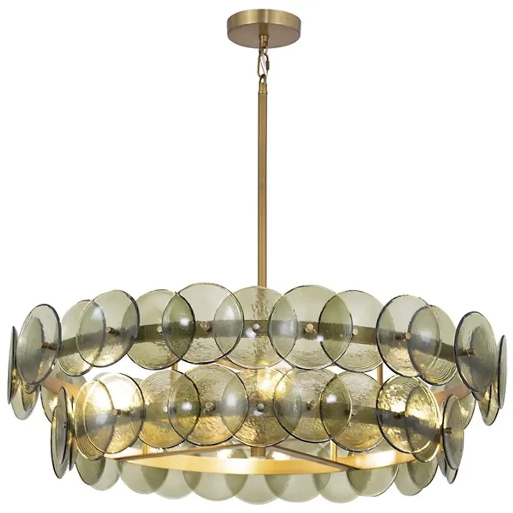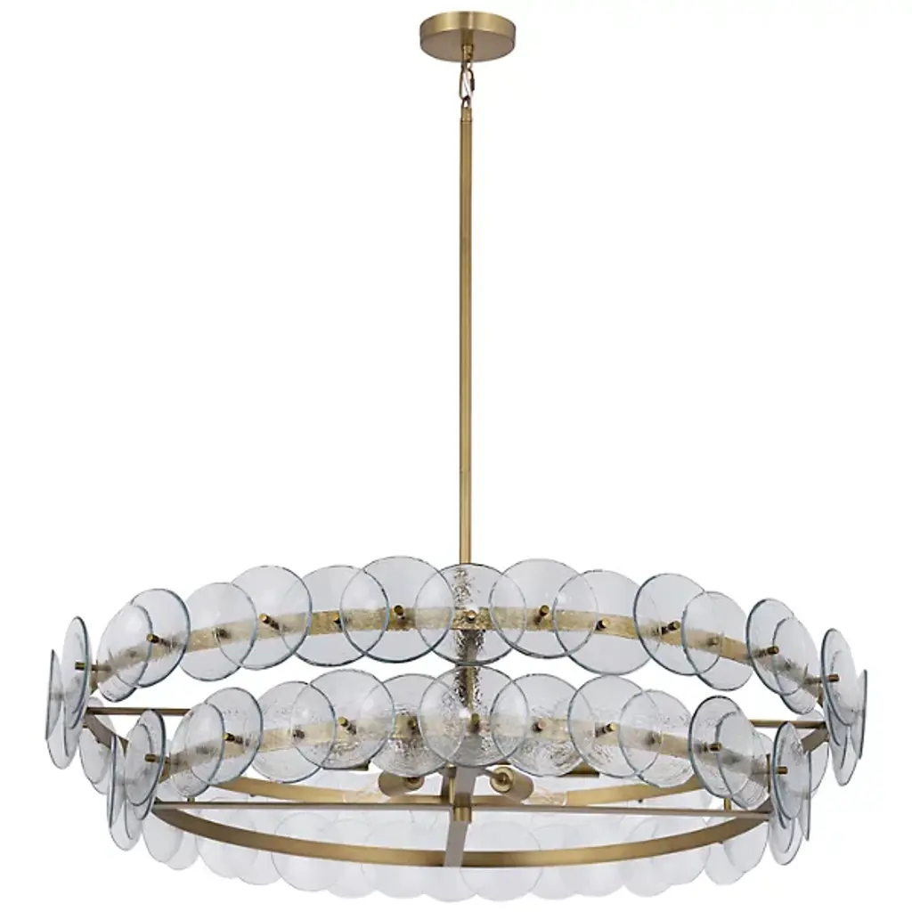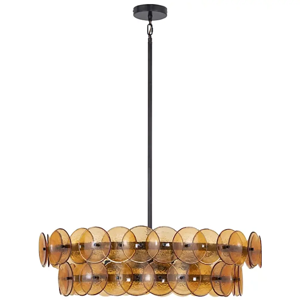 The Loren Chandelier from Maxim Lighting showcases a captivating design with overlapping handmade pressed glass disks inspired by Mid-Century Italian aesthetics. The textured glass diffuses light beautifully, creating a warm and inviting ambiance. The chandelier is mounted on sleek metal frames and adds a personalized touch to any room. Perfect for dining areas or living spaces, the Loren Chandelier blends style and functionality, elevating the overall décor of your home.