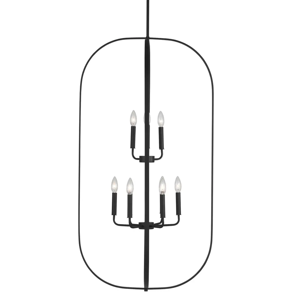 Inset candles framed in contemporary rounded edge forms bring abundance and scale to the Loretto lanterns. Available in 3-, 4-, 6- and 9-light 2-tiered options, Loretto can be placed in open foyers and airy dining spaces across a range of interior design genres. Midnight black, satin brass, and brushed steel finishes are versatile and functional.