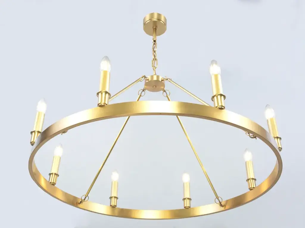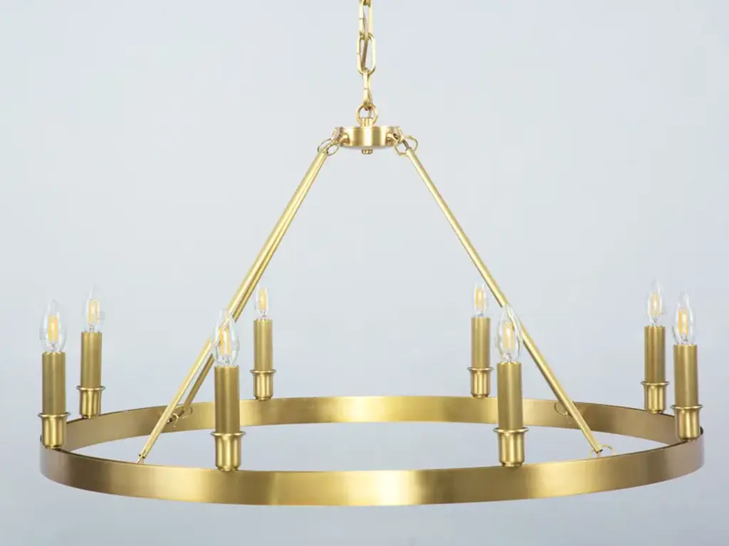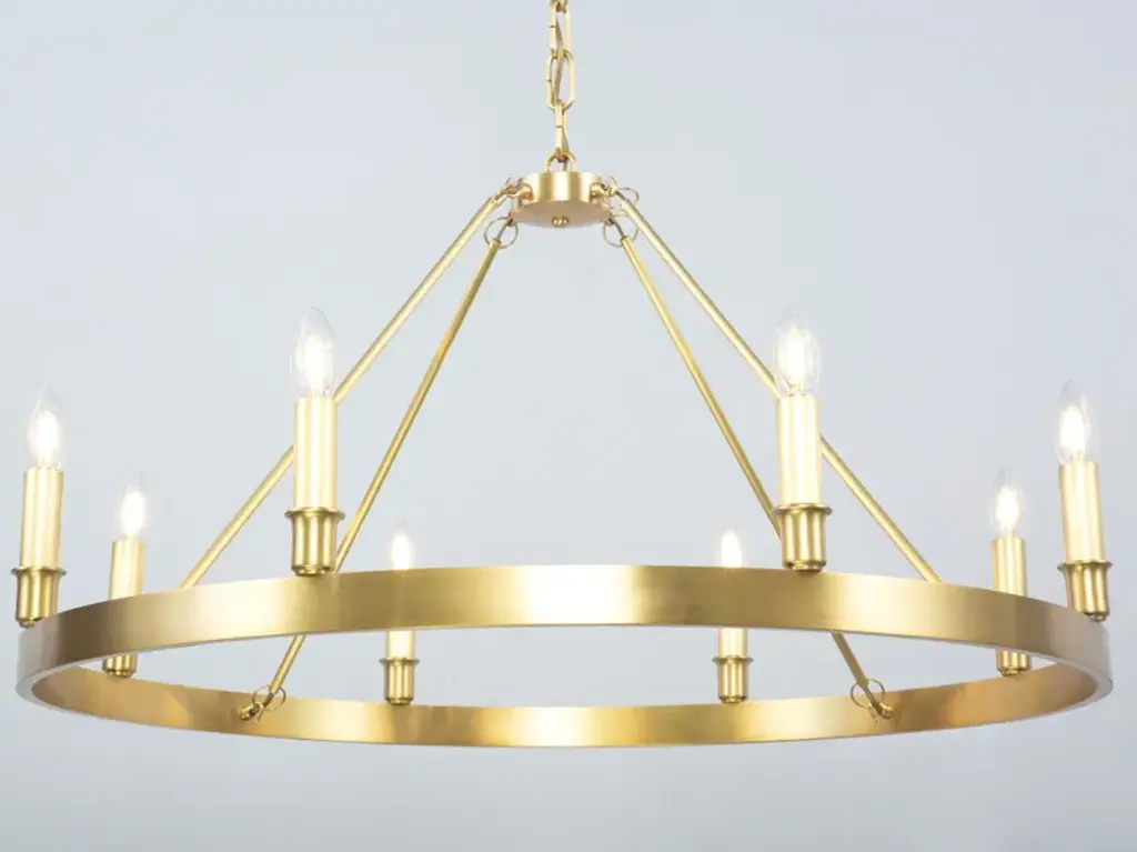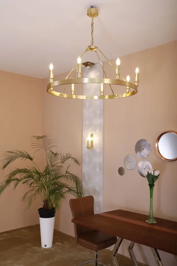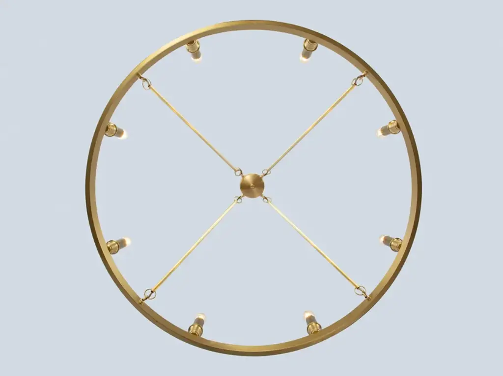 LOS ANGELES PENDANT 90 is a brass chandelier from the LOS ANGELES collection by Petinas Lighting. This pendant was designed in the manner of Spanish colonial style – a timeless and classic shape based on the car wheel we used to see in western film saloons. This one of course is a refined version suitable for a dining room or living area. It can be paired with bold, modern and traditional furniture as well. The Los Angeles pendant lamp is available in a wide range of finishes, all designed to compliment the room in question.Finish: antique, polished brass, matte brass, polished nickel, matte nickelLight source: 8 x 60W E14Material: brassPatinas polished brass lamps will slightly darken over the years (this depends on the humidity of the space – roughly 5-10 years). Matt brass is an elegant golden colour; this brushed and polished brass surface offers a touch of class to any interior wall which it adorns. Shiny nickel the brass lamp is nickelled to give that bright clean feeling. Matt nickel refined low-key silver colour, the polished (shiny) nickel surface is brushed allowing for a softer more gentle look to create an understated ambience.