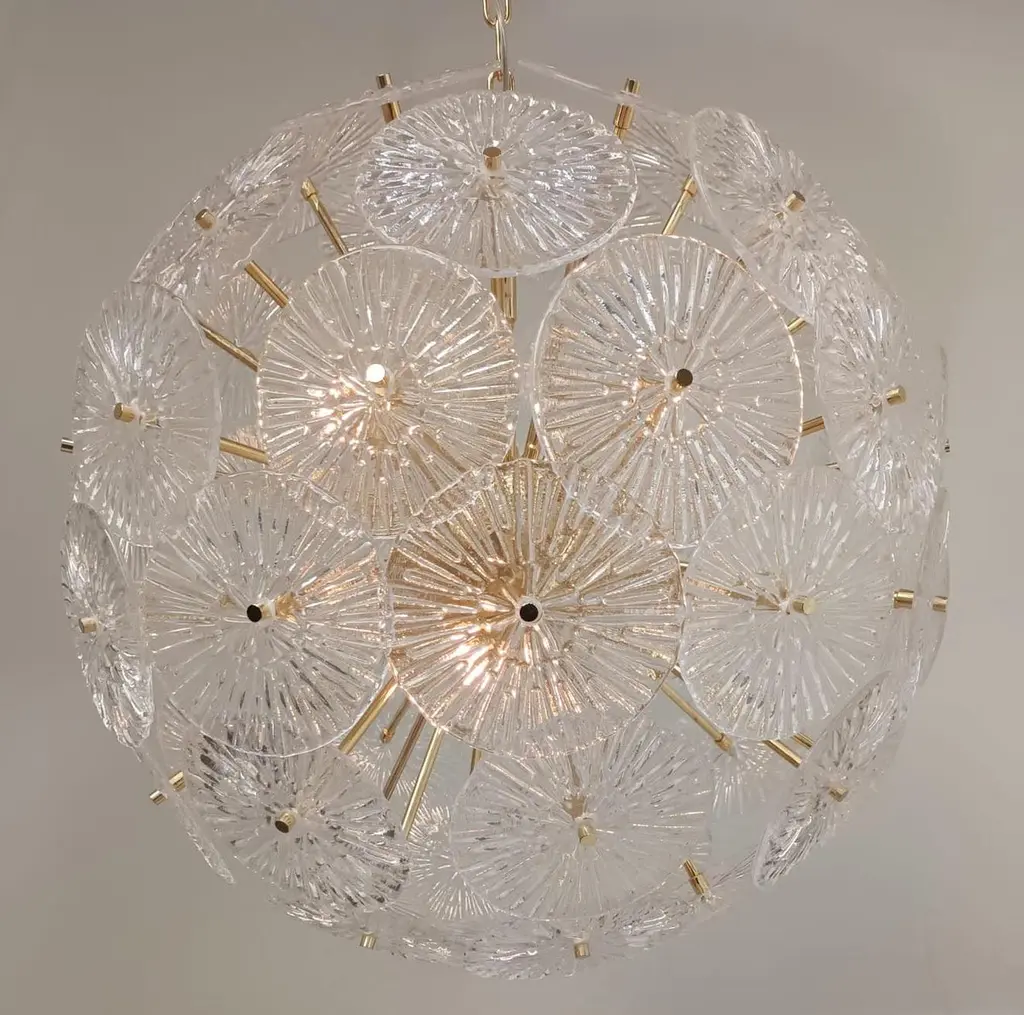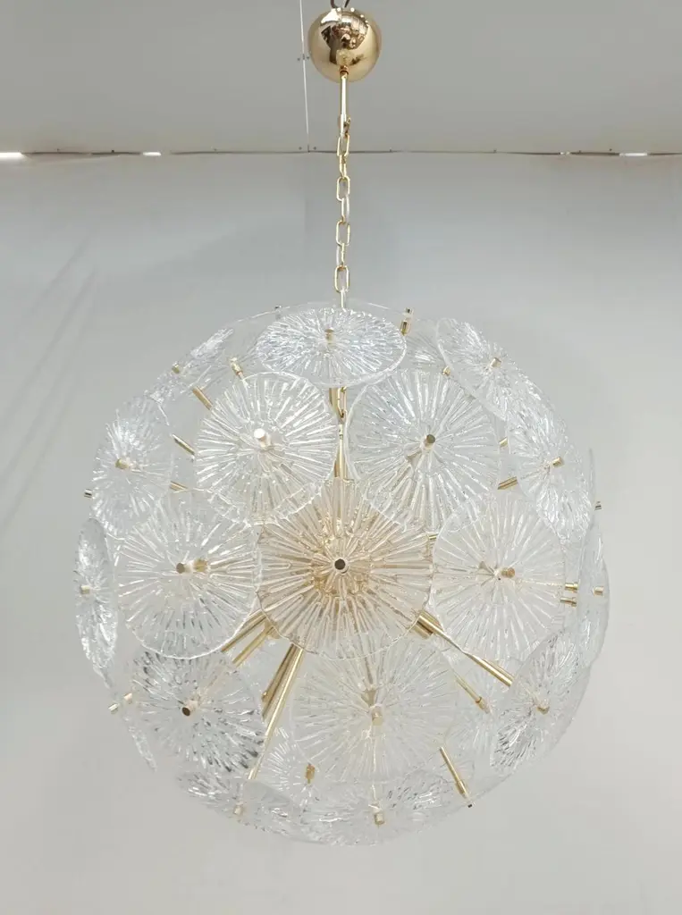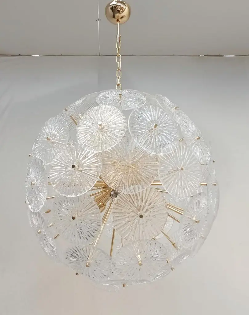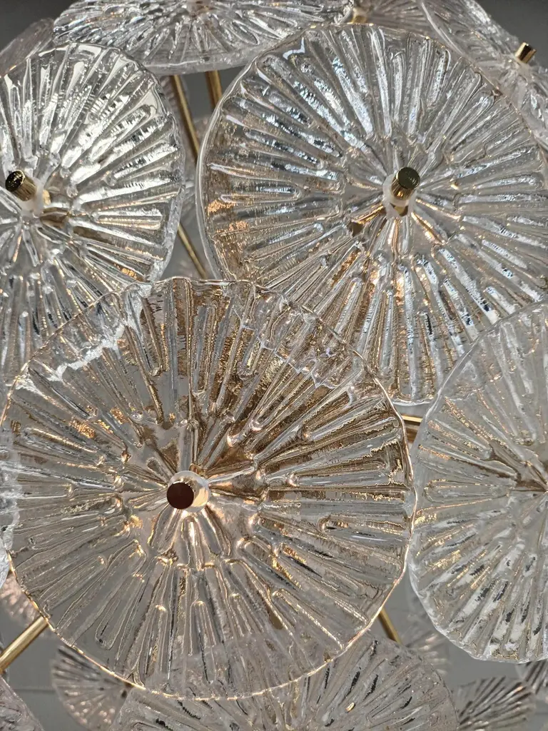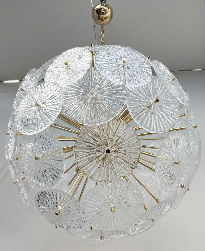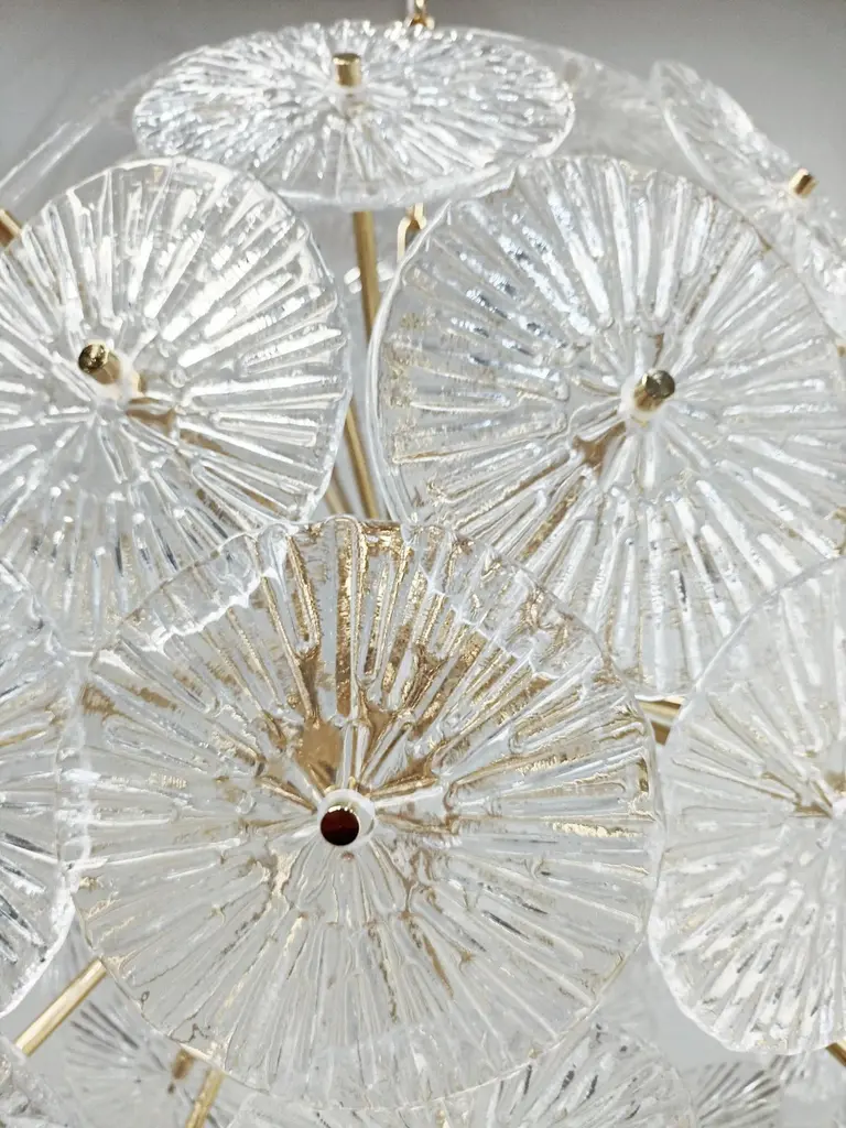 Italian sputnik chandelier with clear textured Murano glass discs, mounted on 24-karat gold-plated metal frame / designed by Fabio Bergomi for Fabio Ltd / Made in ItalyMeasures: diameter 27.5 inches, height 27.5 inches, total height 47 inches including chain and canopy6 lights / E12 or E14 type / max 40W eachOrder only / this item ships from ItalyOrder reference #: FABIOLTD C819