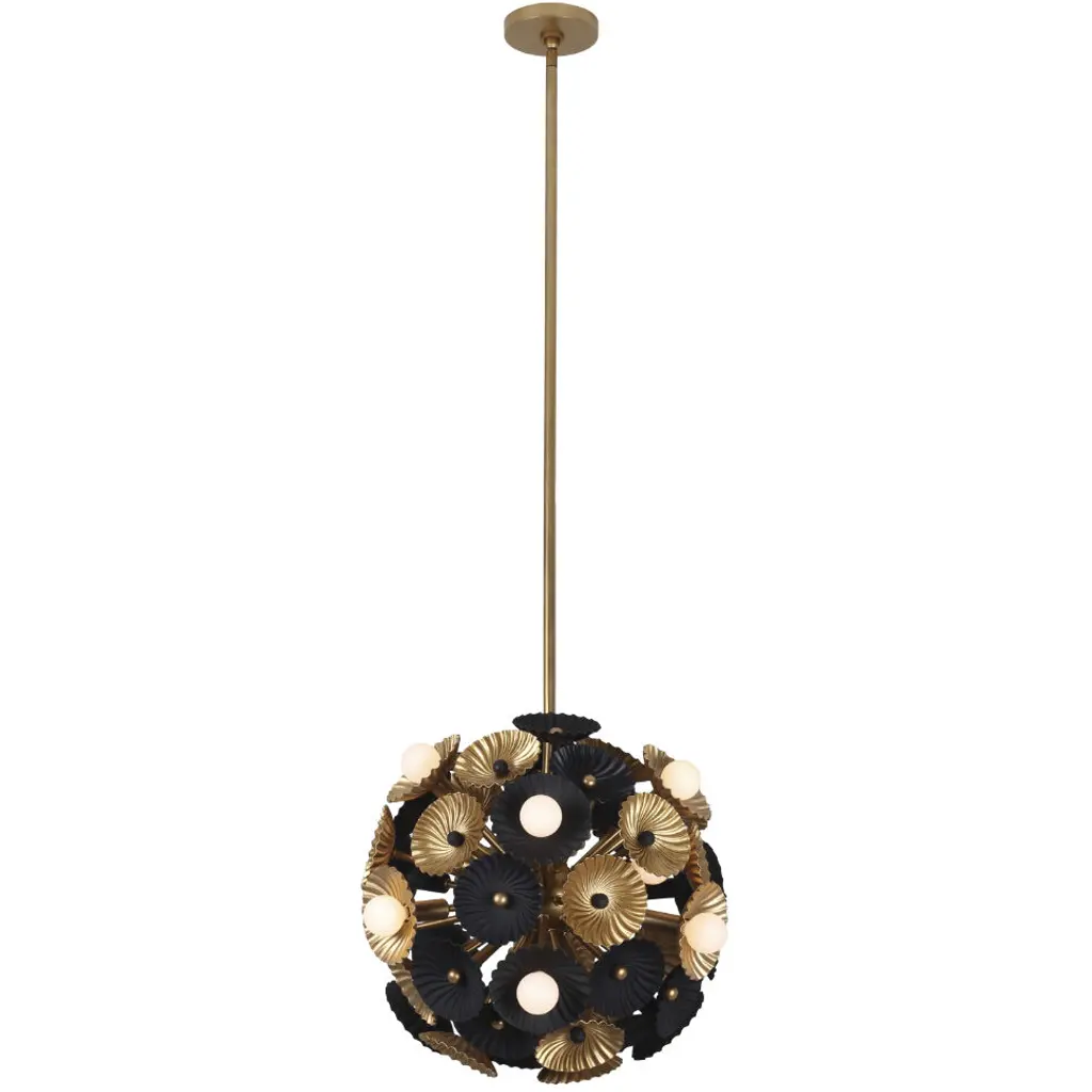 The Lotus Chandelier by Hudson Valley Lighting is a poetic, contemporary design that adds a bright and decorative touch to spaces. The flowering form of this chandelier is composed of teardrop-shaped metal panels layered together, each on the end of a curved stem attached by a contrasting panel, for an elegant piece with a lovely two-tone finish. Cradling a candelabra within each petal, this piece offers an even layer of illumination to spaces that also highlights the romantic, blooming form that brings a graceful touch to rooms.