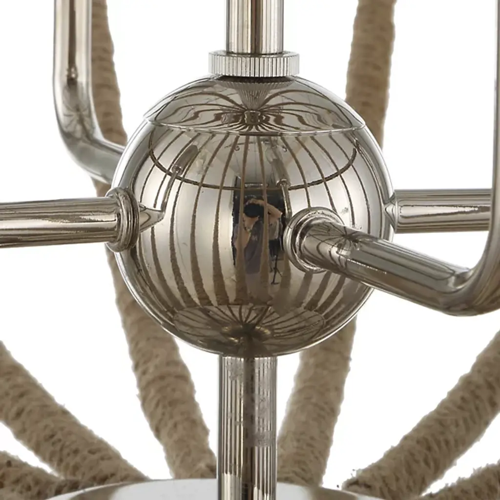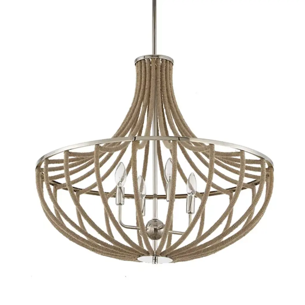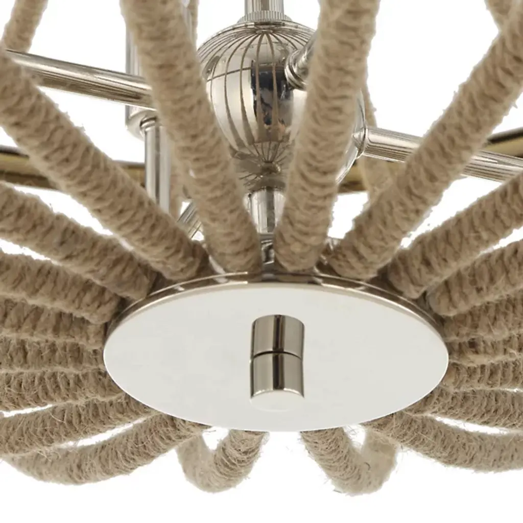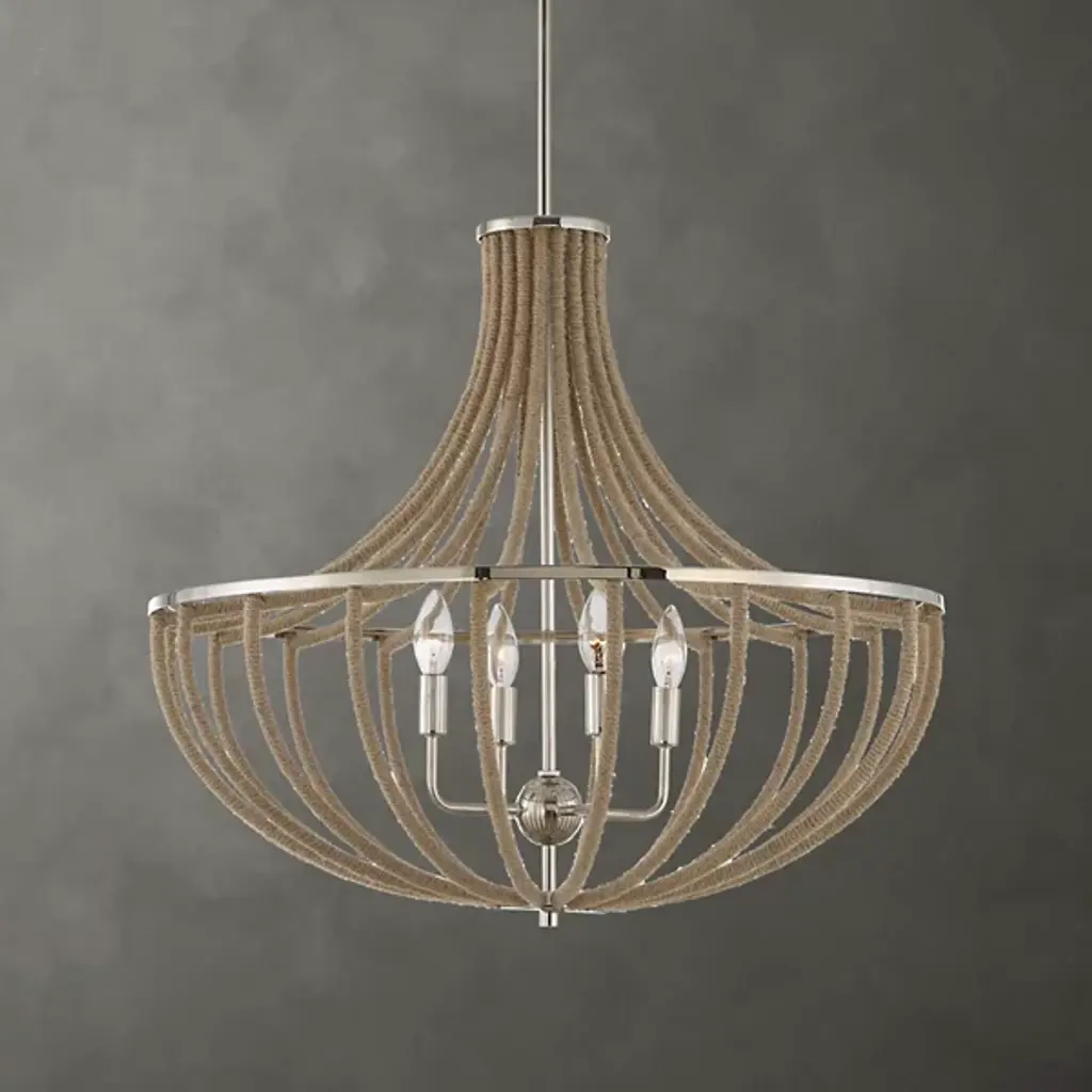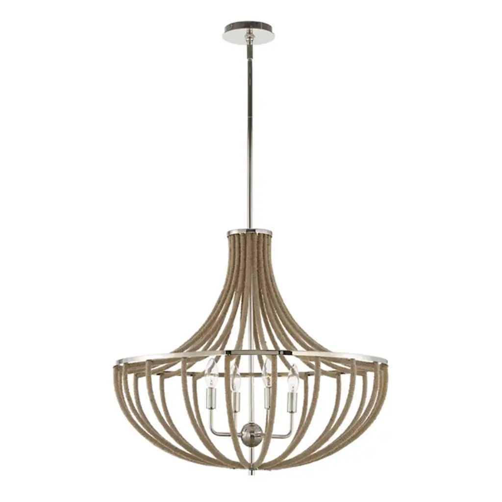 The Lovelock Chandelier from Uttermost pairs classical empire proportions with nautical rope detailing under Sergio Orozco Designs' creative direction. Natural twisted rope wraps around the metal framework, softening geometric structure with organic texture. Four candelabra lights emerge from the rope-bound cage, creating balanced illumination throughout. The design references traditional maritime lanterns while maintaining refined proportions for interior spaces. This rope wrapping technique adds tactile interest to the architectural frame, demonstrating how natural materials transform classical lighting forms into approachable pieces.