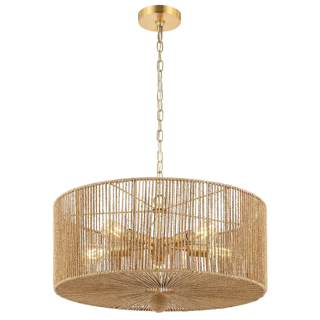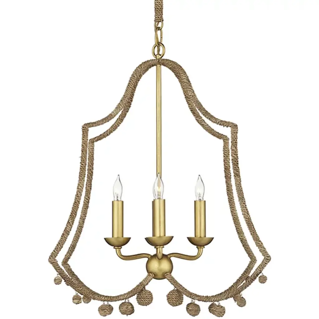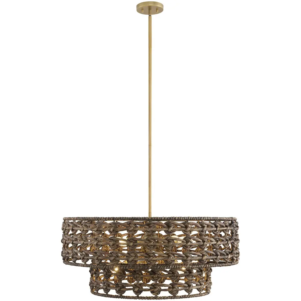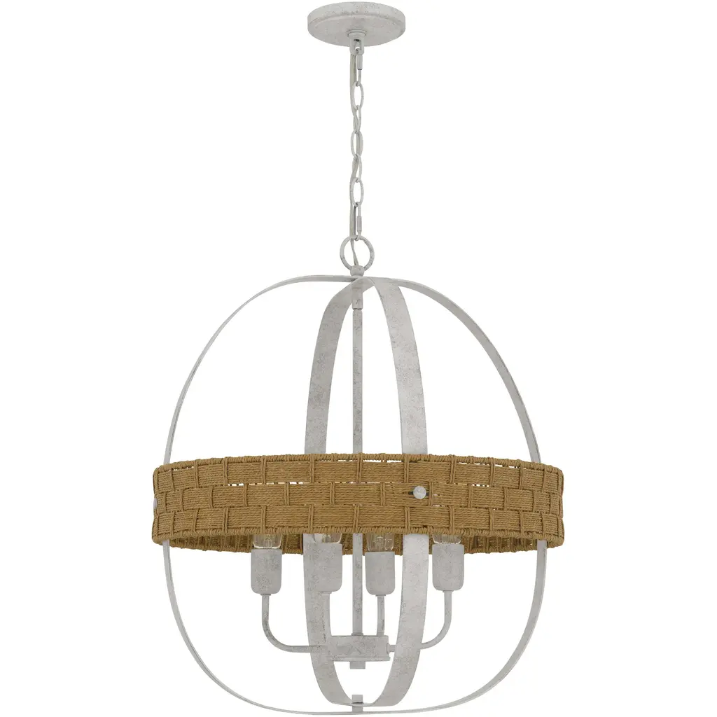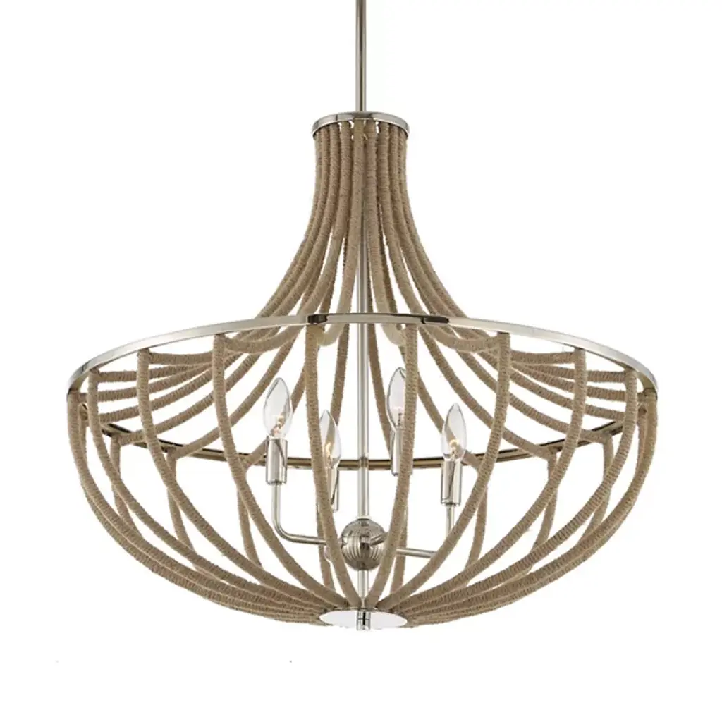 The Lovelock Chandelier from Uttermost pairs classical empire proportions with nautical rope detailing under Sergio Orozco Designs' creative direction. Natural twisted rope wraps around the metal framework, softening geometric structure with organic texture. Four candelabra lights emerge from the rope-bound cage, creating balanced illumination throughout. The design references traditional maritime lanterns while maintaining refined proportions for interior spaces. This rope wrapping technique adds tactile interest to the architectural frame, demonstrating how natural materials transform classical lighting forms into approachable pieces.