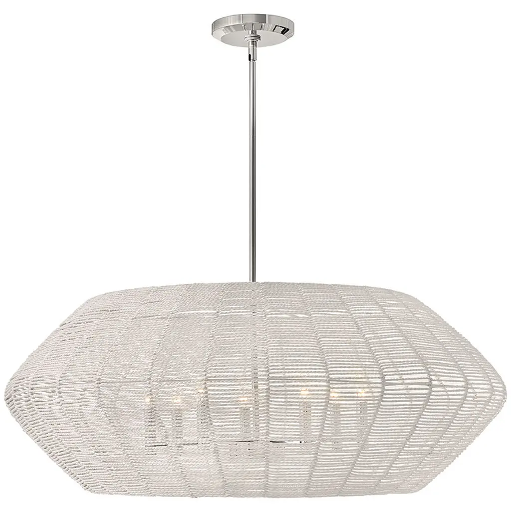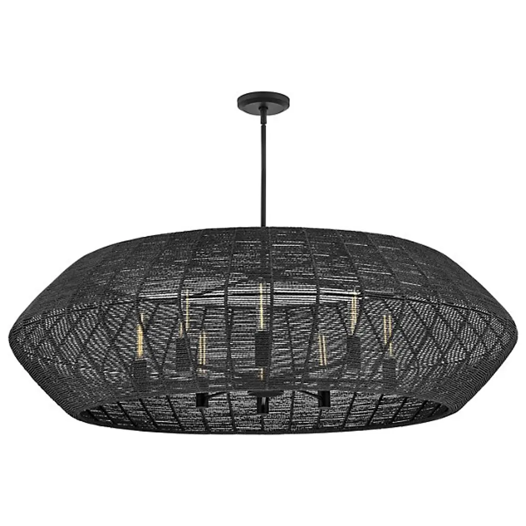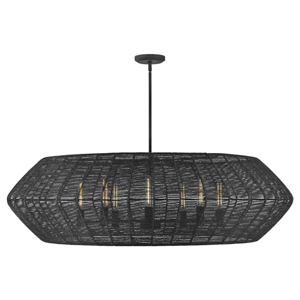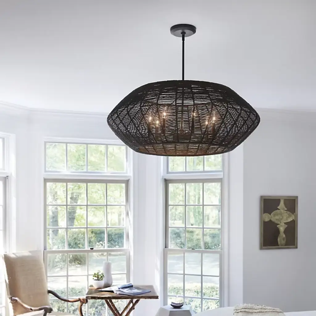 Accentuate your indoor spaces with the clever coastal stylings of the Luca Chandelier from Hinkley Lighting. Starting simply by suspending a conventional candelabra structure from a beveled steel disc canopy and single stem, the steel structure is then set inside a round, angled shade of woven rattan. Best used with vintage-style bulbs for that traditional touch, this elegant arrangement blunts direct brightness from the sides while scattering a gently glowing layer of ambient light around it.