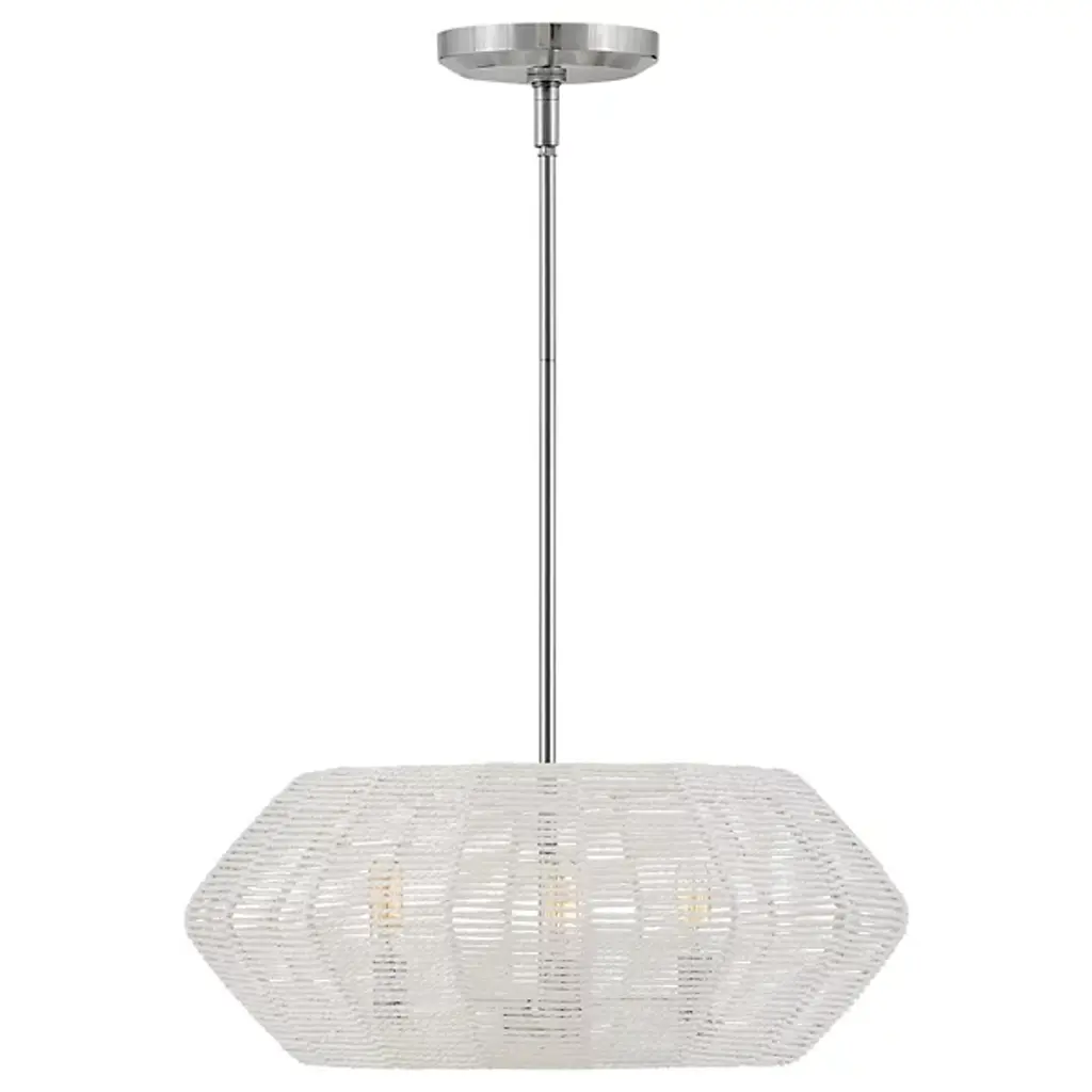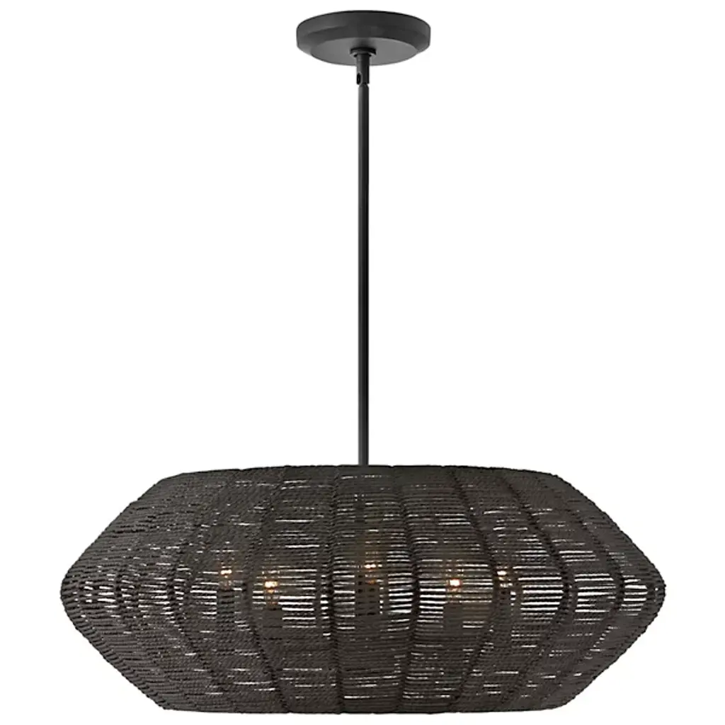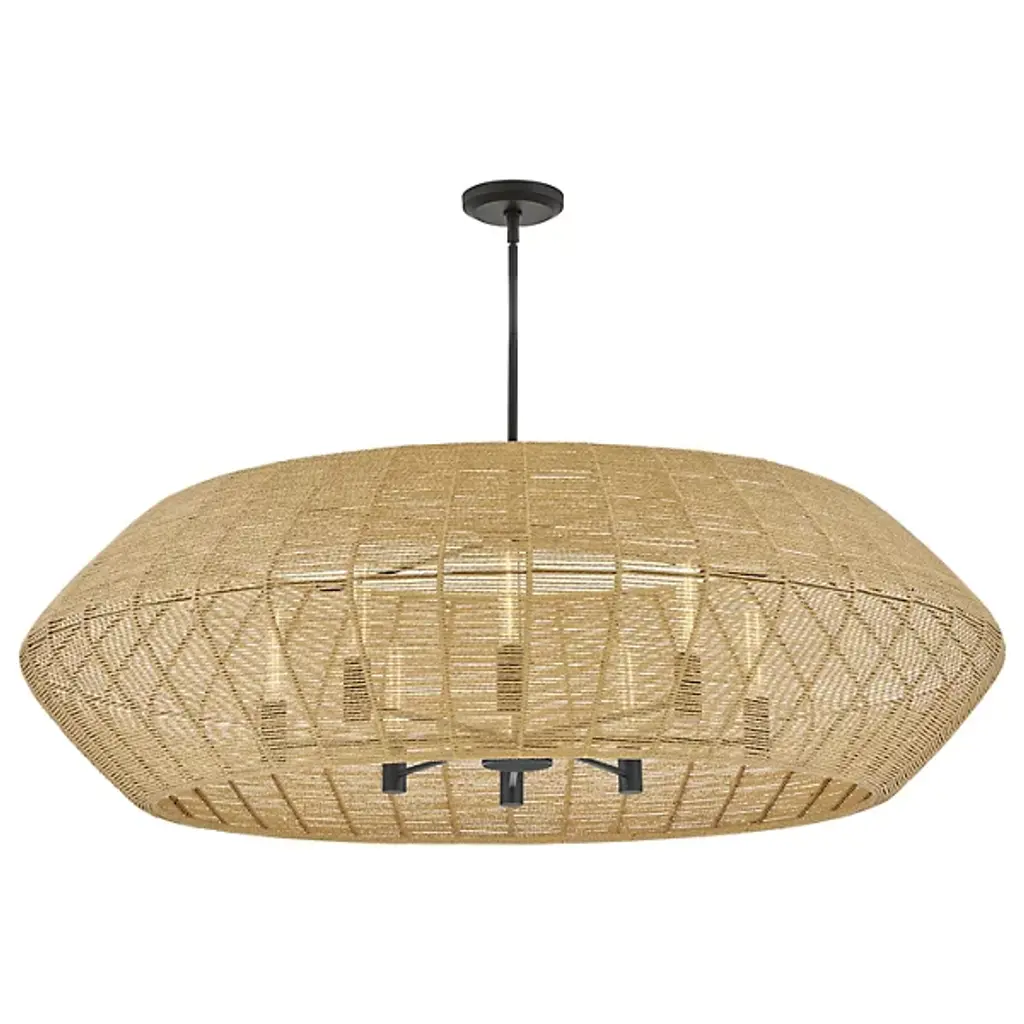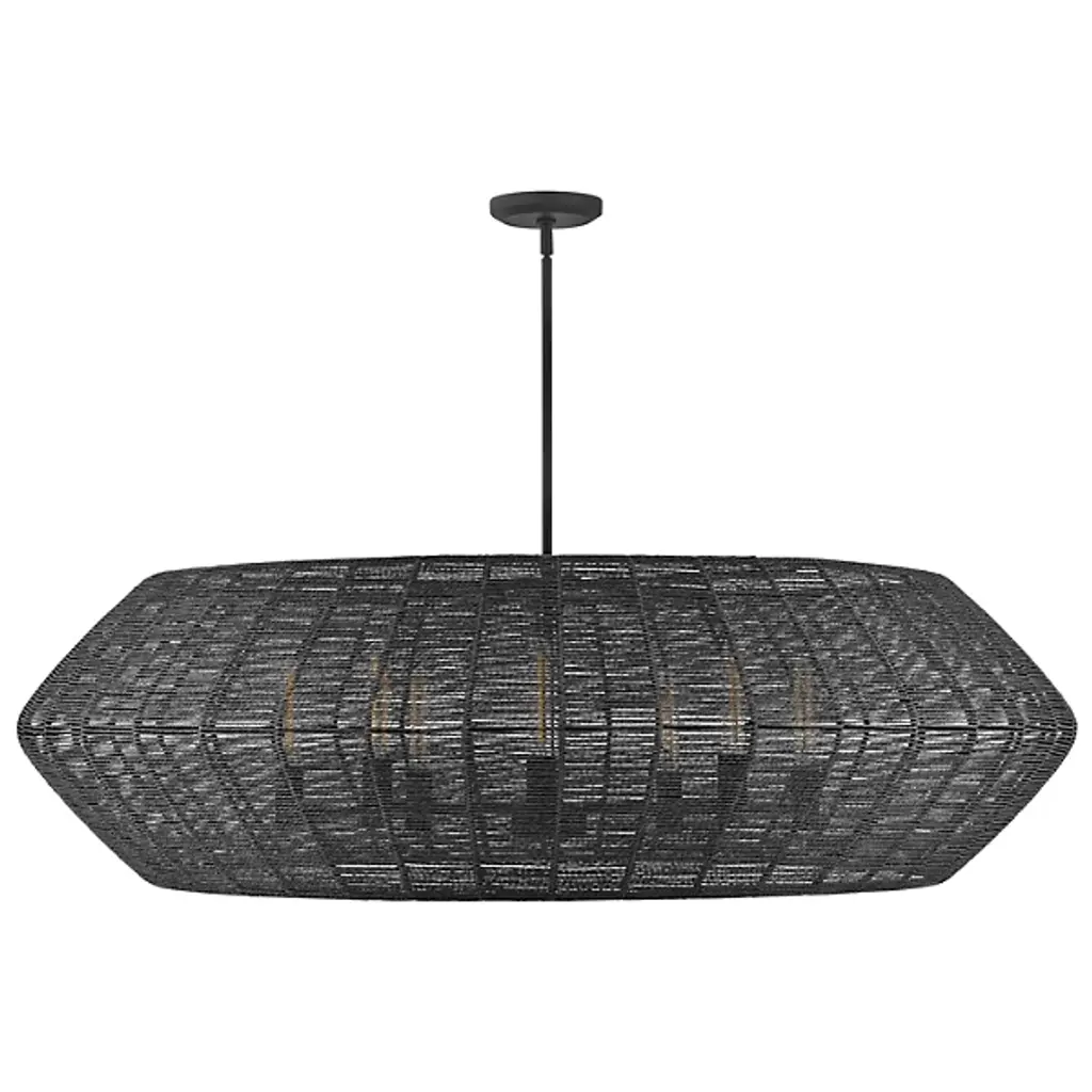 Accentuate your indoor spaces with the clever coastal stylings of the Luca Chandelier from Hinkley Lighting. Starting simply by suspending a conventional candelabra structure from a beveled steel disc canopy and single stem, the steel structure is then set inside a round, angled shade of woven rattan. Best used with vintage-style bulbs for that traditional touch, this elegant arrangement blunts direct brightness from the sides while scattering a gently glowing layer of ambient light around it.