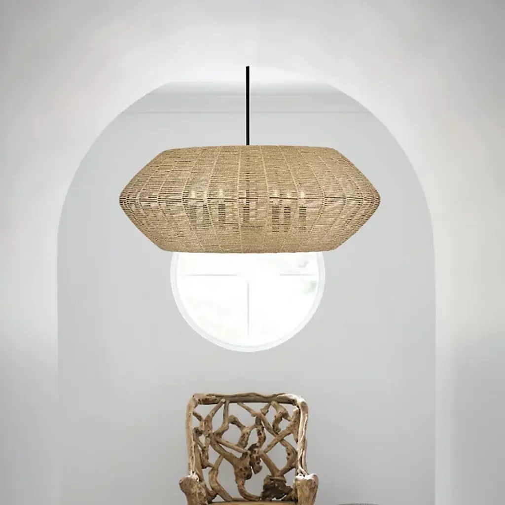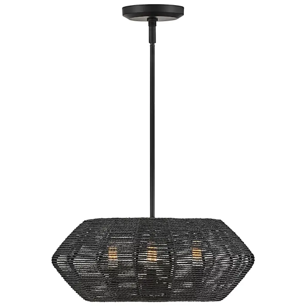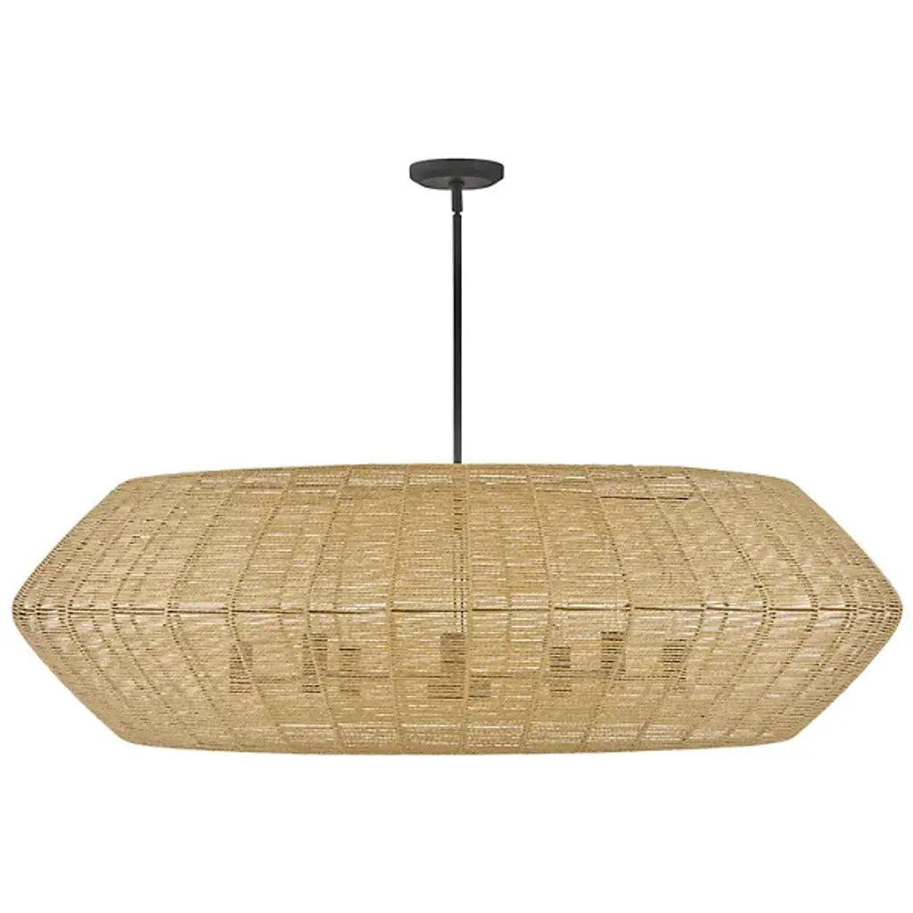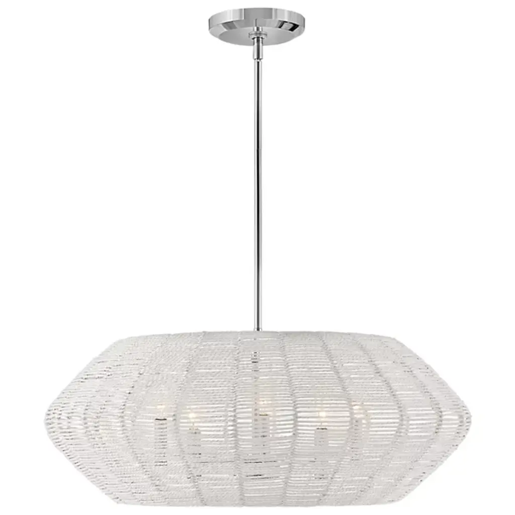 Accentuate your indoor spaces with the clever coastal stylings of the Luca Chandelier from Hinkley Lighting. Starting simply by suspending a conventional candelabra structure from a beveled steel disc canopy and single stem, the steel structure is then set inside a round, angled shade of woven rattan. Best used with vintage-style bulbs for that traditional touch, this elegant arrangement blunts direct brightness from the sides while scattering a gently glowing layer of ambient light around it.