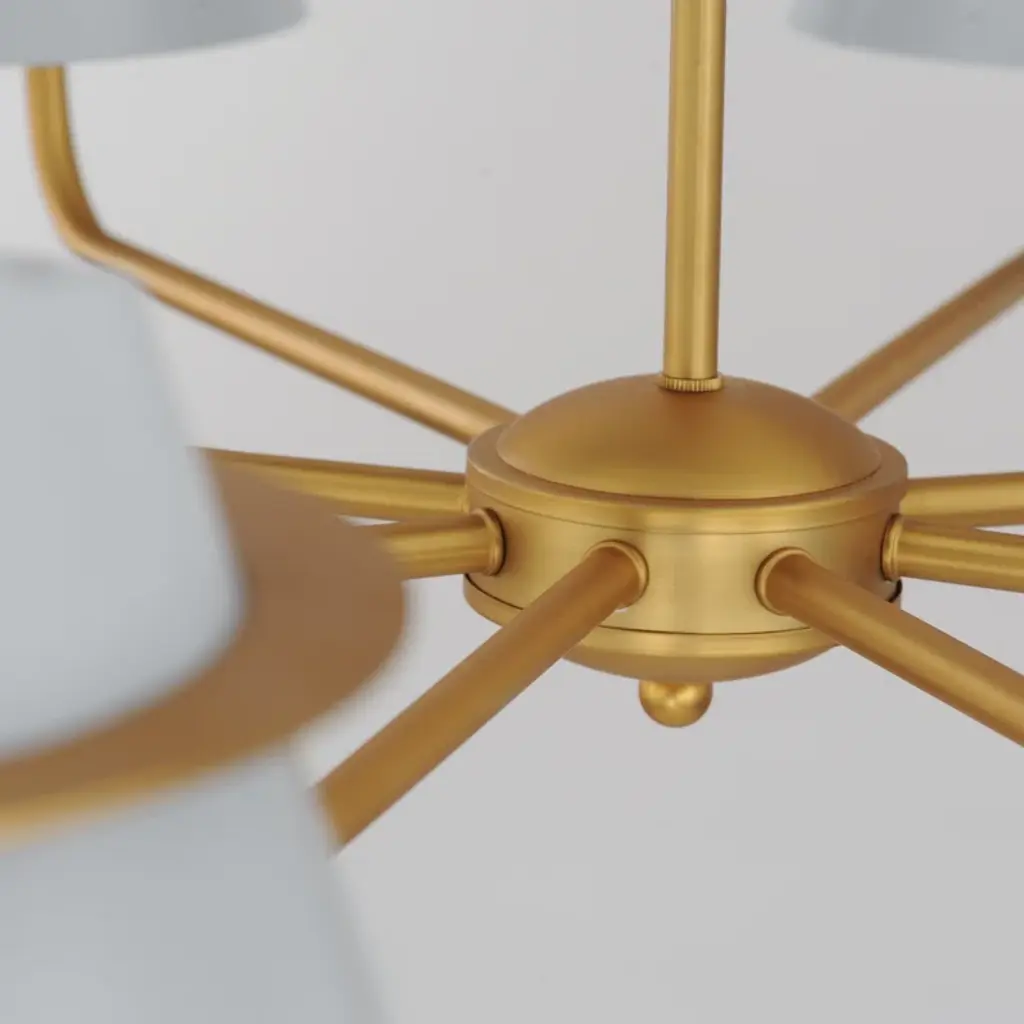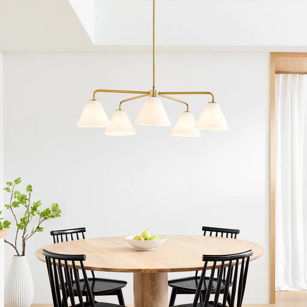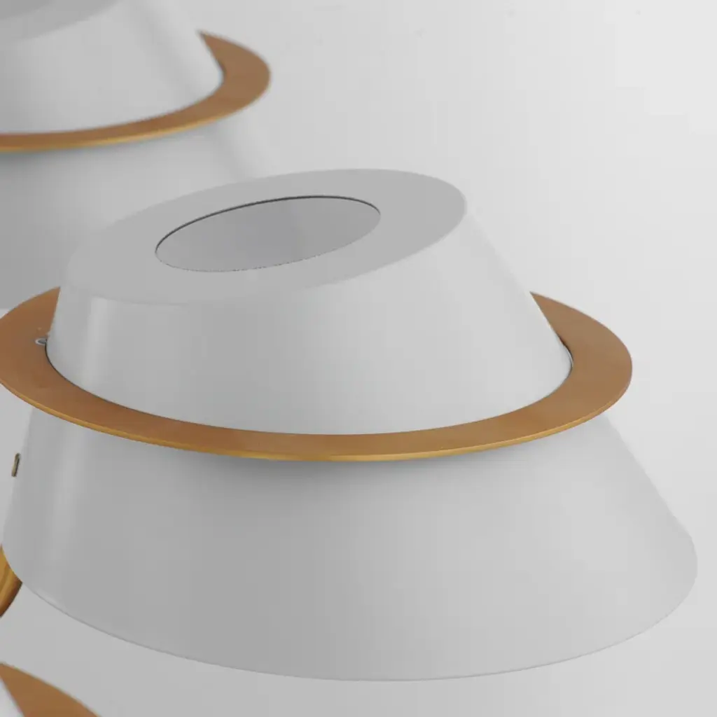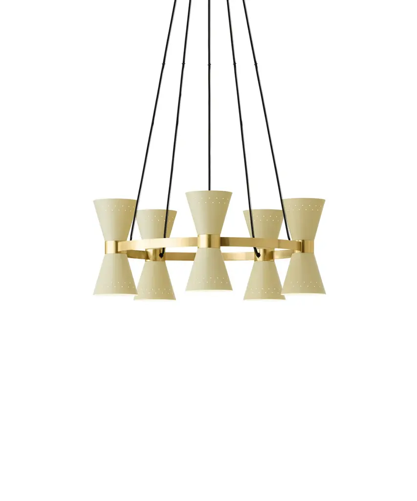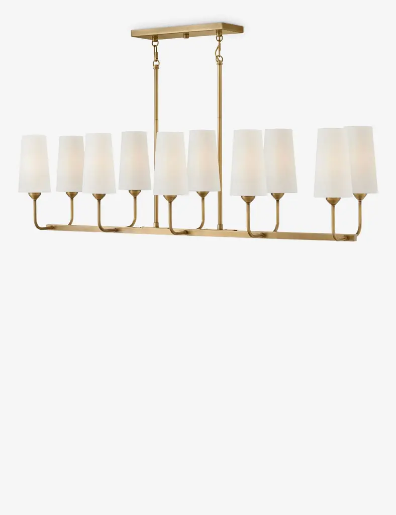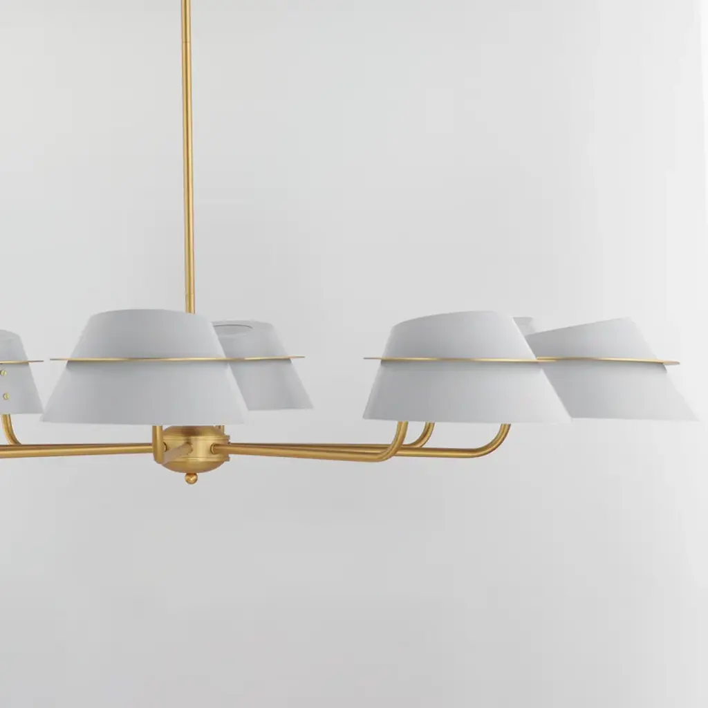 Metal shades of light French gray are suspended from halos of natural aged brass. Maximizing the light output, the interior of the shades are painted white and their tops are left open casting light both upwards and below. The collection is completed by a delightful pull-chain operated wall sconce that provides a practical light source ideal for a reading nook or bedside.