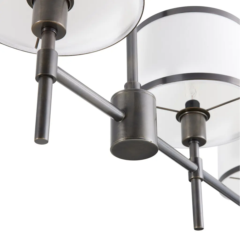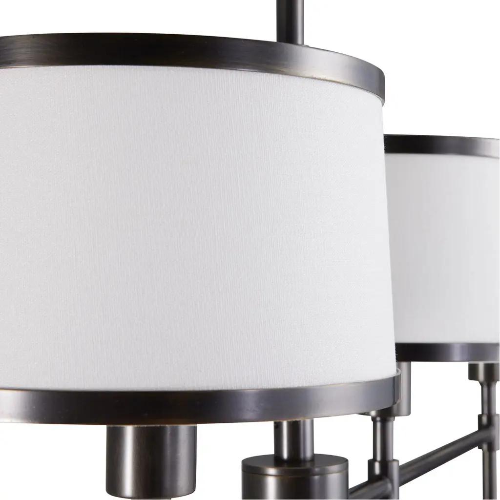 Harnessing traditional elements, the Luciano is a modern classic. A bronze steel linear frame presents five lights, each topped with a white linen shade with a matching bronze band that trims the tops and bottoms of each shade. Additional pipe available (PIPE-486). Damp-rated, although limited covered outdoor areas may affect finish.