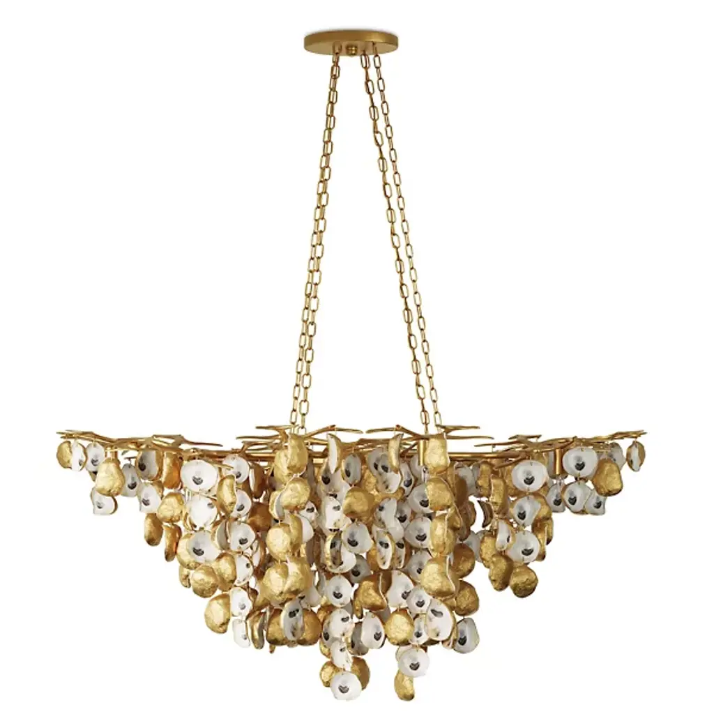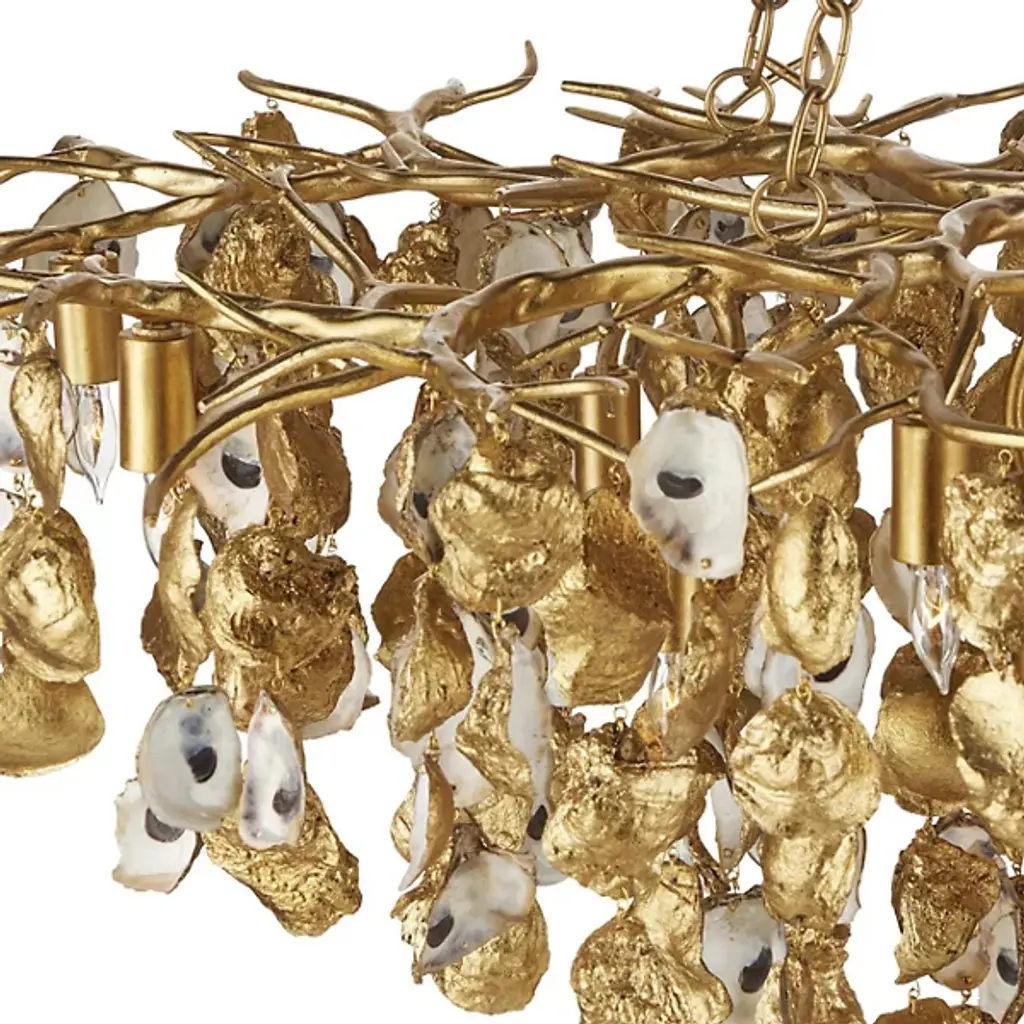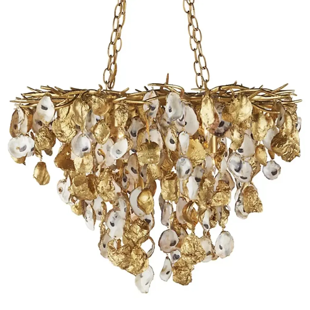 The Lucullan Chandelier from Currey & Company turns nature's humble oyster shells into a spellbinding overhead display. Each shell tells its own story while contributing to the chandelier's organic movement. The implied oval shape of this arrangement allows the shells to catch and reflect light in countless directions. Connected by strong metal chains, this distinctive lighting piece brings raw natural elements indoors. The mixture of materials - shells and metal - creates an unexpected yet harmonious dialogue between sea and structure.