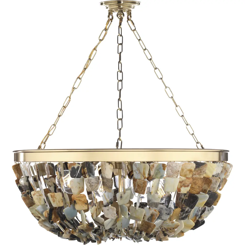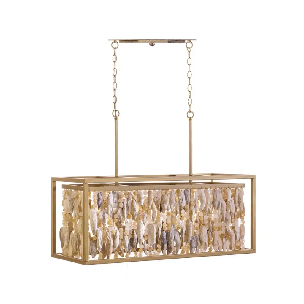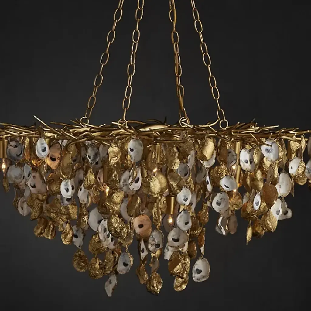 The Lucullan Chandelier from Currey & Company turns nature's humble oyster shells into a spellbinding overhead display. Each shell tells its own story while contributing to the chandelier's organic movement. The implied oval shape of this arrangement allows the shells to catch and reflect light in countless directions. Connected by strong metal chains, this distinctive lighting piece brings raw natural elements indoors. The mixture of materials - shells and metal - creates an unexpected yet harmonious dialogue between sea and structure.
