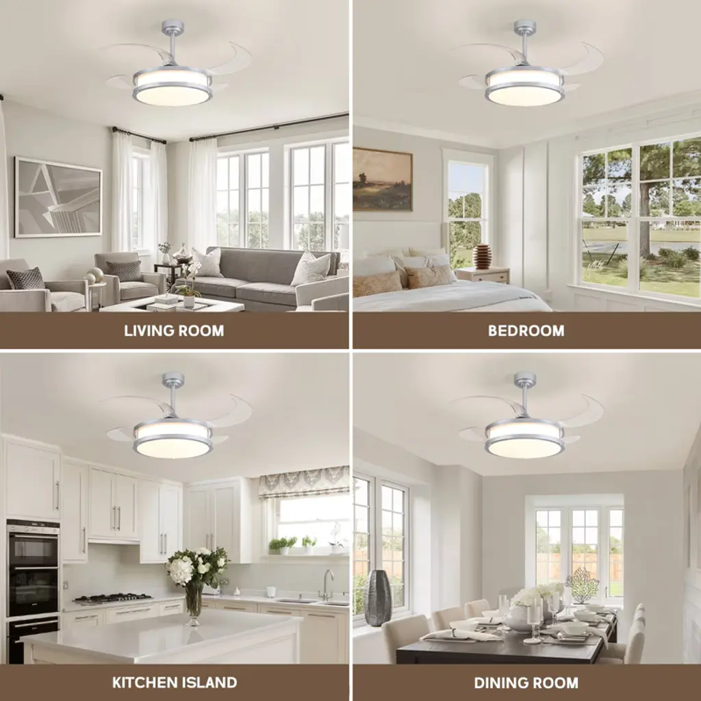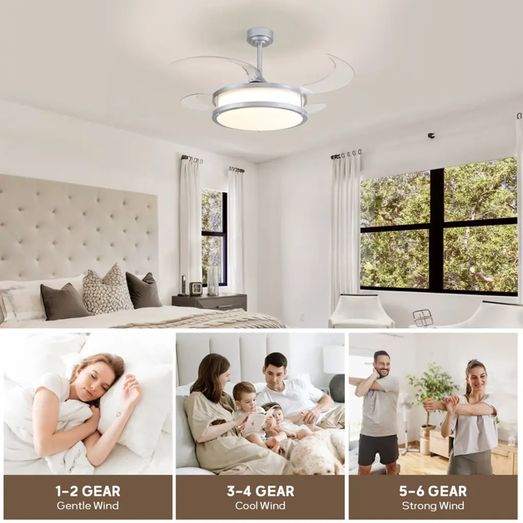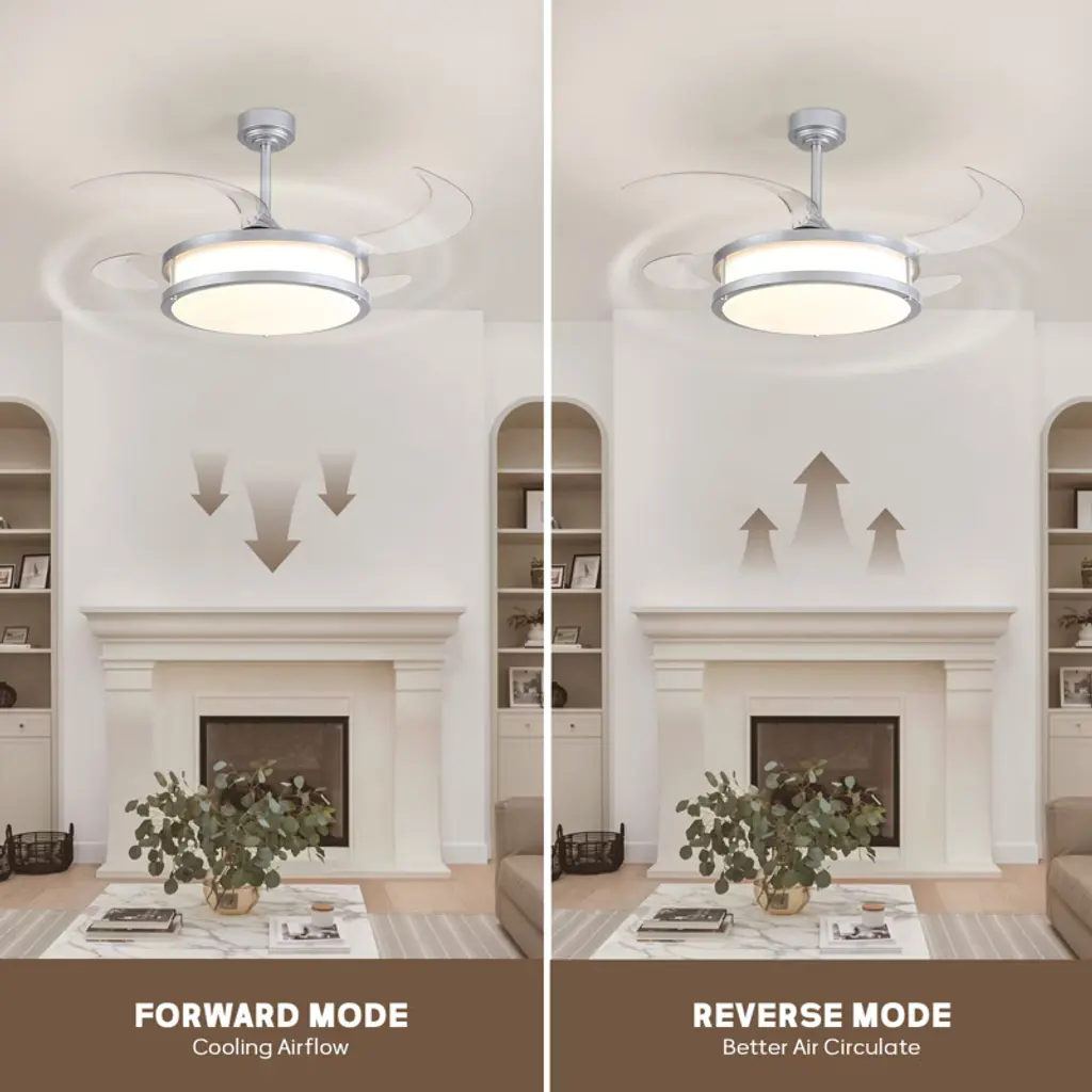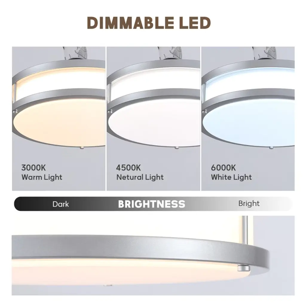 Combining elegant design with practical function, this retractable ceiling fan features auto-extending/retracting invisible blades (48"/19.7" diameters), plus included 4.9"/9.8" downrods. It features an integrated dimmable LED with adjustable color temperatures (3000K/4500K/6000K) to create the perfect ambiance, easily controlled via remote with dimming, timer, fan direction, & 6 speeds. The fan's quiet, energy-efficient motor delivers powerful airflow while saving up to 35% on power. The included accessories and instructions allow for easy install; perfect for any indoor space from living rooms to bedrooms.