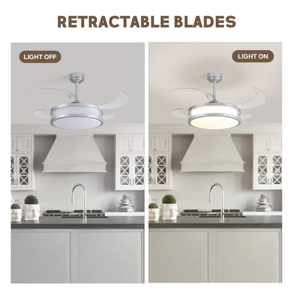 Ludomide 48" Modern Retractable Ceiling Fan With Lights And Remote, Silver Dimmable Led Chandelier Fandelier, Silent Reversible Invisible Fan