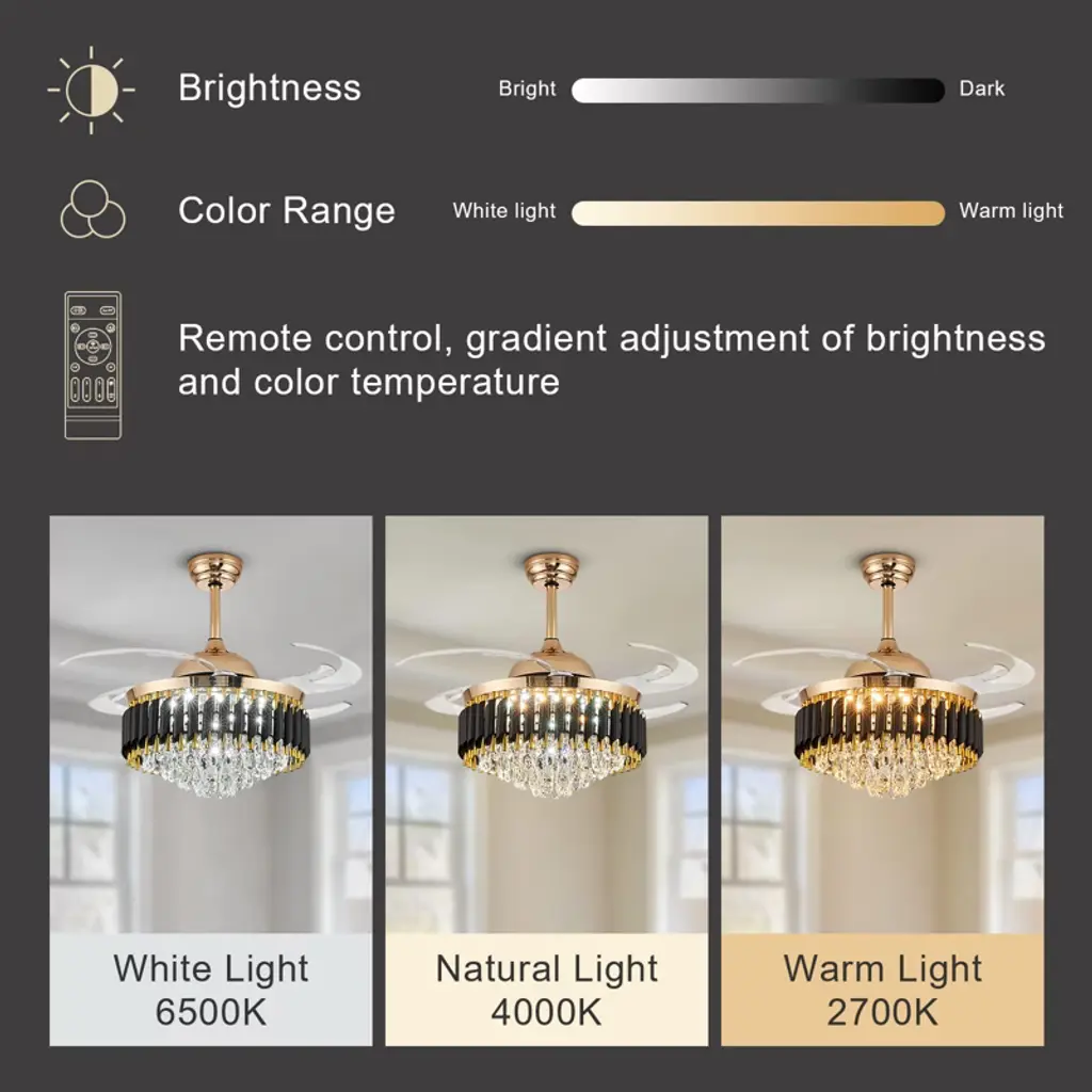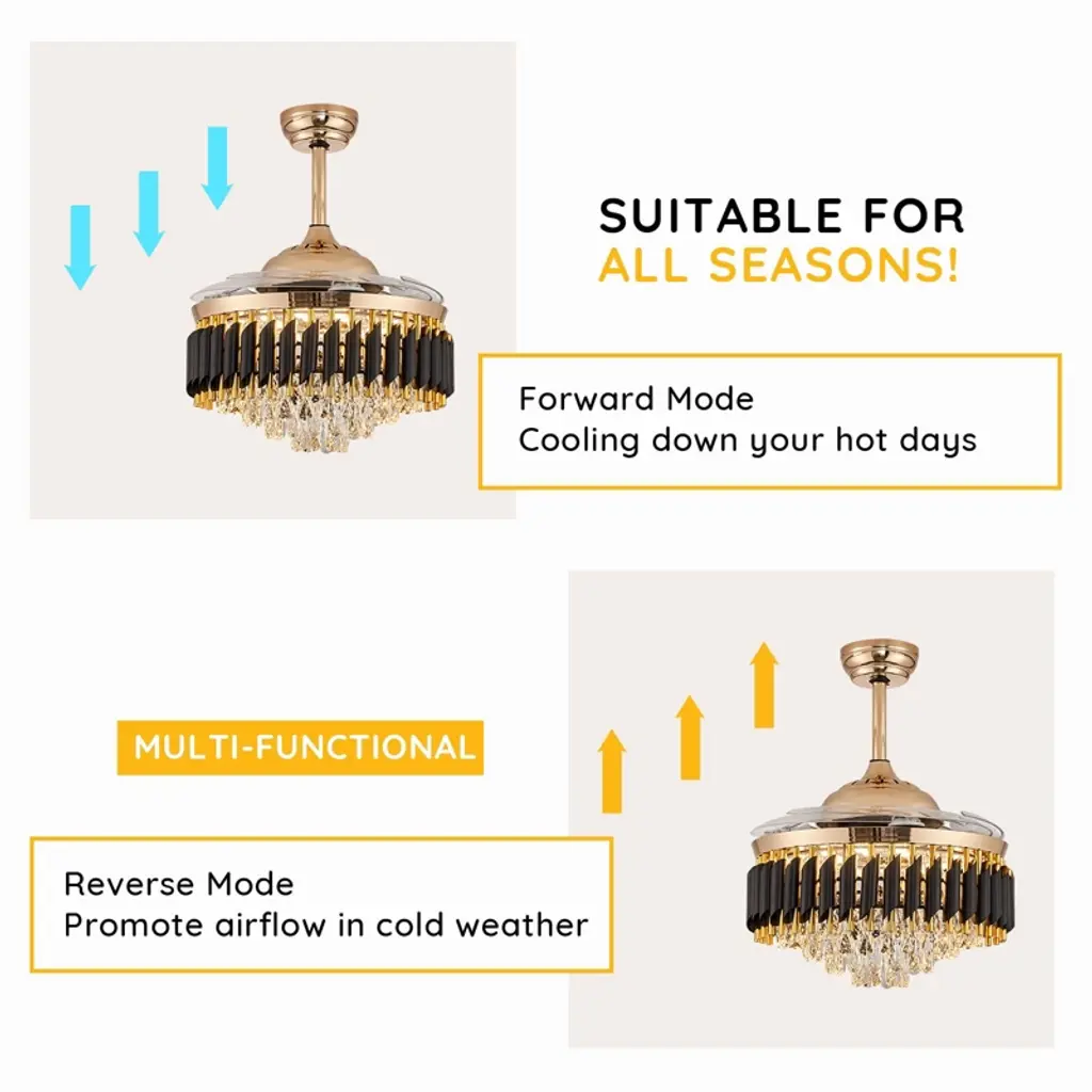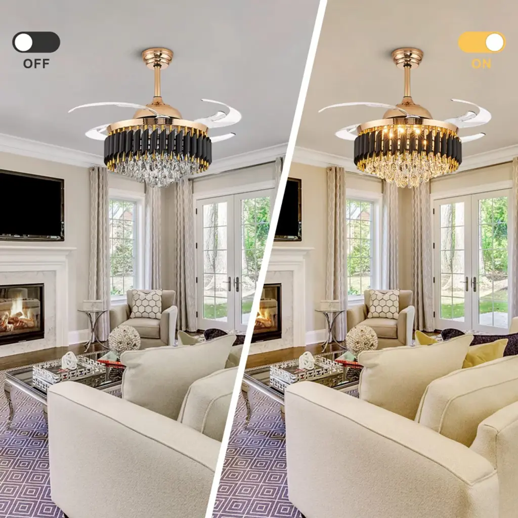Elevate your space with this 48'' stunning black and gold crystal ceiling fan, blending elegant chandelier design with practical fan functionality and offering dimmable, color-changing LED lighting and adjustable speeds for customizable comfort, all controlled remotely through a whisper-quiet, reversible motor, and retractable blades for a clean look. Its versatile design suits various spaces with sloped ceiling compatibility, perfect for living rooms, bedrooms, and more, delivering both style and convenience. Experience a luxurious atmosphere and refreshing airflow simultaneously with this chic and versatile addition to your home.