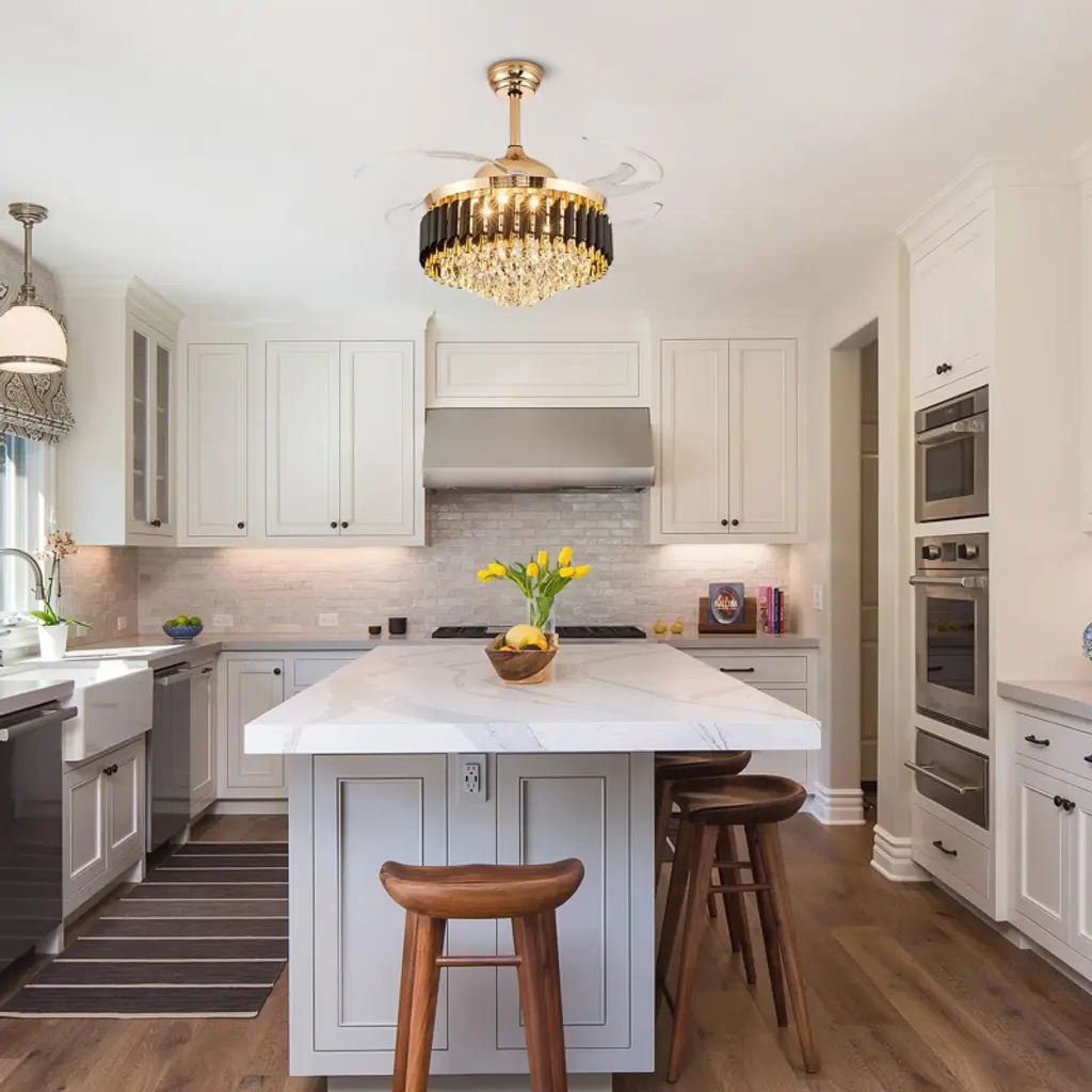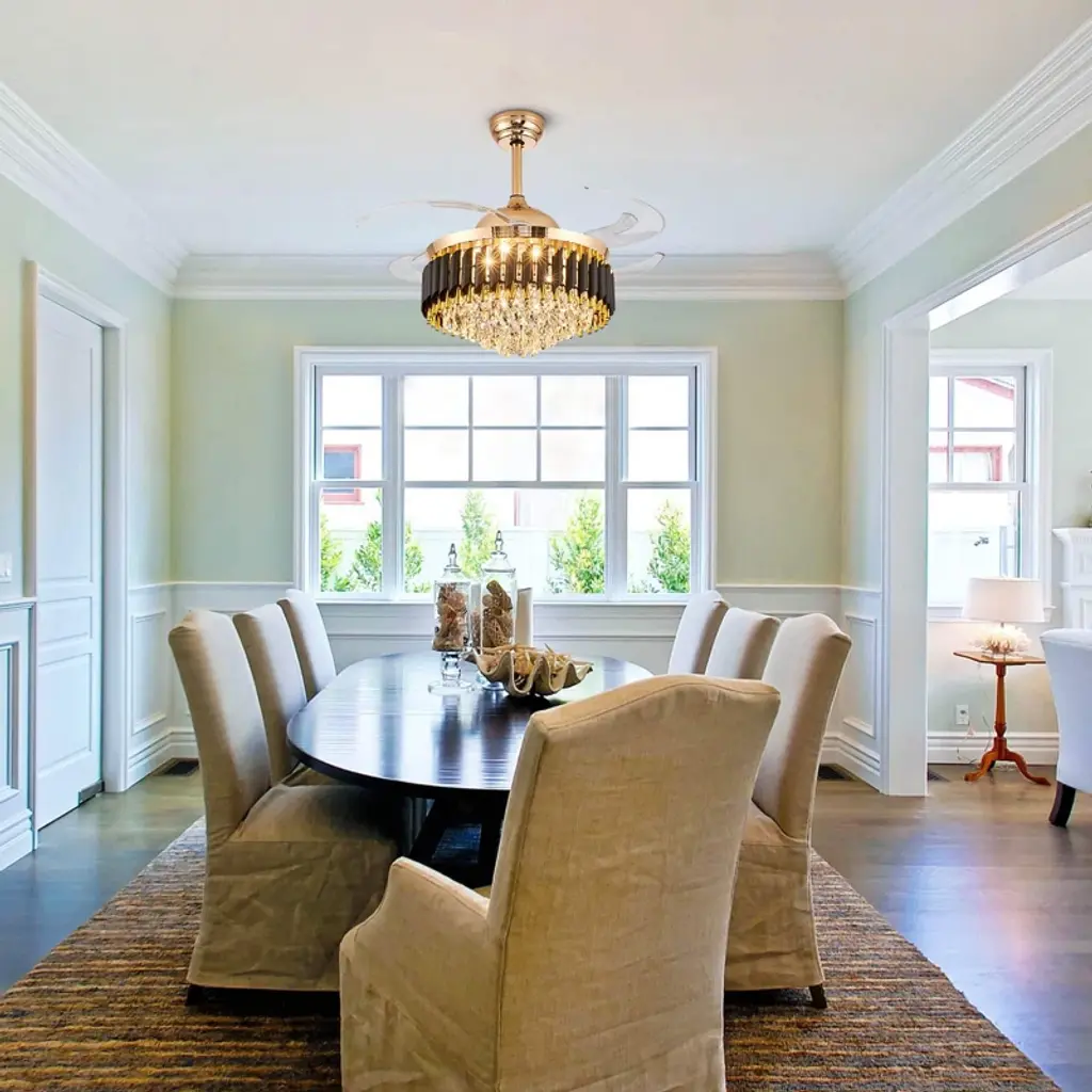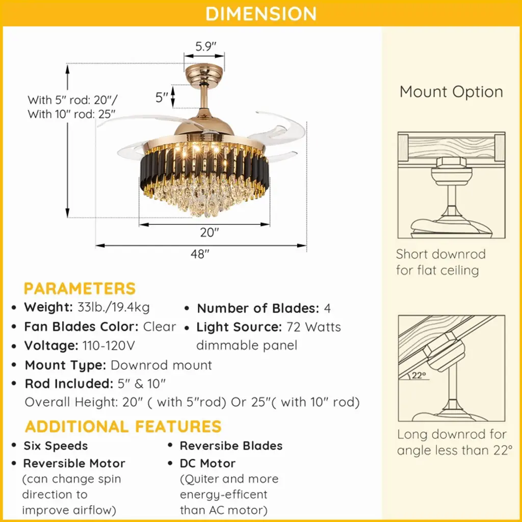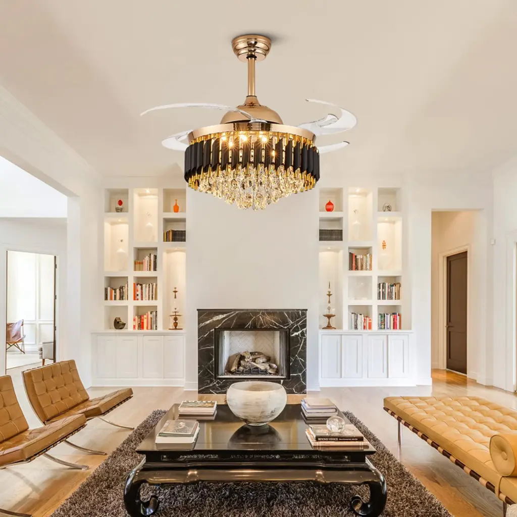 Elevate your space with this 48'' stunning black and gold crystal ceiling fan, blending elegant chandelier design with practical fan functionality and offering dimmable, color-changing LED lighting and adjustable speeds for customizable comfort, all controlled remotely through a whisper-quiet, reversible motor, and retractable blades for a clean look. Its versatile design suits various spaces with sloped ceiling compatibility, perfect for living rooms, bedrooms, and more, delivering both style and convenience. Experience a luxurious atmosphere and refreshing airflow simultaneously with this chic and versatile addition to your home.