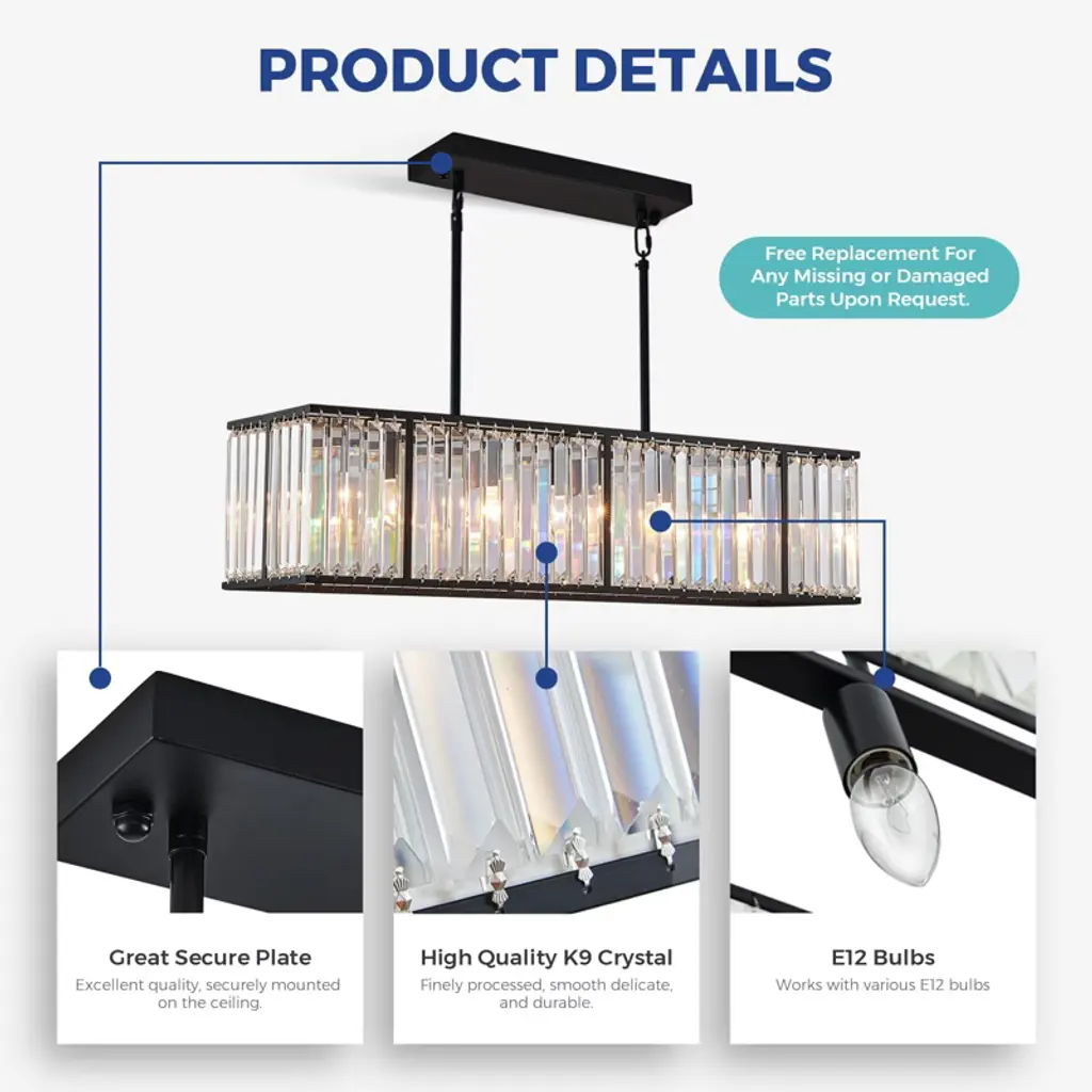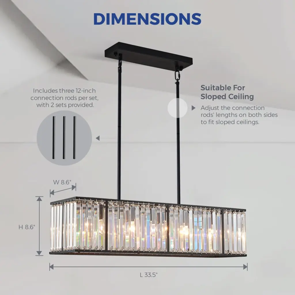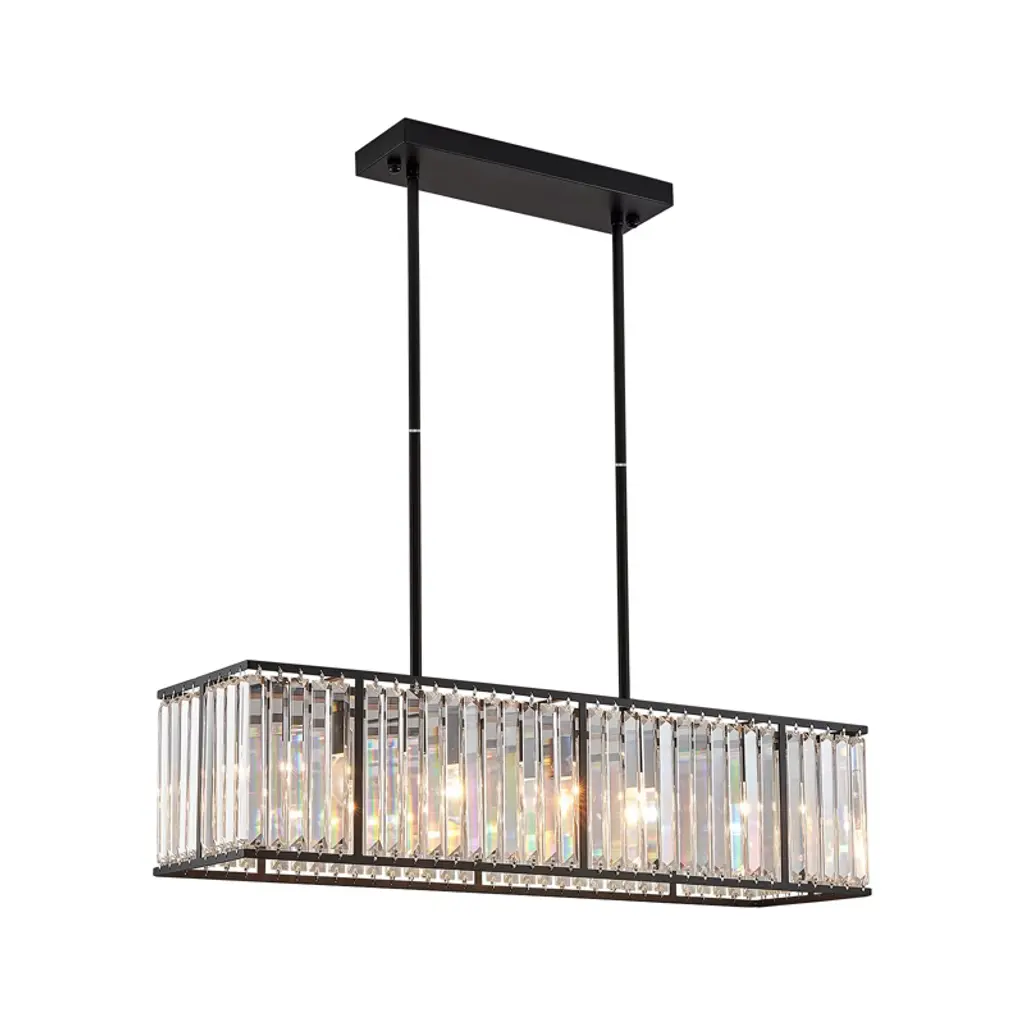 Vintage rod-type pendant light adds elegance to any space. Requires 5 E12 bulbs (not included). Compact size: 33.5"L x 8.6"W x 8.6"H. Features black painted stainless steel base and K9 clear crystals. Versatile for dining rooms, kitchens, hotels, and more.