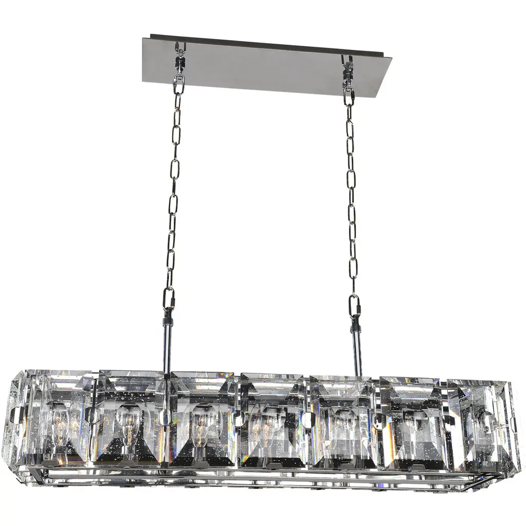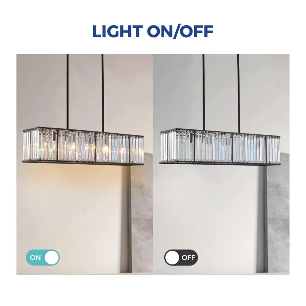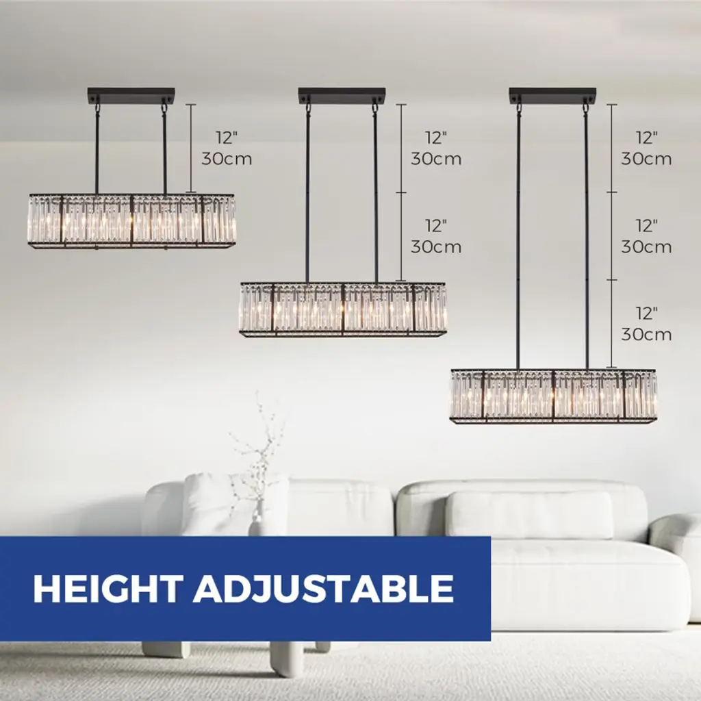 Vintage rod-type pendant light adds elegance to any space. Requires 5 E12 bulbs (not included). Compact size: 33.5"L x 8.6"W x 8.6"H. Features black painted stainless steel base and K9 clear crystals. Versatile for dining rooms, kitchens, hotels, and more.