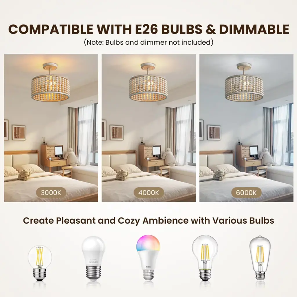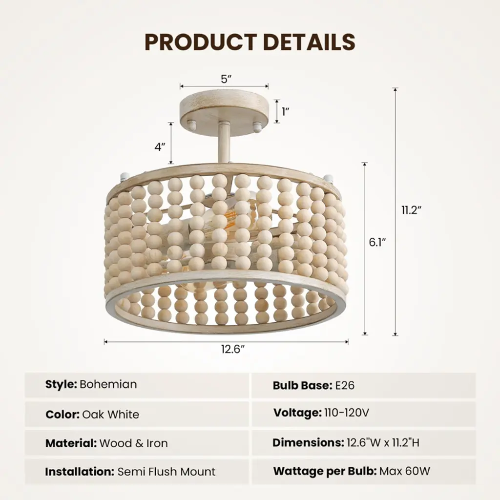 This oak-finished beaded chandelier features high-quality natural wood beads, creating a stunning atmosphere. With dimensions of 12.6" width x 11.2" height, it requires two E26 bulbs (not included), compatible with LED, CFL, and incandescent bulbs up to 60W. Easy to install and suitable for various spaces including nurseries, bedrooms, kitchens, and more.