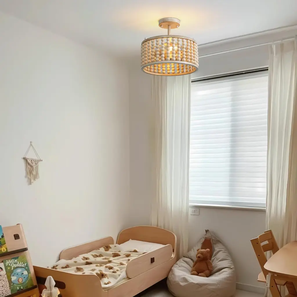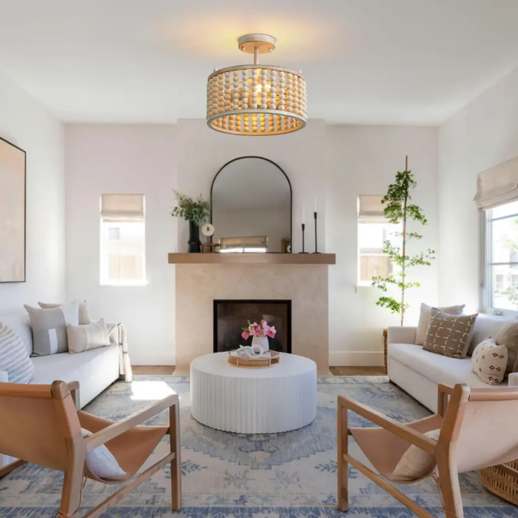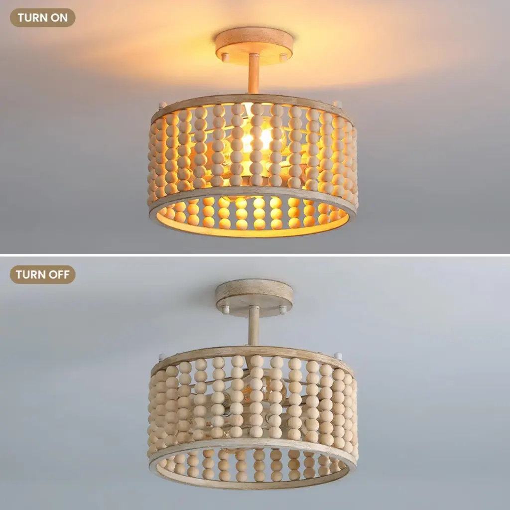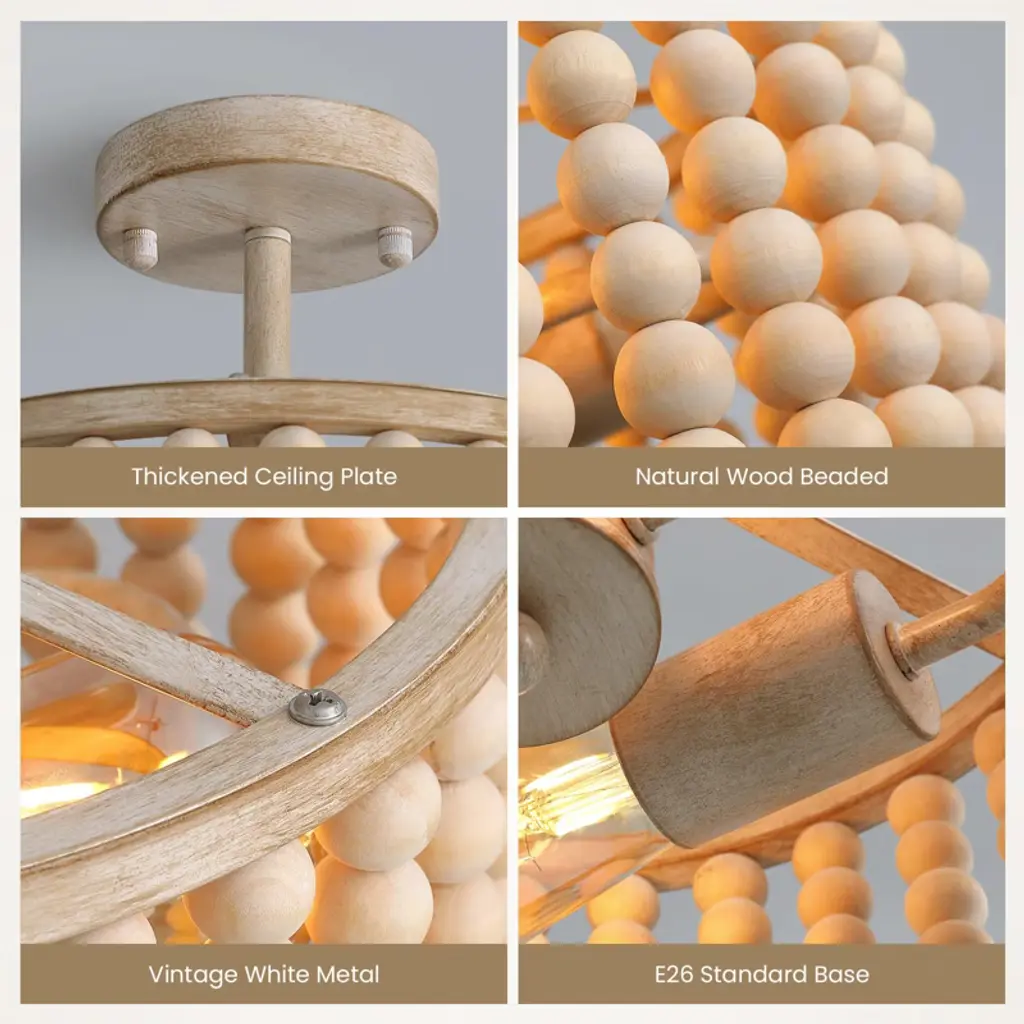 Ludomide Wood Beaded Chandelier, Boho Farmhouse Light Fixture, Oak White, 2 Lights, Semi Flush Mount Ceiling Light Fixtures For Hallway