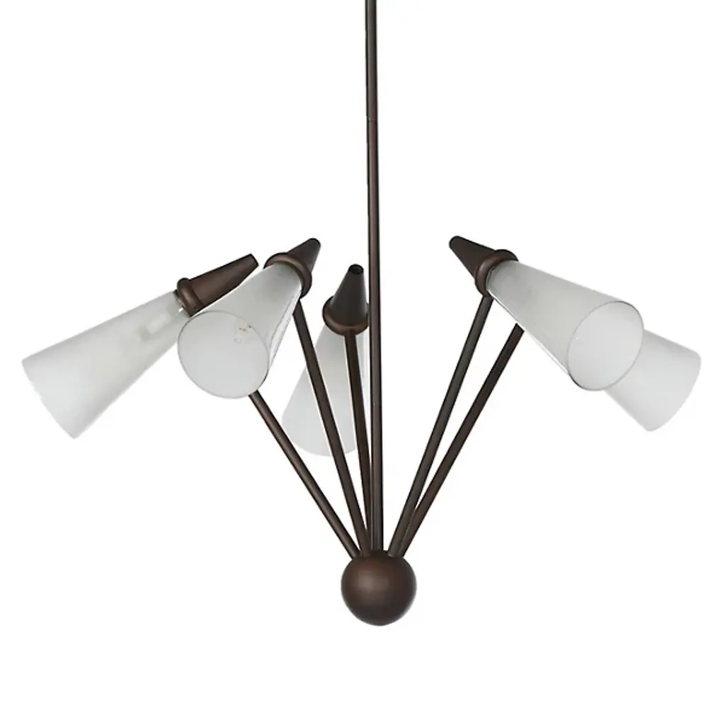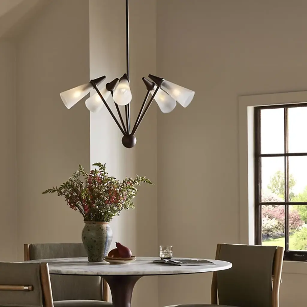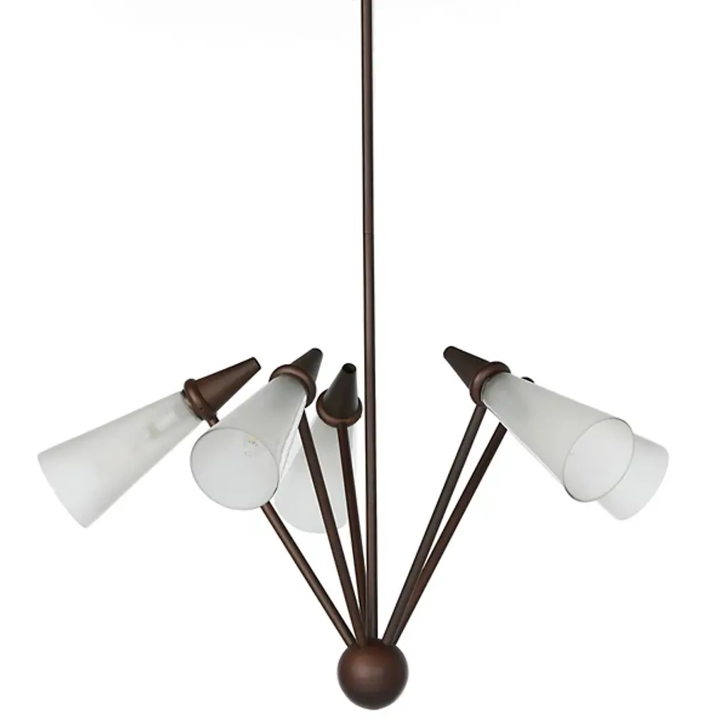 The Ludwig Chandelier from Four Hands features angled iron arms that hold frosted glass cones, casting a soft, diffused glow throughout any room. A central ball detail connects the arms, forming a dynamic and eye-catching silhouette. Metal caps where glass meets metal add a polished, refined accent, enhancing its elegance. Finished in a rich dark rust, this piece exudes timeless charm and warmth, making it a perfect addition to both modern and classic interiors.
