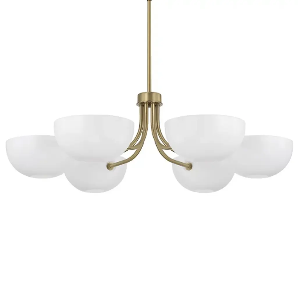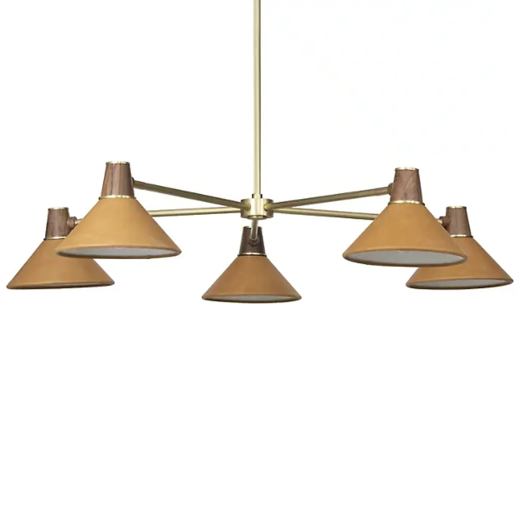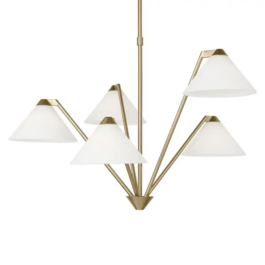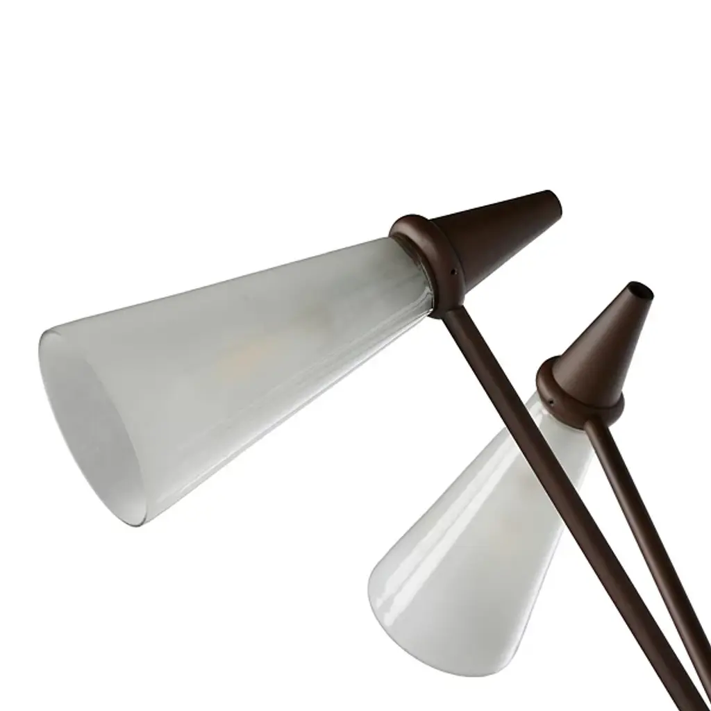 The Ludwig Chandelier from Four Hands features angled iron arms that hold frosted glass cones, casting a soft, diffused glow throughout any room. A central ball detail connects the arms, forming a dynamic and eye-catching silhouette. Metal caps where glass meets metal add a polished, refined accent, enhancing its elegance. Finished in a rich dark rust, this piece exudes timeless charm and warmth, making it a perfect addition to both modern and classic interiors.