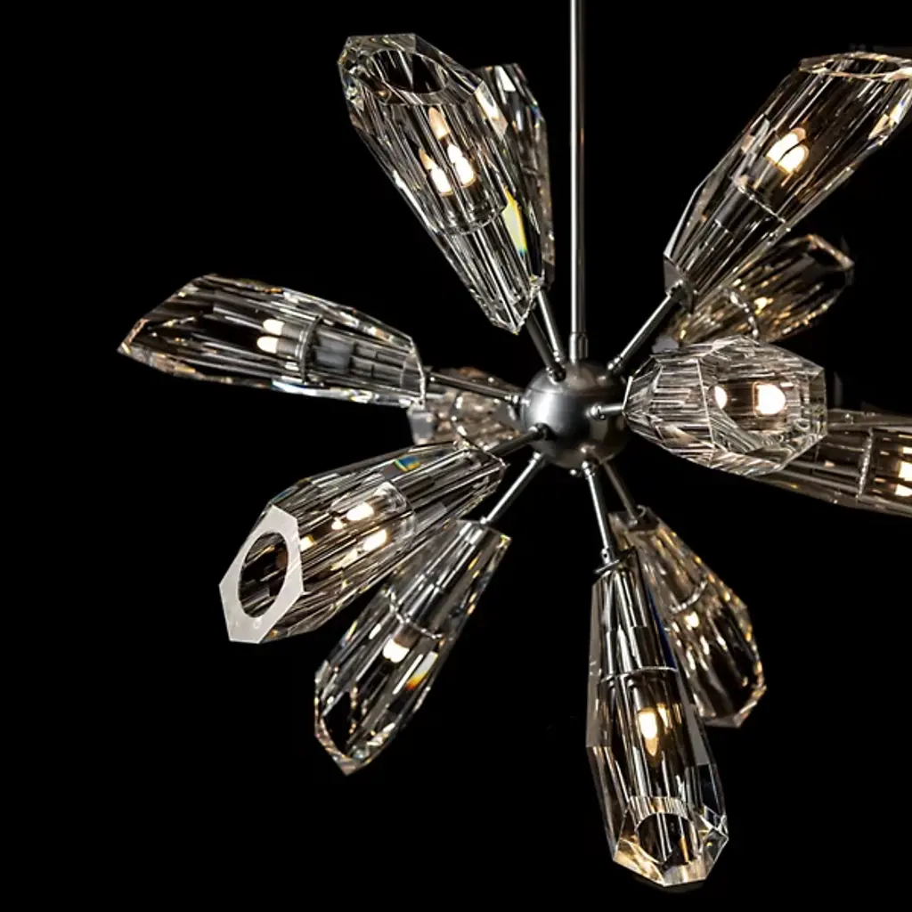 A lighting design created to brighten a room whether it’s turned on or not. The Luma Starburst Chandelier by Hubbardton Forge features 12 shades made of intricate and irregularly faceted crystal. At the end of spokes radiating out from the spherical metal frame, the crystal shades send eye-catching sparkle out in all directions, especially when illuminated by the petite bulbs within. Use this pendant to set a dynamic and dazzling tone in a foyer or dining room.