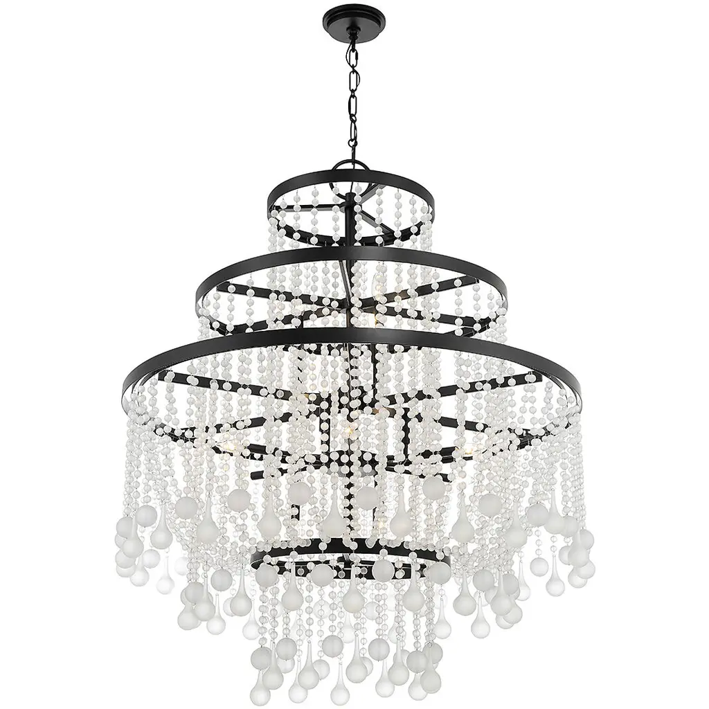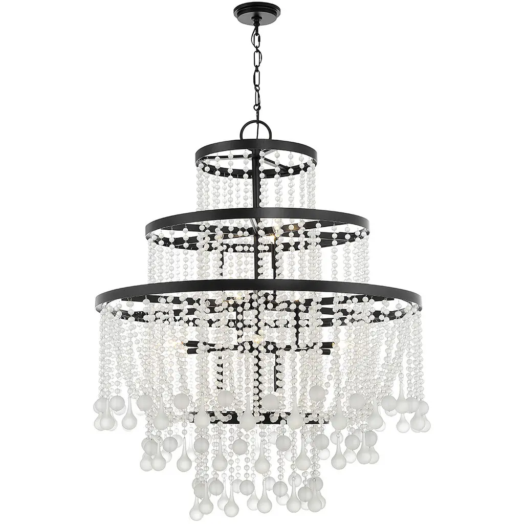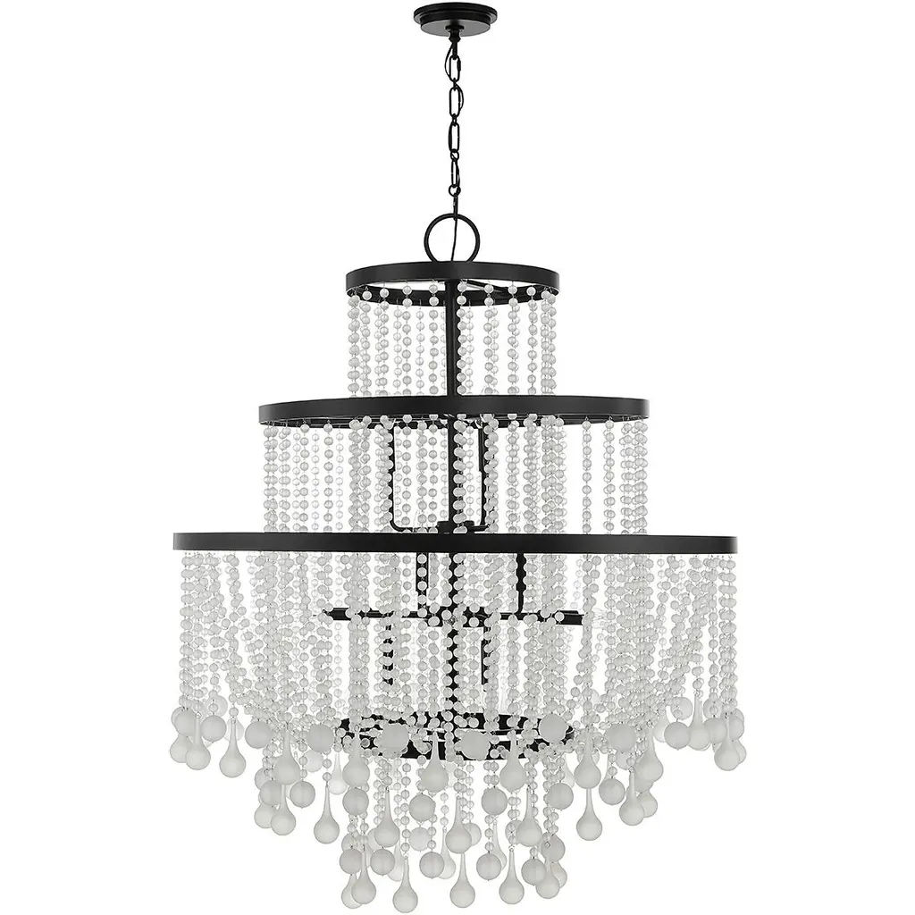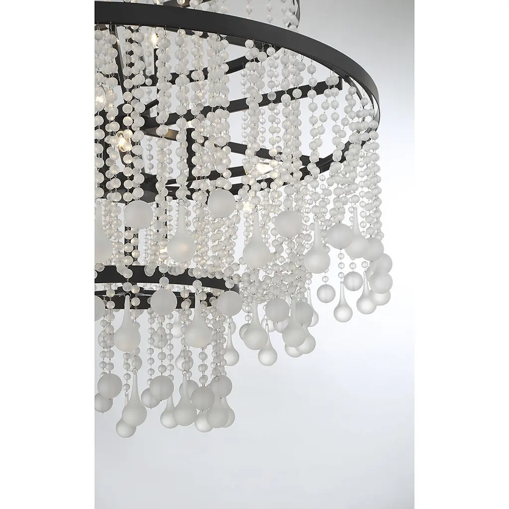 Decorate your space with the Savoy House Luna 15-light chandelier, a glamorous look that uses three tiers of lights surrounded by cascading curtains of frosted crystal to create a boldly beautiful look. Lovingly finished in matte black. Luna is 54" in height and 45" in width. It uses 15 candelabra size bulbs of up to 60 watts per bulb (bulbs not included).