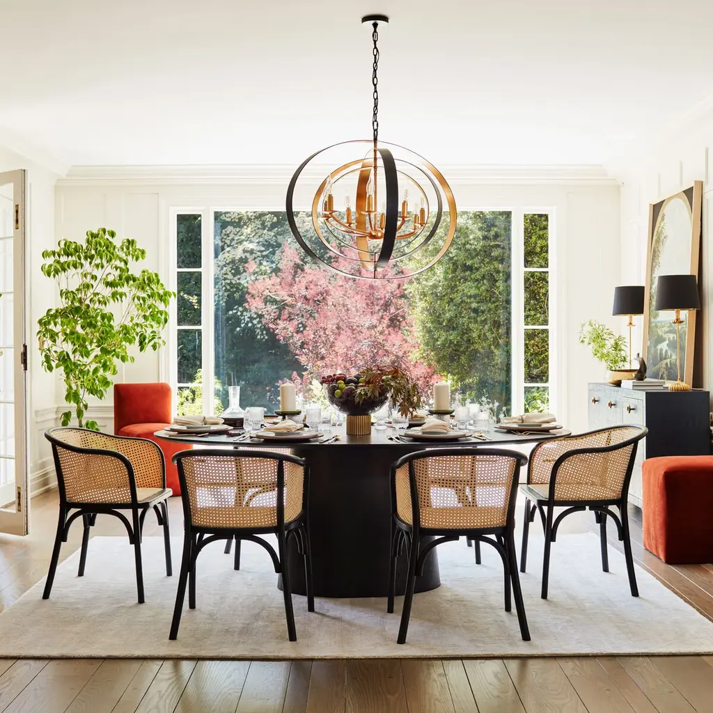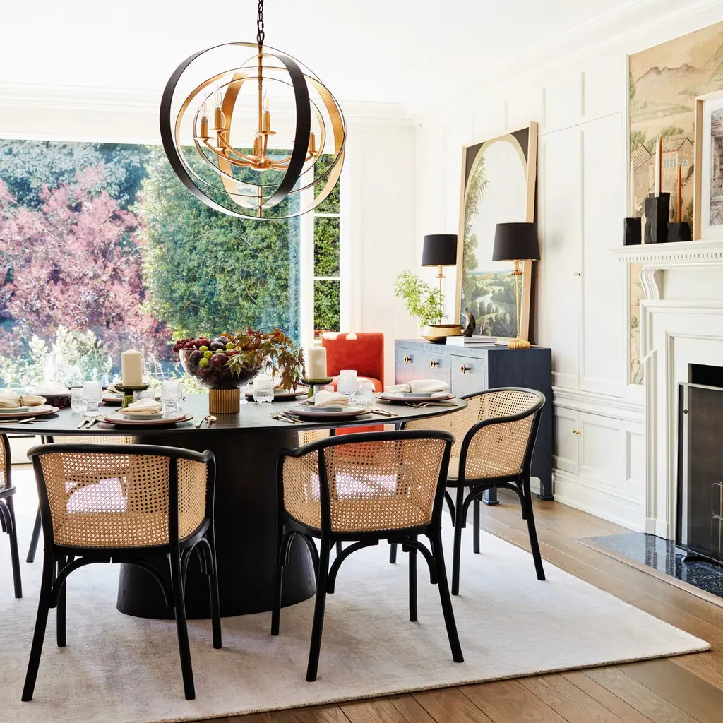 Crafted of wrought iron with an elongated, orb-like design, this fixture exudes a modern, artful appeal. The four concentric circles of this chandelier create an open sphere that imparts great dimension and visual appeal. Hardwired.