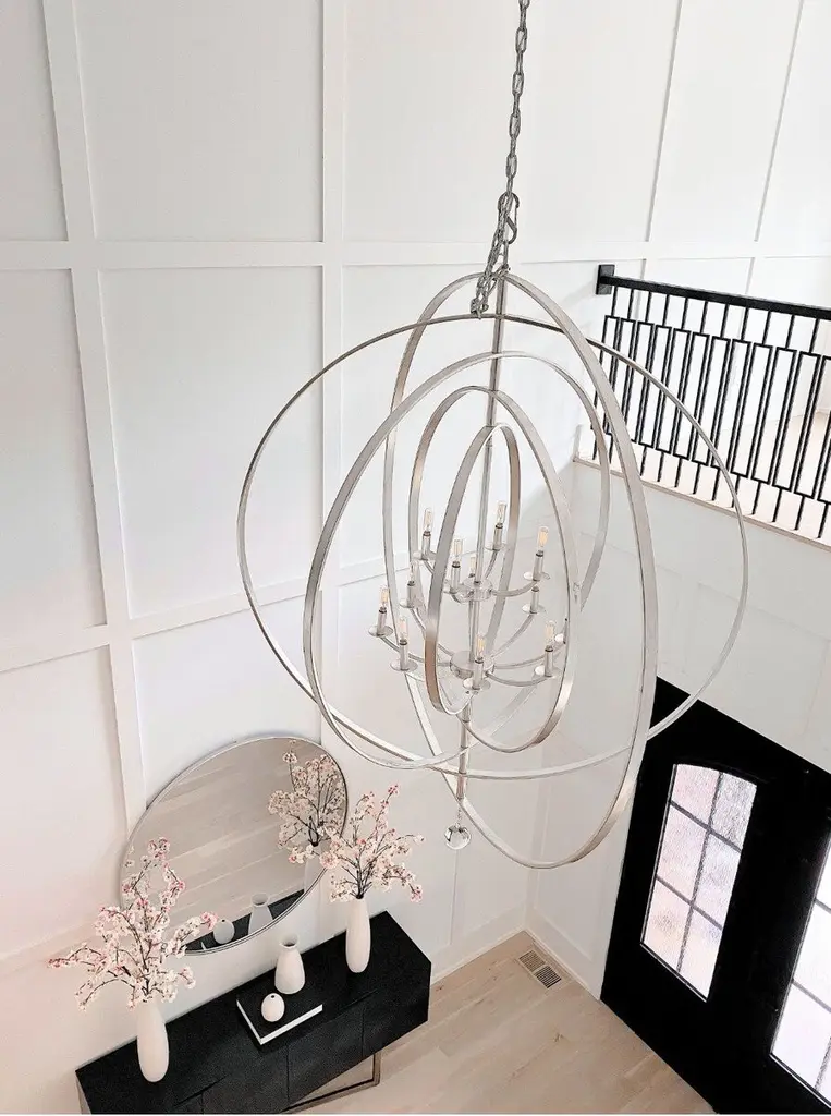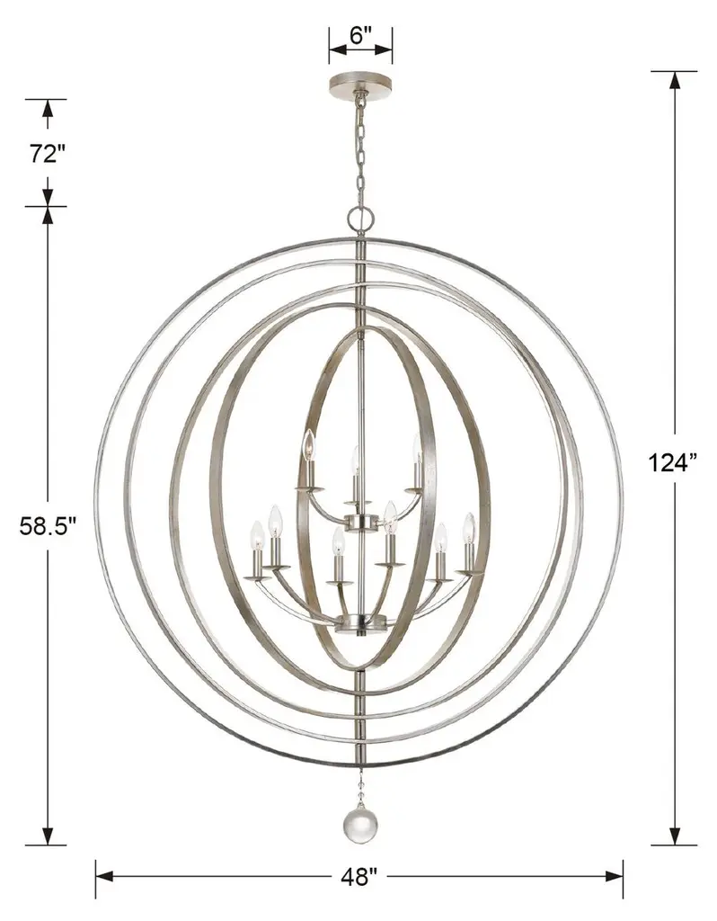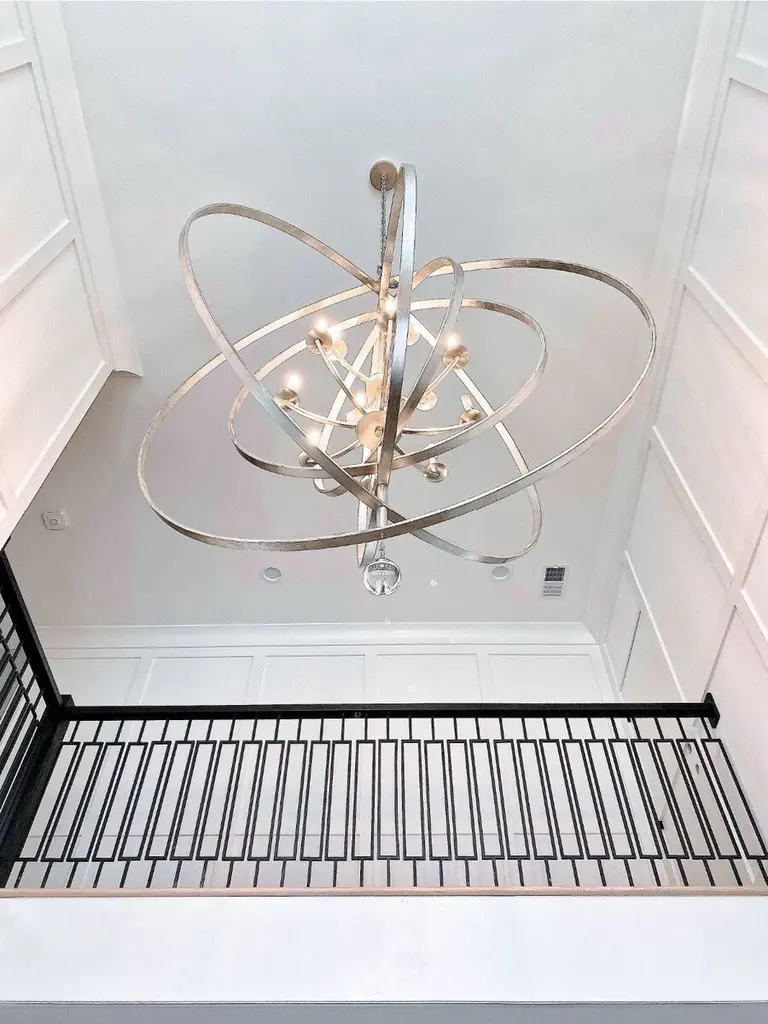 The five concentric circles of this chandelier create an open sphere that imparts great dimension and visual appeal. Hardwired.