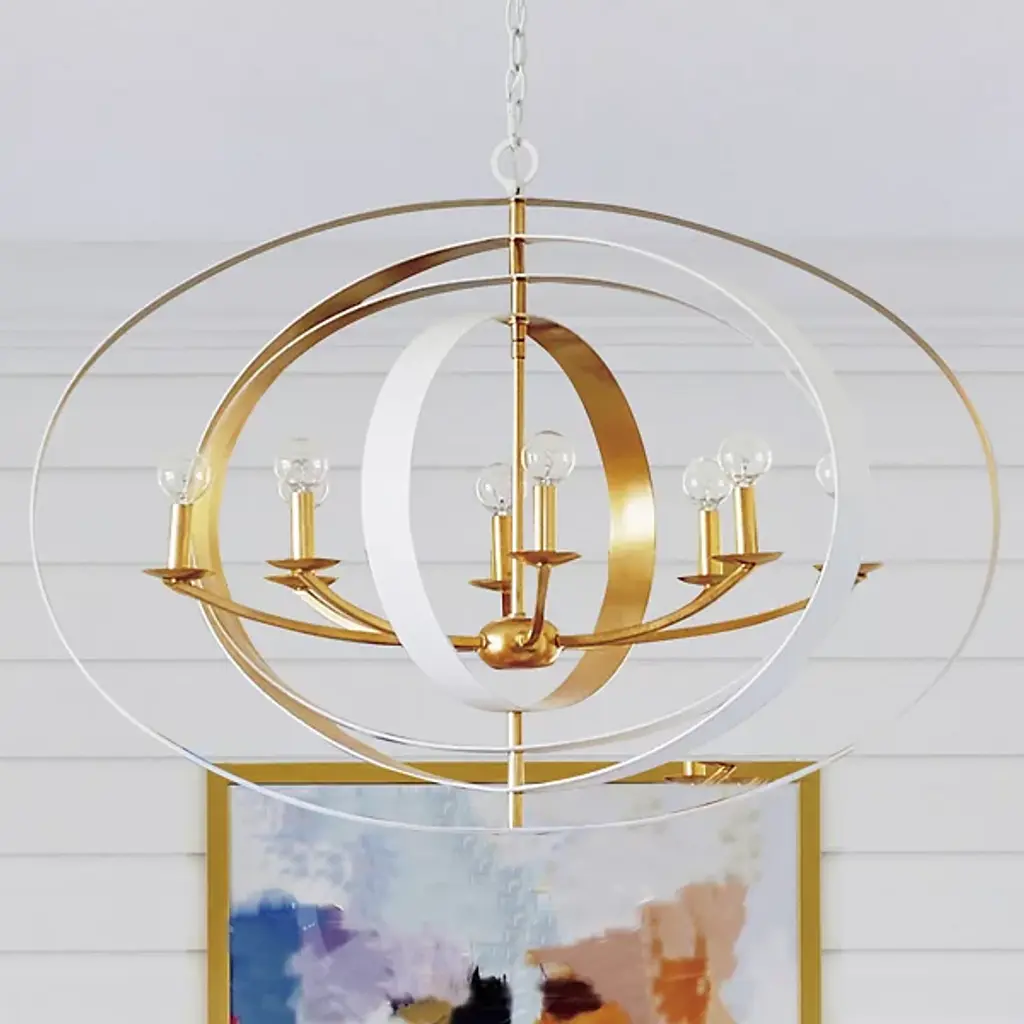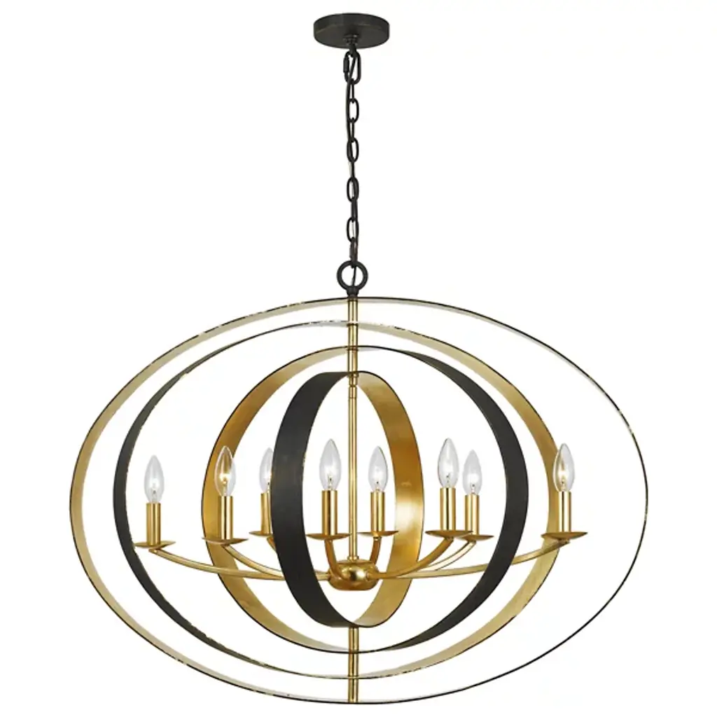 Inspired by Industrial design, the Crystorama Luna Wide Chandelier features iron rings in contrasting finishes in varying sizes to form an oval shape. The two tone contrasting finish adds a unique quality with plenty of juxtaposition. The illumination from the exposed bulbs gives a beautiful gleam to the inner finish, as well as illuminating the surrounding space with an industry derived aesthetic.