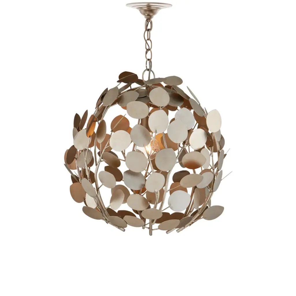 Experience nature's beauty with the Lunaria Chandelier from Curry & Company. Inspired by the luminous lunaria, also known as the money plant, this chandelier features delicate, coin-like petals made of wrought iron, creating an open and airy feel. The perfect addition to any room, its warm and dramatic light will make a lasting impression. Highlights