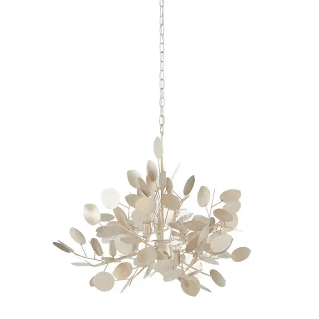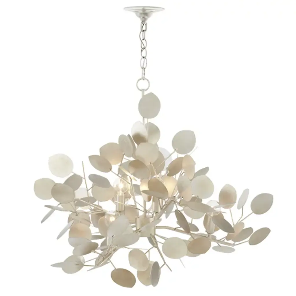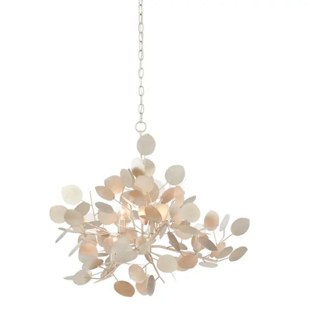 The Lunaria Chandelier by Currey & Co finds both its name and inspiration from the Lunaria plant, which features softly shaped, translucent petals that light playfully filters through. Its name also means moon-shaped, giving another poetic layer to this elegant design. Suspended from a linked chain, a series of metallic petals are spread out along wrought-iron branches that surround a set of exposed bulbs. These petals both reflect and block the glow created at the center of this piece, offering a dynamic mix of light and shadow to rooms.