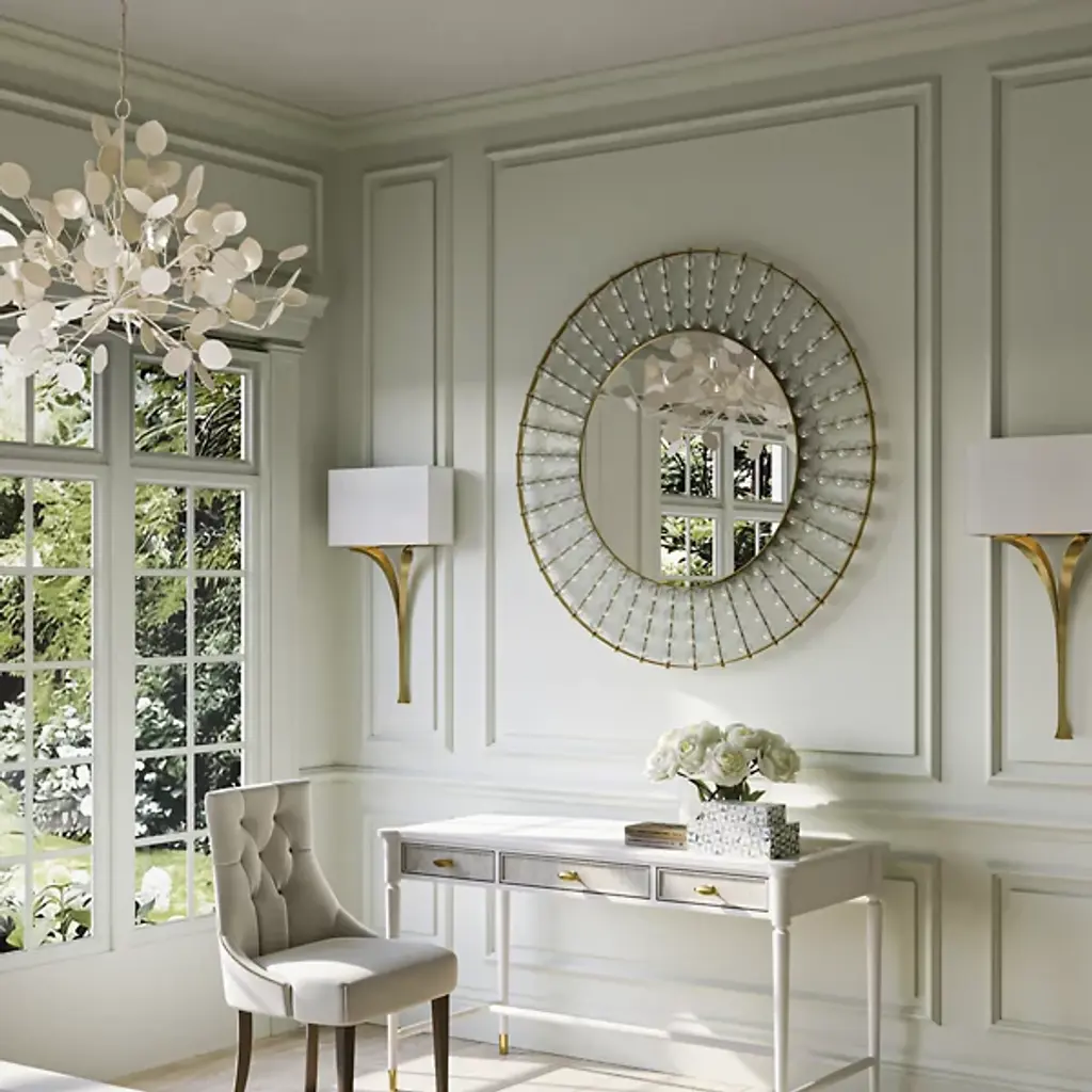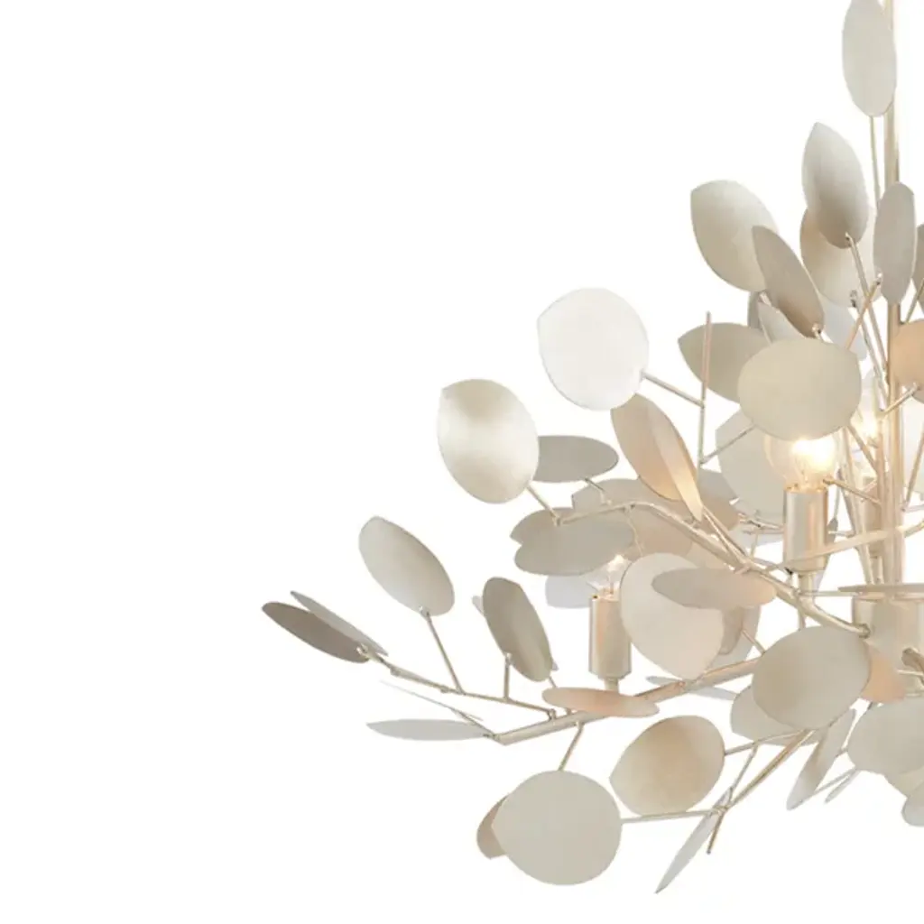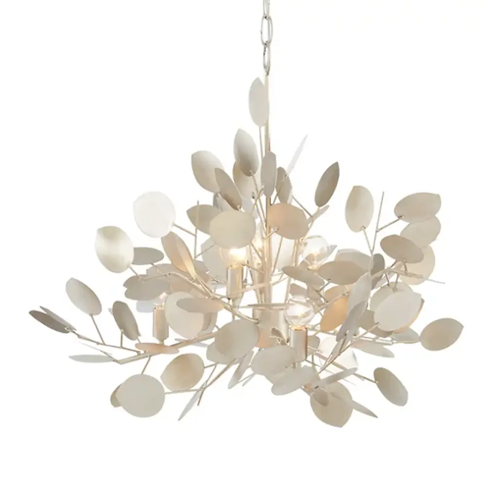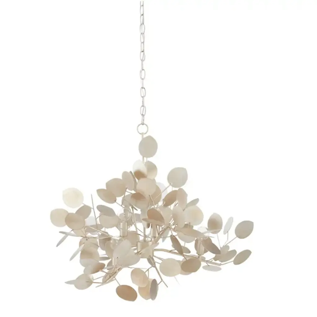 The Lunaria Chandelier by Currey & Co finds both its name and inspiration from the Lunaria plant, which features softly shaped, translucent petals that light playfully filters through. Its name also means moon-shaped, giving another poetic layer to this elegant design. Suspended from a linked chain, a series of metallic petals are spread out along wrought-iron branches that surround a set of exposed bulbs. These petals both reflect and block the glow created at the center of this piece, offering a dynamic mix of light and shadow to rooms.