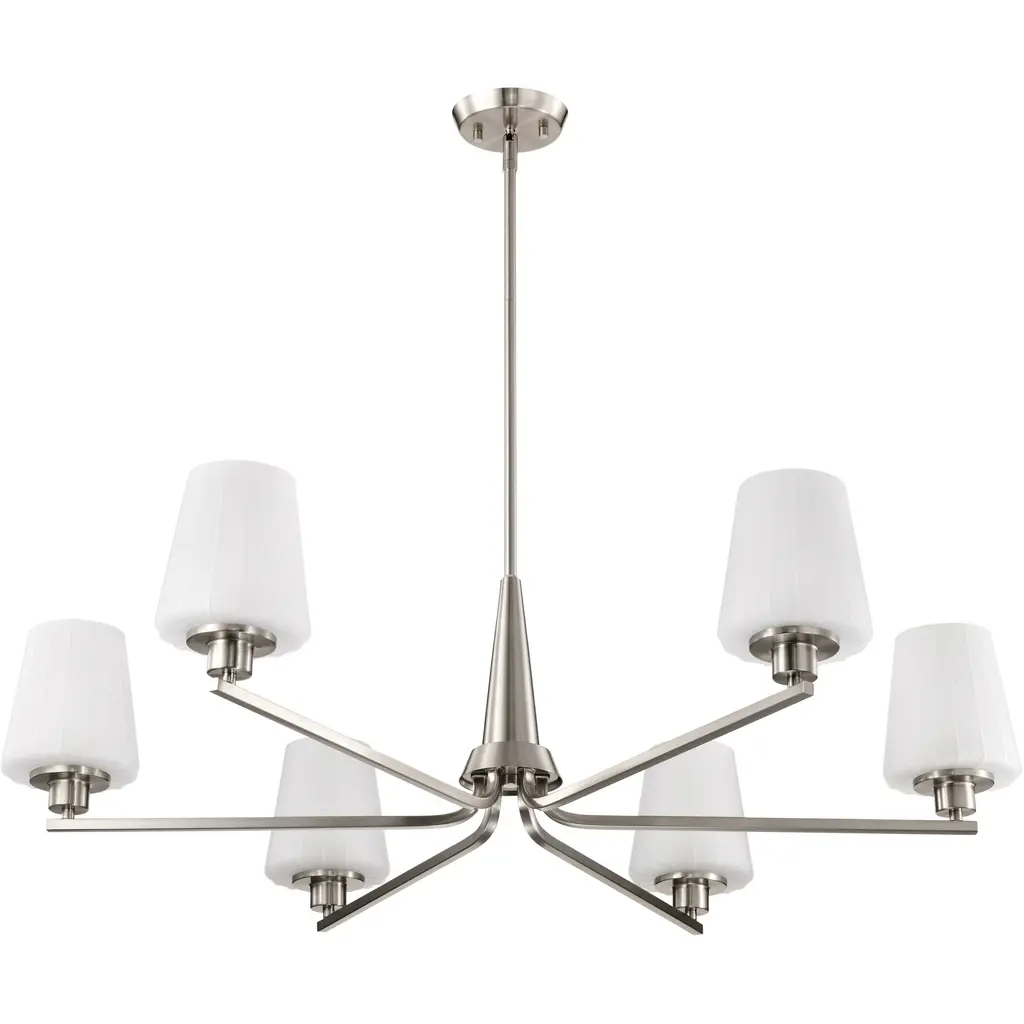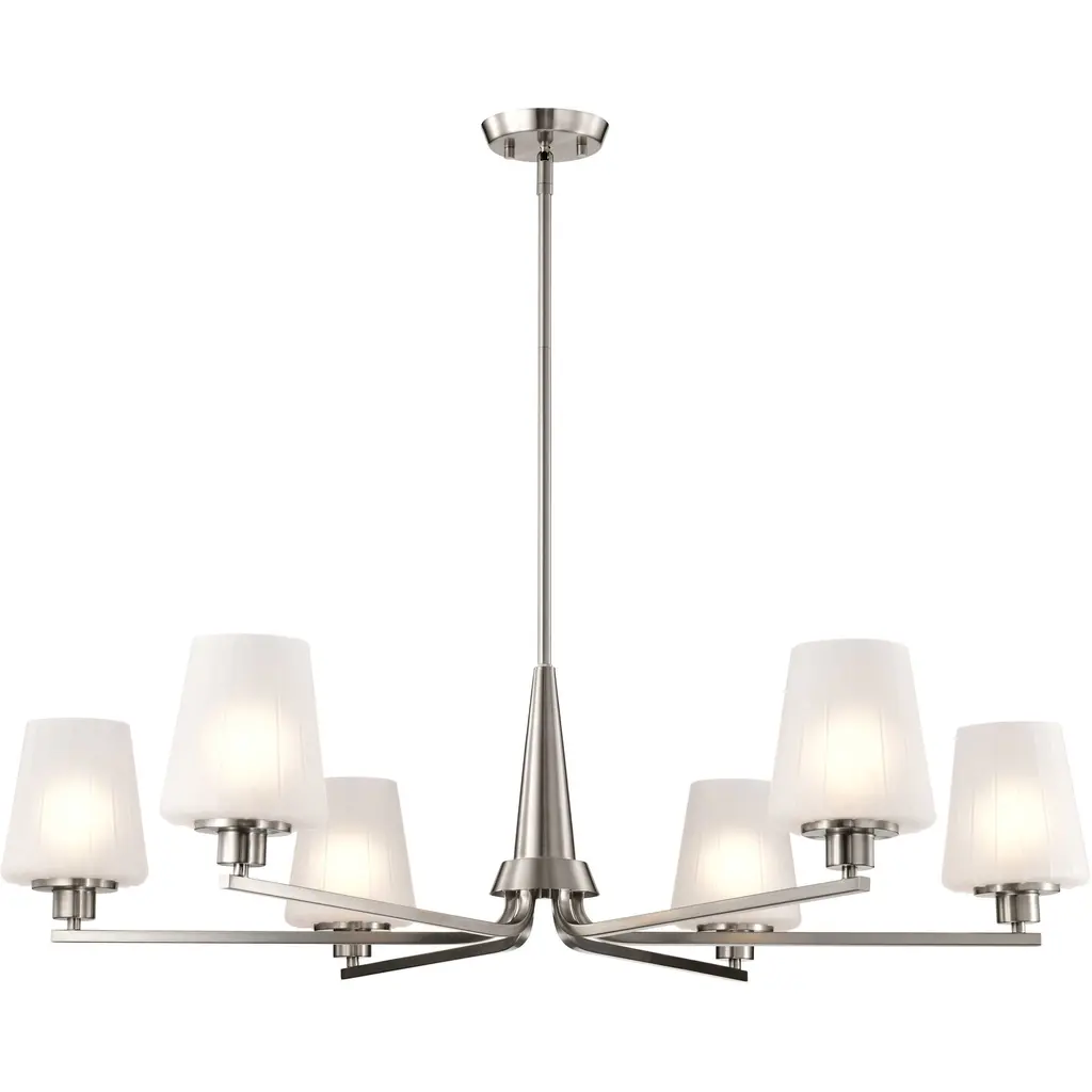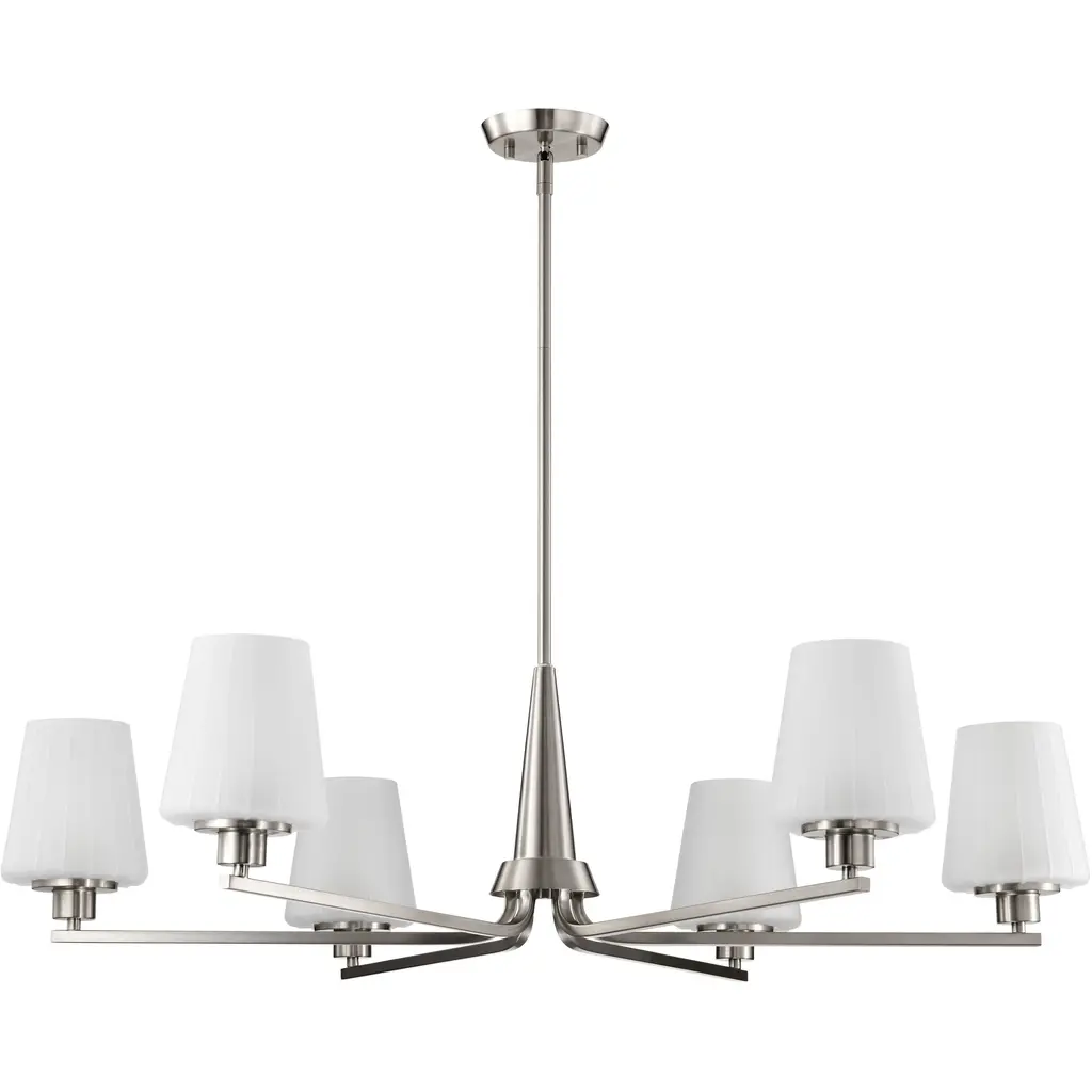 Embrace the classic elegance of the Lune 60-8226 six light chandelier, where updated Mid-Century Modern design meets today's sophisticated style. Featuring graceful lines and thoughtful details, it reimagines retro aesthetics for the contemporary home. Finished in brushed nickel, and crowned by etched scalloped glass that casts a warm, inviting glow. Perfectly blending nostalgia and modernity, it's the ideal choice for those who appreciate a touch of charm in a fresh, refined design.