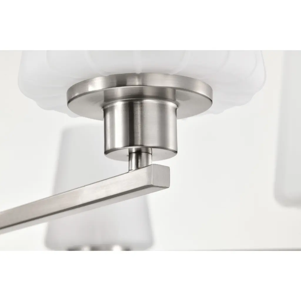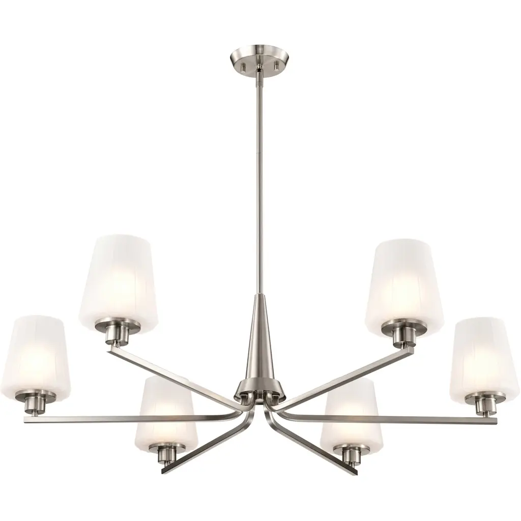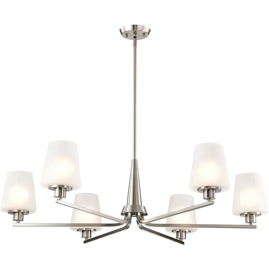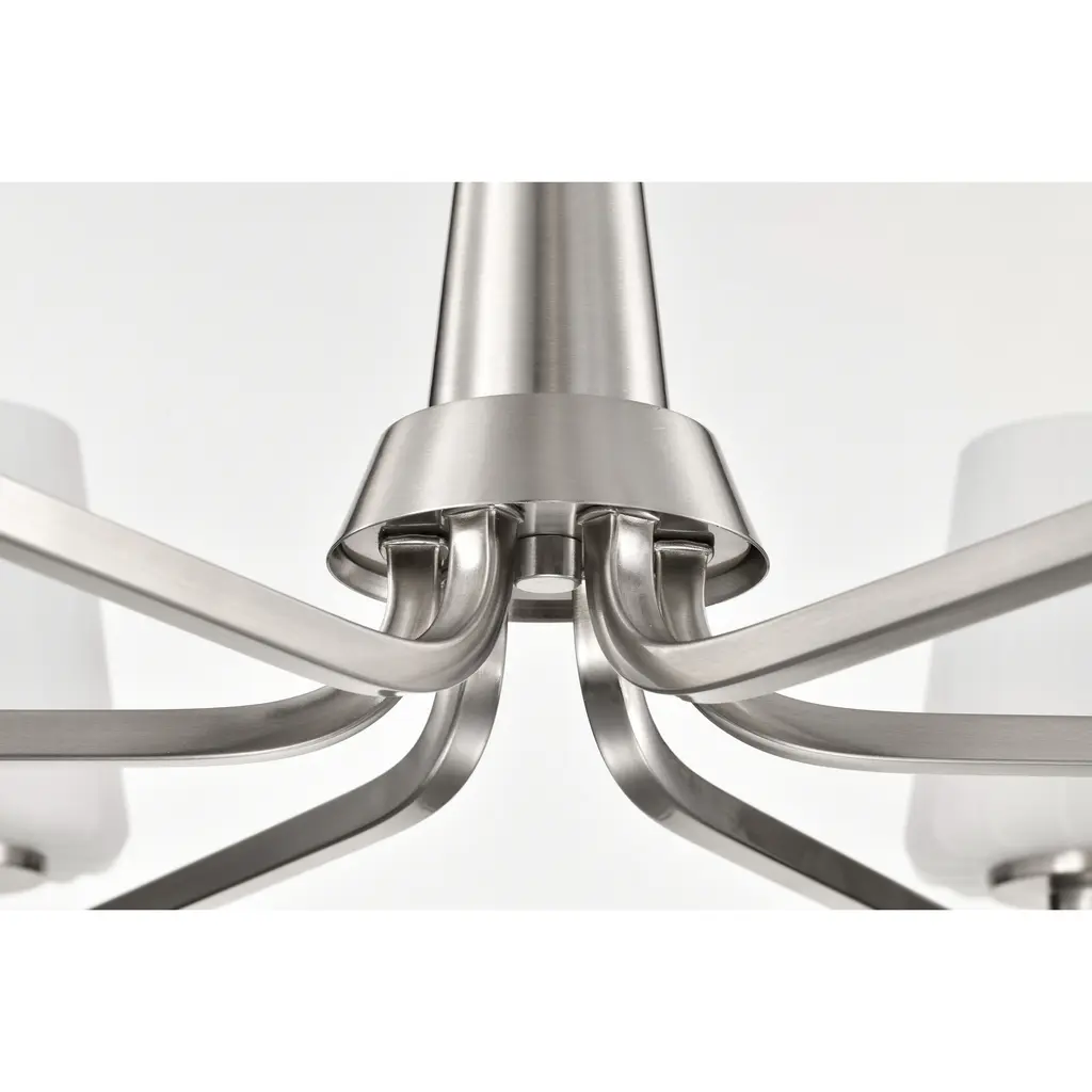 Embrace the classic elegance of the Lune 60-8226 six light chandelier, where updated Mid-Century Modern design meets today's sophisticated style. Featuring graceful lines and thoughtful details, it reimagines retro aesthetics for the contemporary home. Finished in brushed nickel, and crowned by etched scalloped glass that casts a warm, inviting glow. Perfectly blending nostalgia and modernity, it's the ideal choice for those who appreciate a touch of charm in a fresh, refined design.
