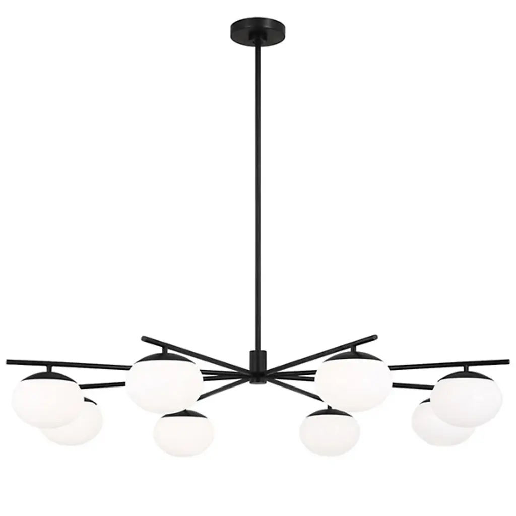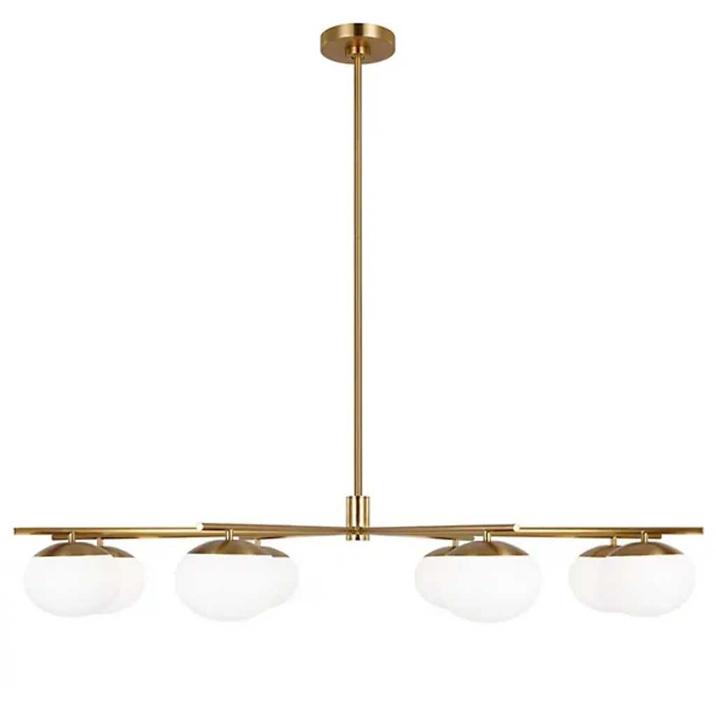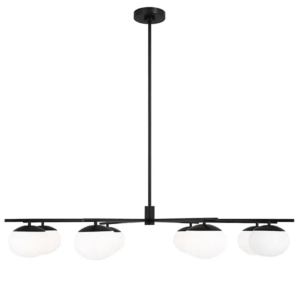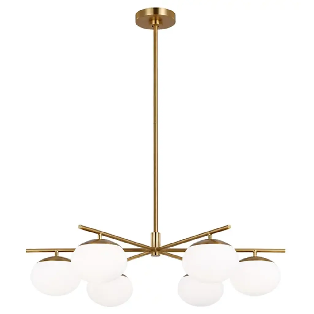 The iconic style of ED Ellen Degeneres’ Lune Chandelier is inspired by mid-century modern aesthetic. The eye draws toward the soothing color of milk glass shades. The symmetrical orbs diffuse light beautifully as they suspend below each metallic arm. The entirety of the composition evokes a flair for the dramatic and divine. Because this piece can live in standard dry interiors as well as damp locales, it has a versatile ability to elevate a space with enlightened design.