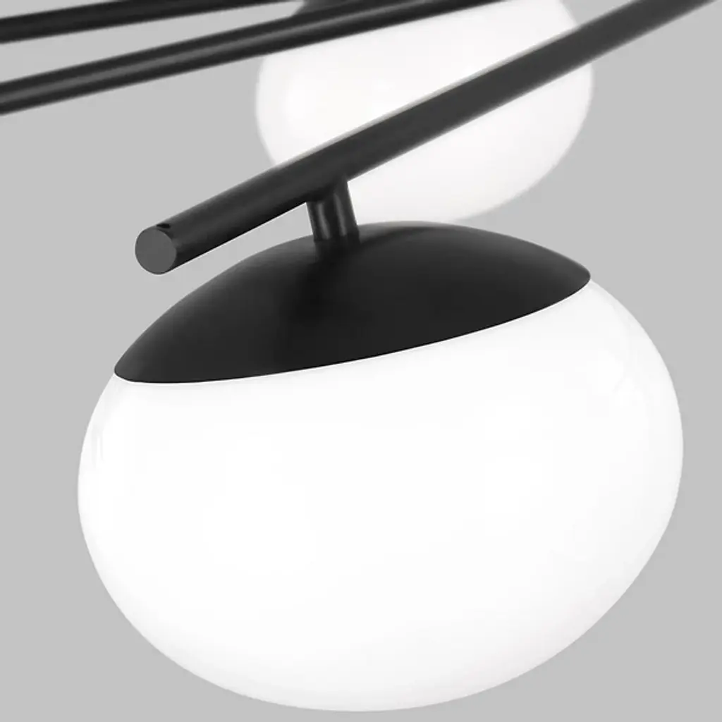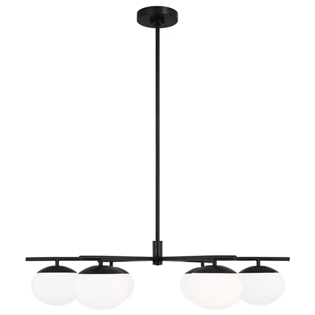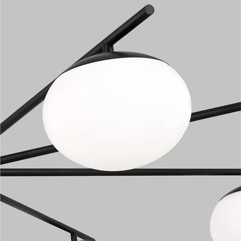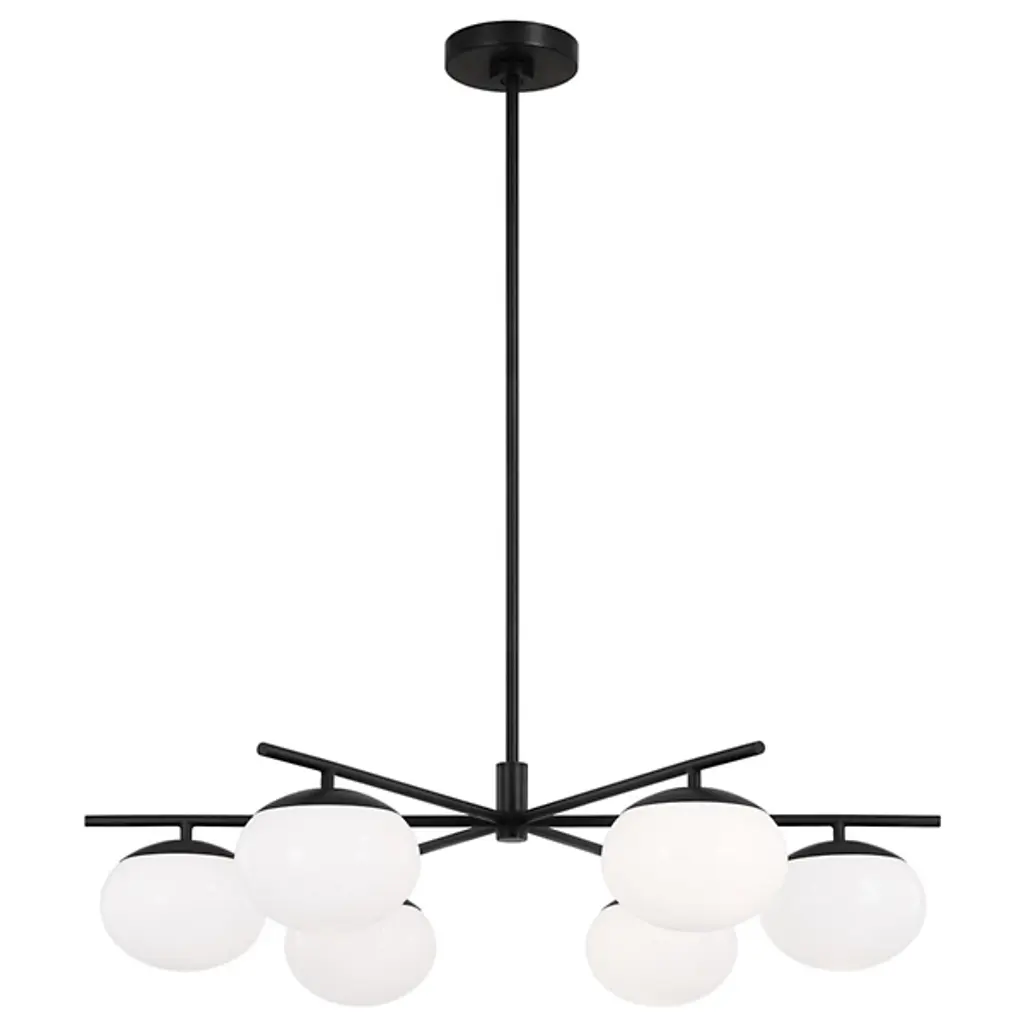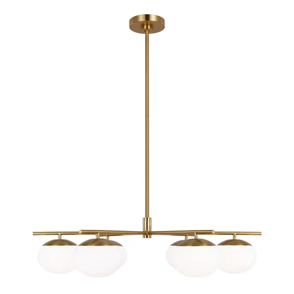 The iconic style of ED Ellen Degeneres’ Lune Chandelier is inspired by mid-century modern aesthetic. The eye draws toward the soothing color of milk glass shades. The symmetrical orbs diffuse light beautifully as they suspend below each metallic arm. The entirety of the composition evokes a flair for the dramatic and divine. Because this piece can live in standard dry interiors as well as damp locales, it has a versatile ability to elevate a space with enlightened design.
