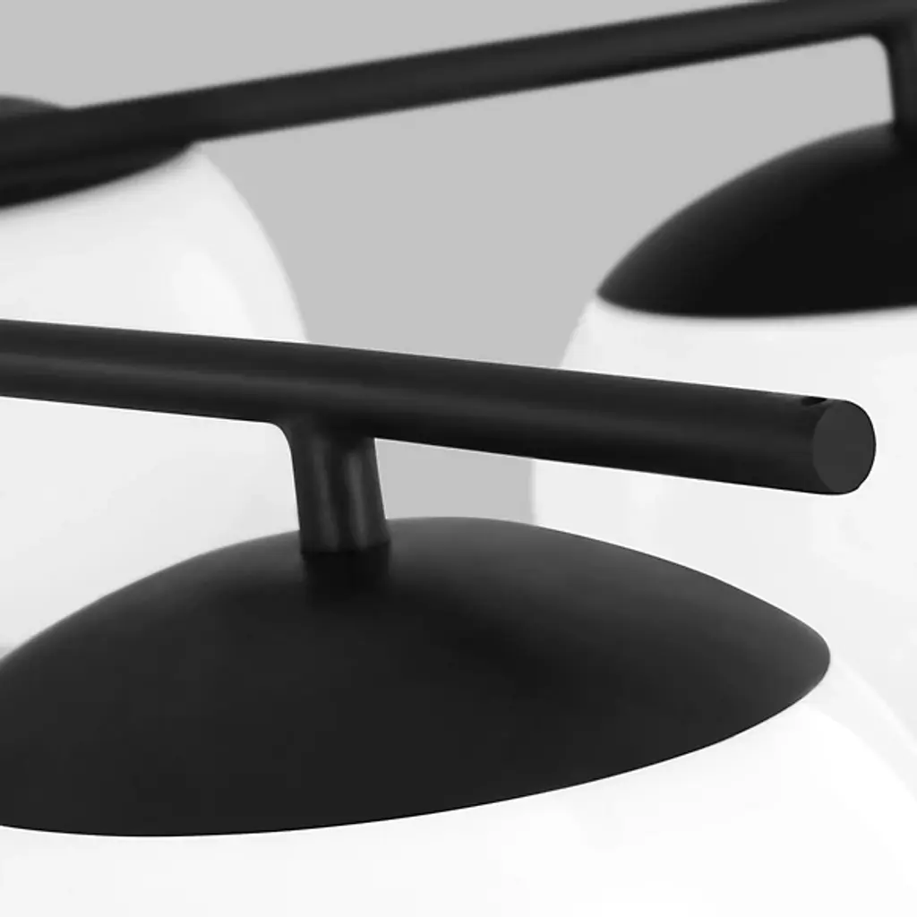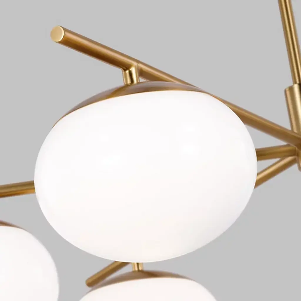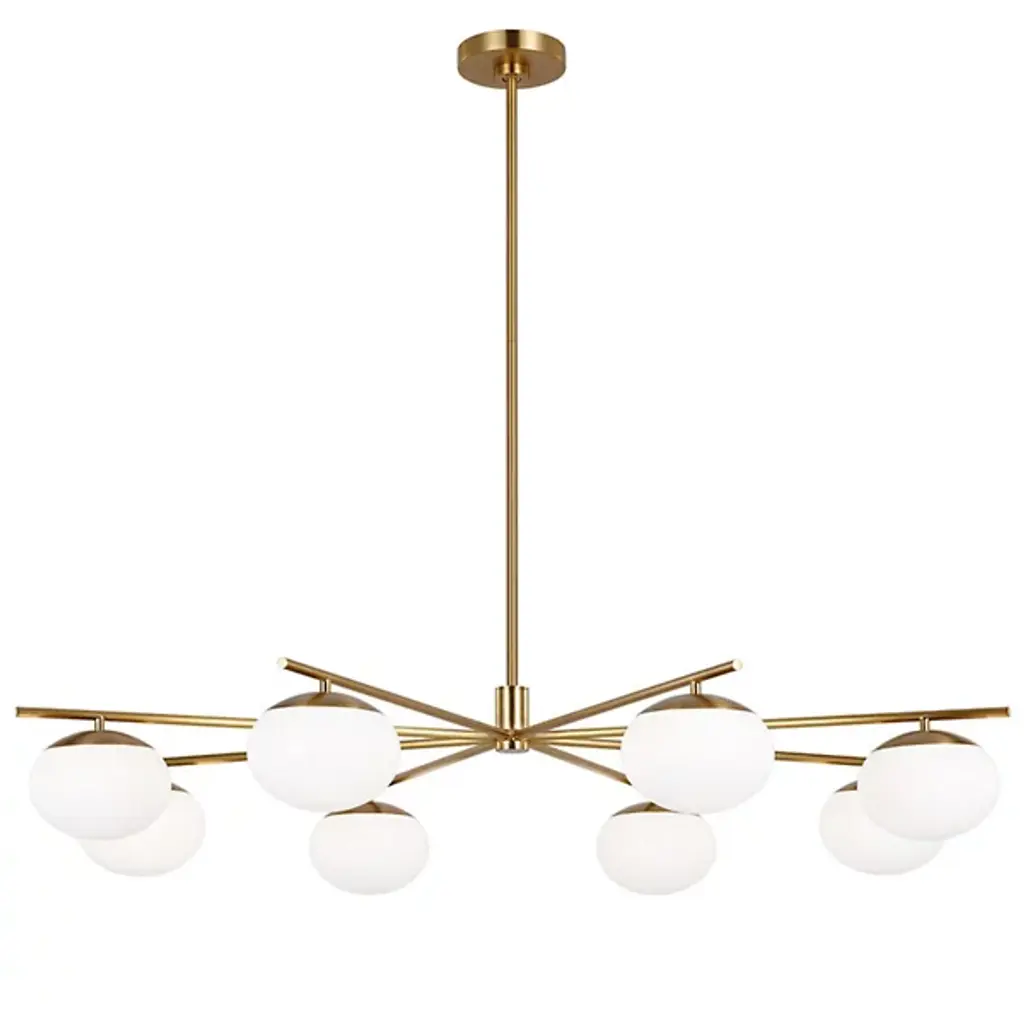 The iconic style of ED Ellen Degeneres’ Lune Chandelier is inspired by mid-century modern aesthetic. The eye draws toward the soothing color of milk glass shades. The symmetrical orbs diffuse light beautifully as they suspend below each metallic arm. The entirety of the composition evokes a flair for the dramatic and divine. Because this piece can live in standard dry interiors as well as damp locales, it has a versatile ability to elevate a space with enlightened design.