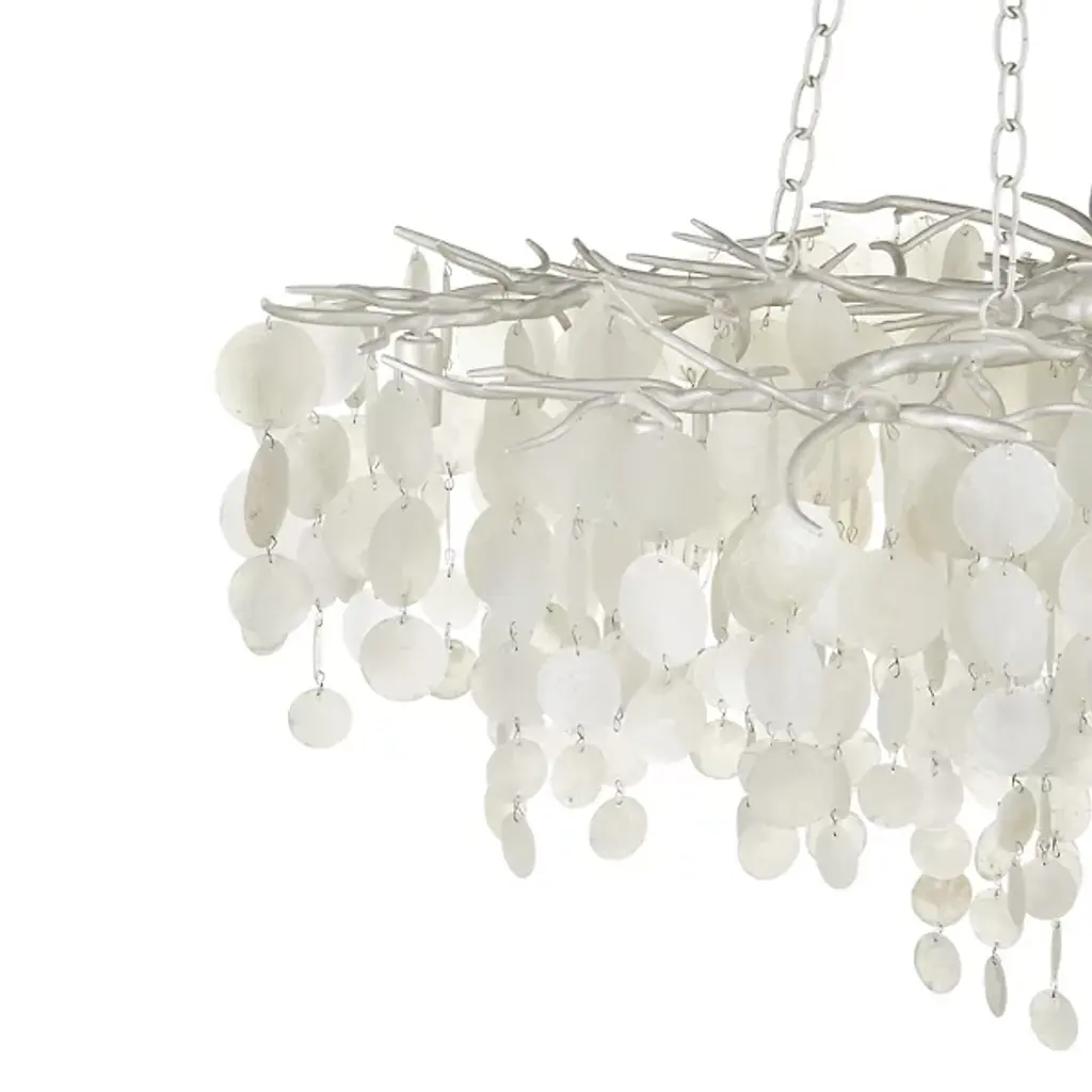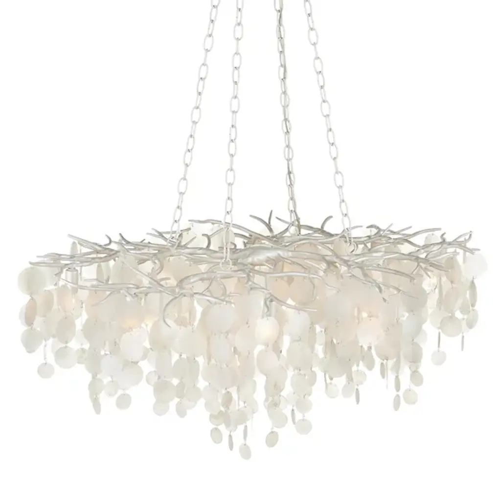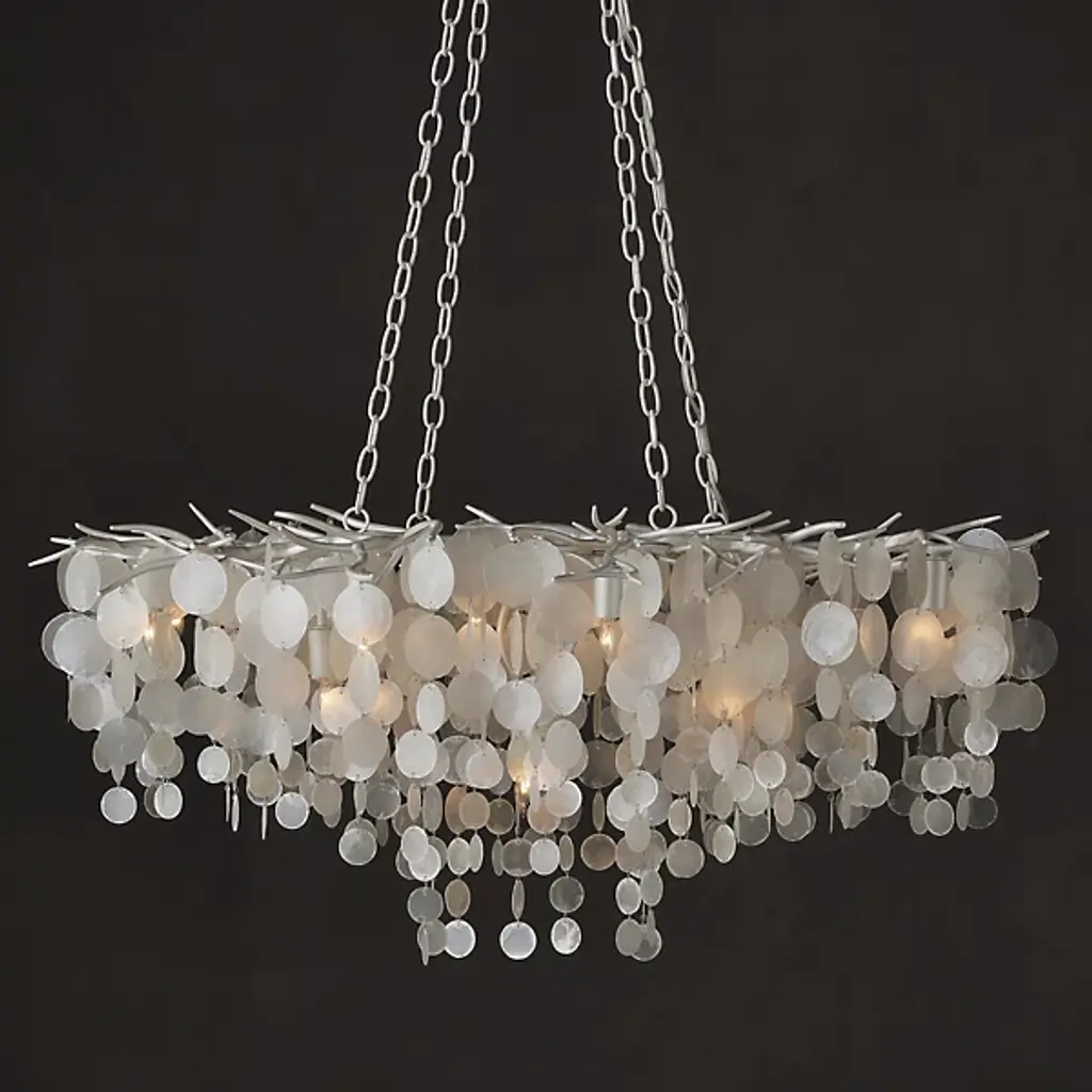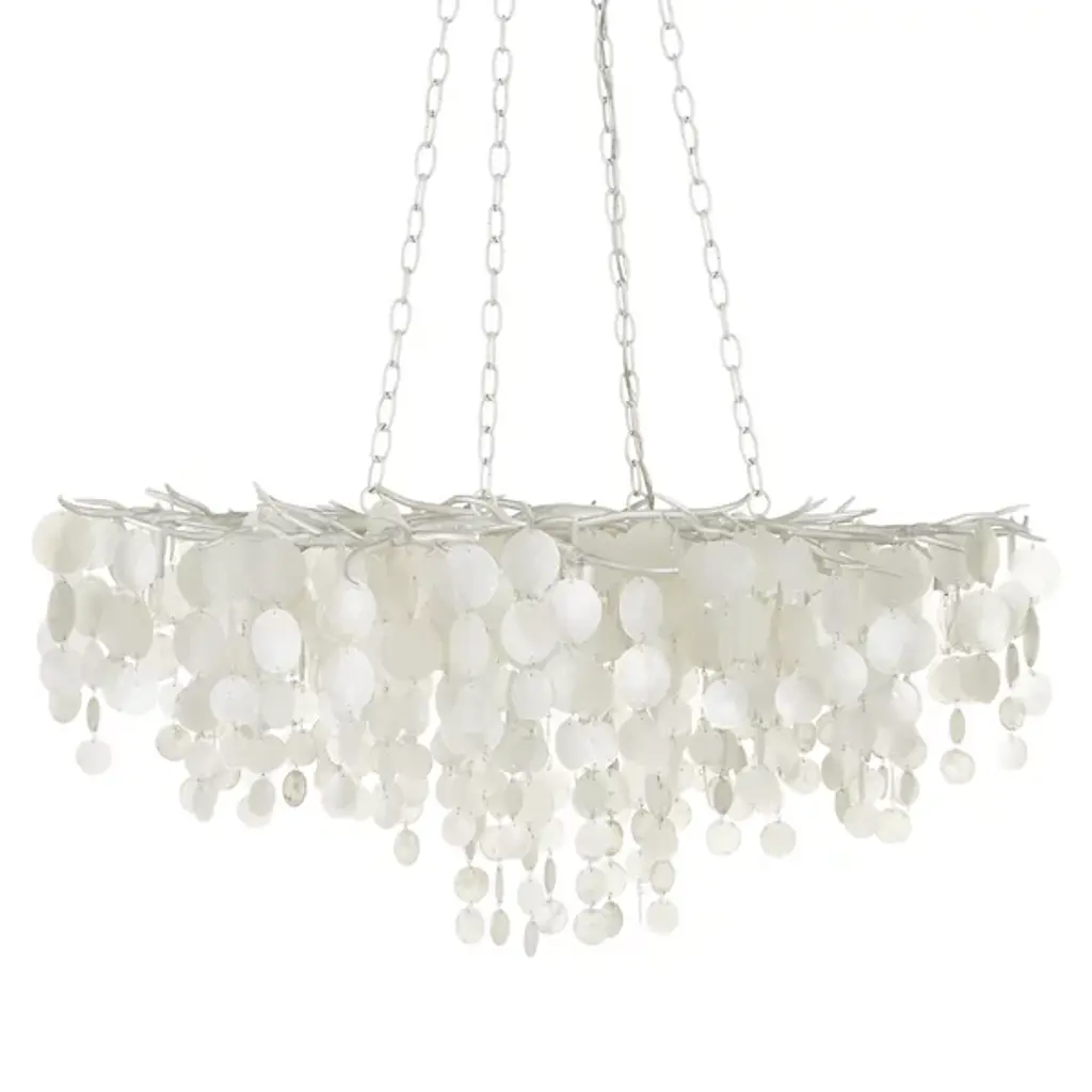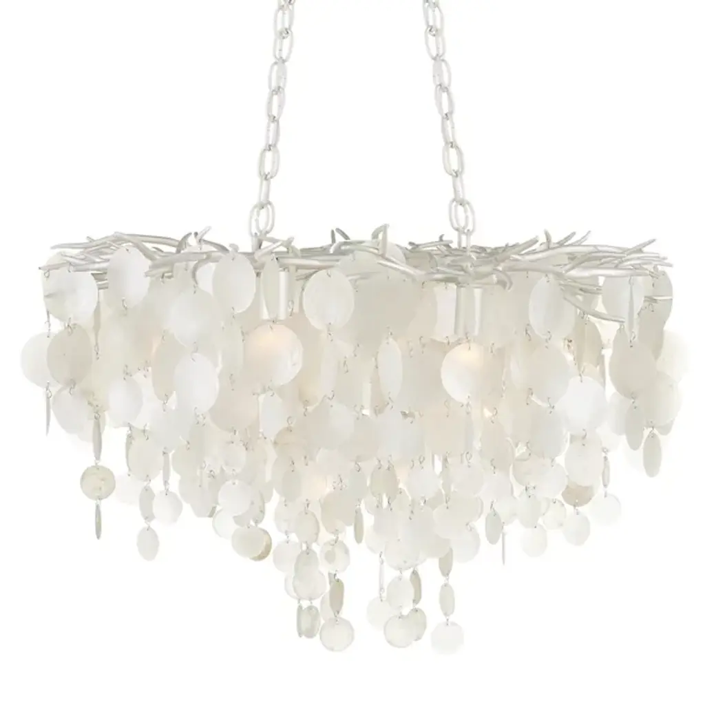 The Lusso Chandelier from Currey & Company features hand-cut capiz shell discs arranged in a cascading pattern atop a hand-forged wrought iron frame. The shells gradually decrease in diameter as they flow downward, creating a layered texture and gentle light diffusion throughout the fixture. The metal framework complements the natural iridescence of the capiz shells, producing unified coloration across all materials. This chandelier accommodates various ceiling heights through its adjustable suspension system, allowing the flowing shell arrangement to adapt to different room configurations and spatial requirements.