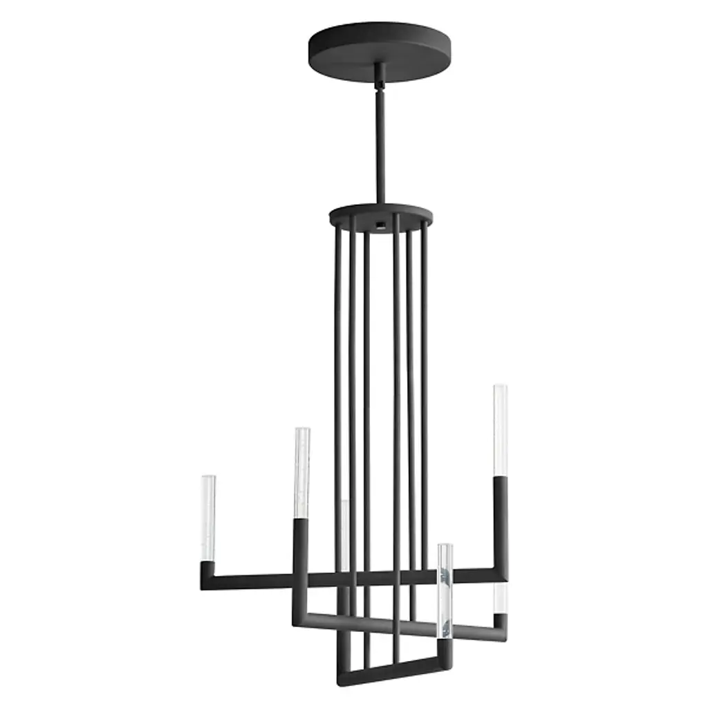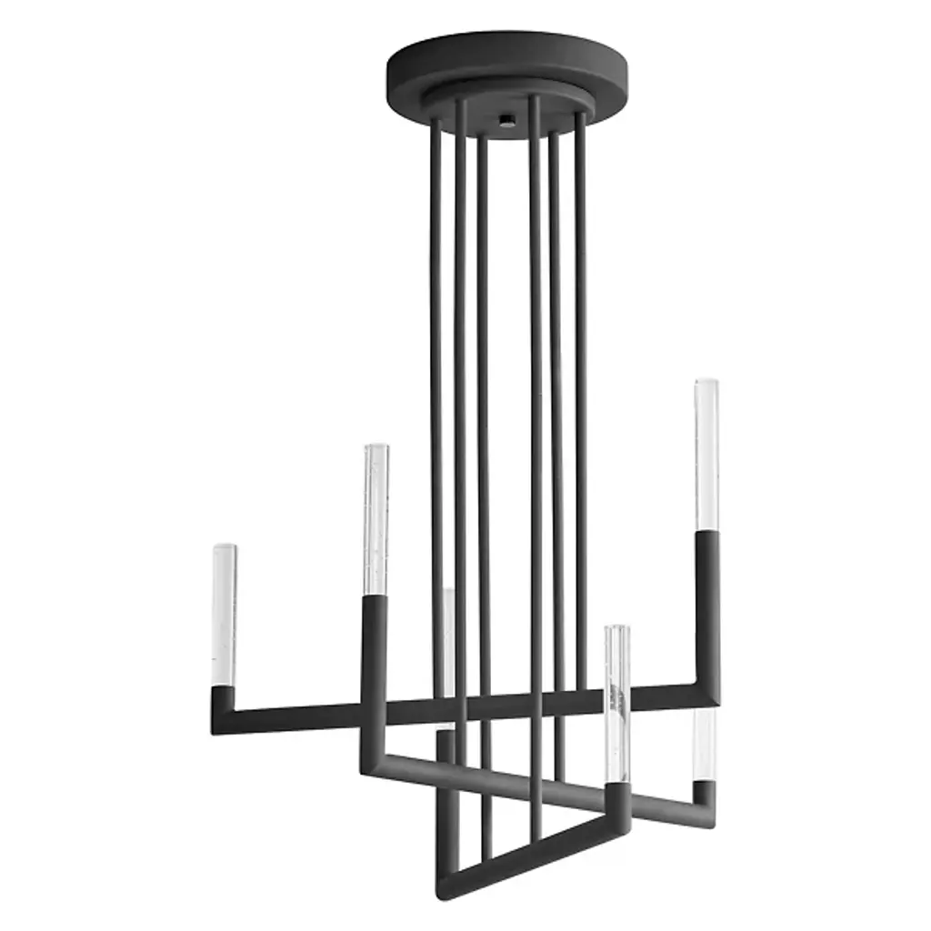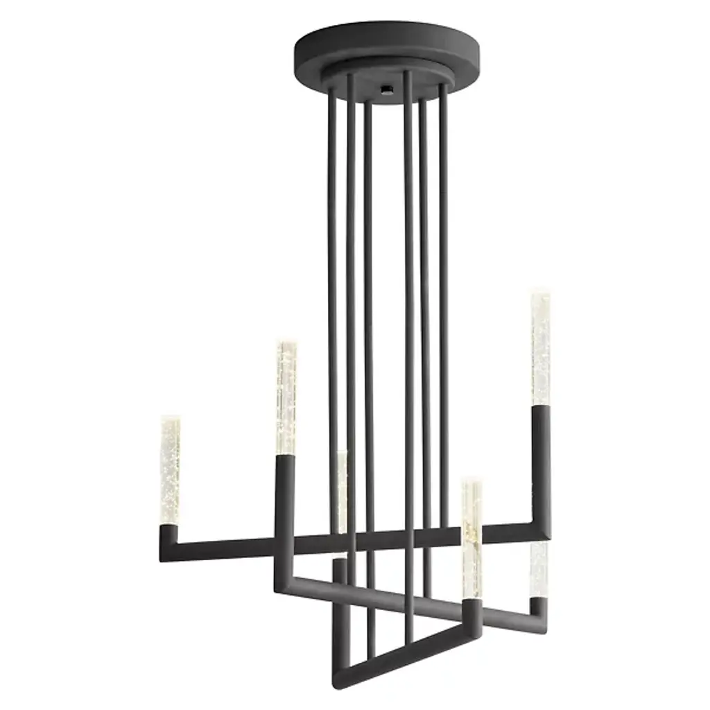 Enhance interiors with an airy appeal using the smooth sculptural lines and sleek structural design of the Lustre LED Chandelier from Oxygen Lighting, An ideal fixture for high-ceilinged spaces, it starts with a circular canopy with a secondary disc held below, which extends slim downrods in parallel, each pair sweeping down to a rounded crossbar below that holds some of the fixture’s LED lamping. Each end of the crossbar angles up to act as the housing for a damp-listed integrated LED, with one end rising higher than the other for an elegant offset when set across other crossbars. Sleek cylinders of bubble glass bloom atop each housing, creating an organic contrast to the smooth solidity of the metal structure and transmitting a lively light in all directions.
