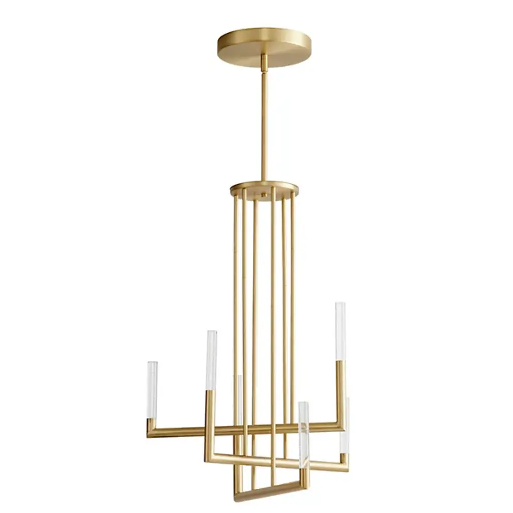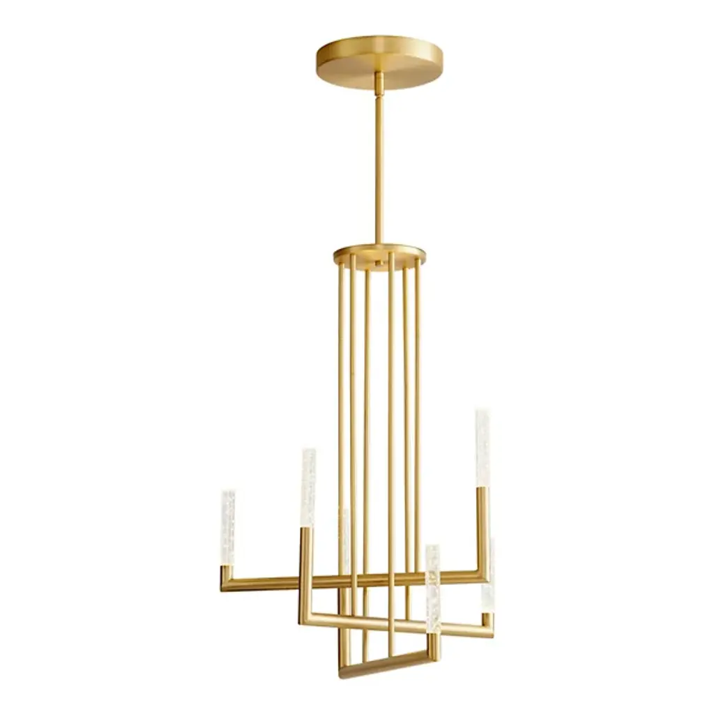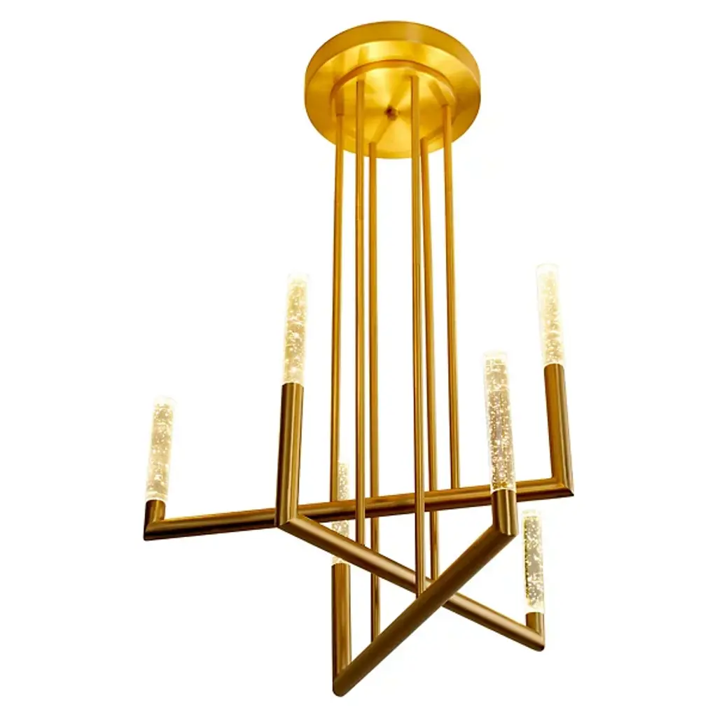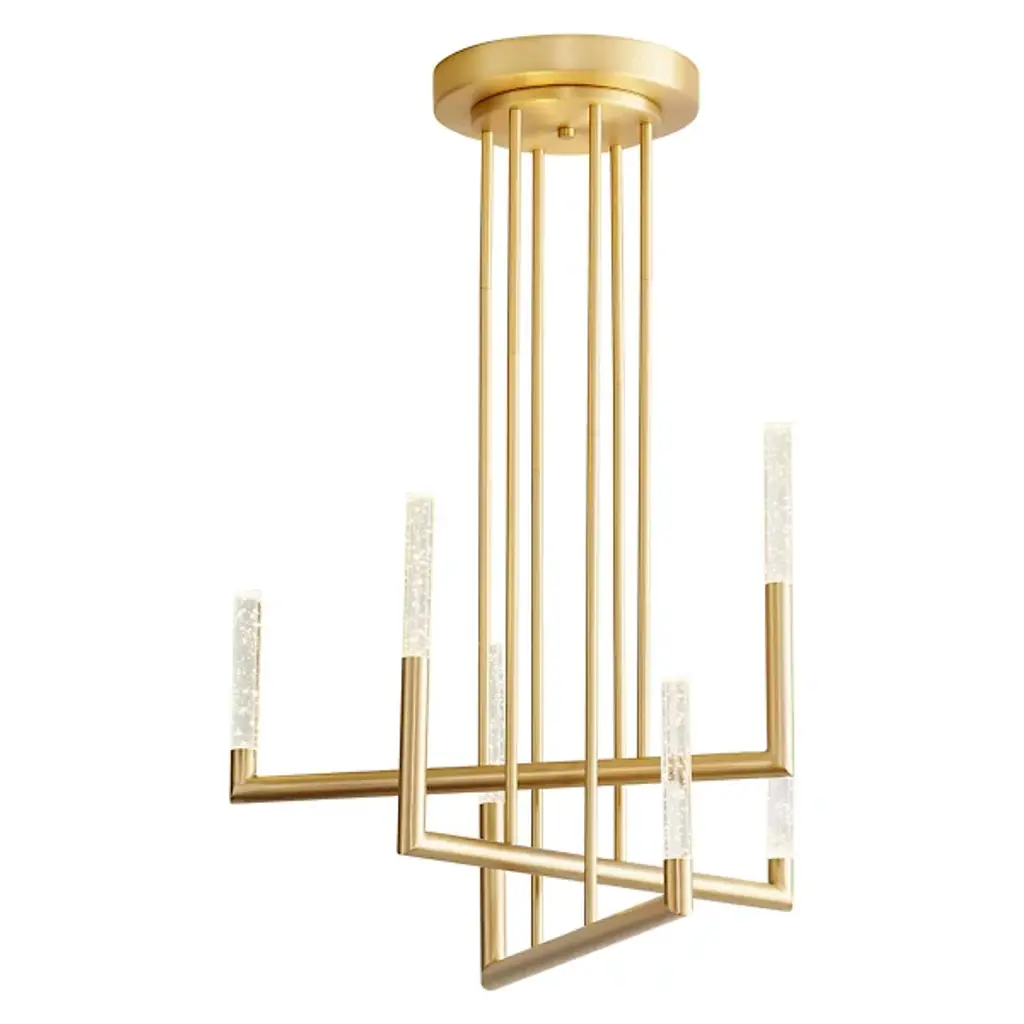 Enhance interiors with an airy appeal using the smooth sculptural lines and sleek structural design of the Lustre LED Chandelier from Oxygen Lighting, An ideal fixture for high-ceilinged spaces, it starts with a circular canopy with a secondary disc held below, which extends slim downrods in parallel, each pair sweeping down to a rounded crossbar below that holds some of the fixture’s LED lamping. Each end of the crossbar angles up to act as the housing for a damp-listed integrated LED, with one end rising higher than the other for an elegant offset when set across other crossbars. Sleek cylinders of bubble glass bloom atop each housing, creating an organic contrast to the smooth solidity of the metal structure and transmitting a lively light in all directions.