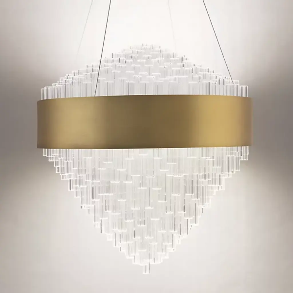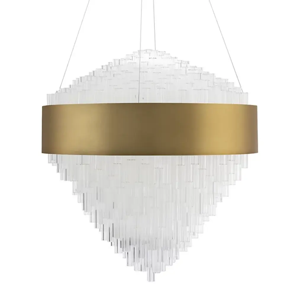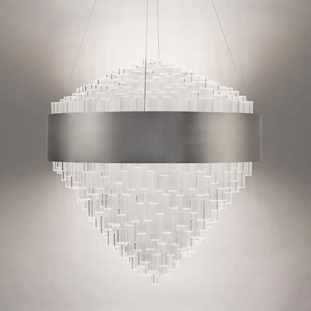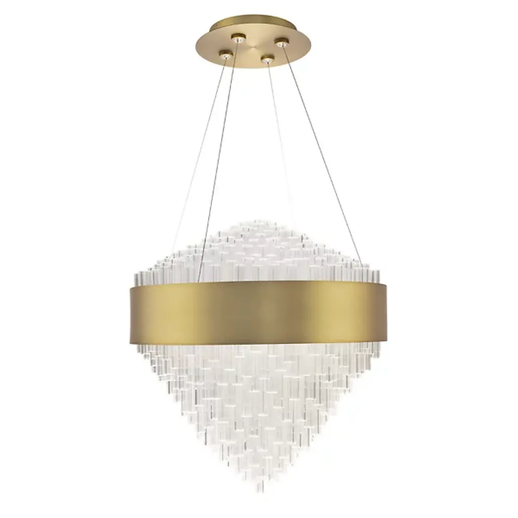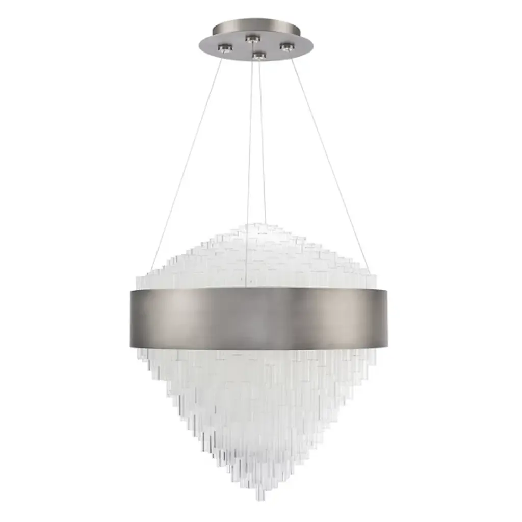 With dramatic proportions, the Luzerne LED Chandelier from Modern Forms showcases bundles of fluted glass cylinders nested together, producing a striking prismatic effect. Enhanced by a gleaming inner plate that creates a mirrored effect, it elegantly accentuates the delicate crystalline elements. Its robust welded steel body paired with clear extruded reeded glass embodies an industrial yet elegant aesthetic. Ultra-sleek electrified cables eliminate the need for bulky power wires, offering easy height adjustment through push-pin connectors on the canopy, suitable for sloped ceilings.