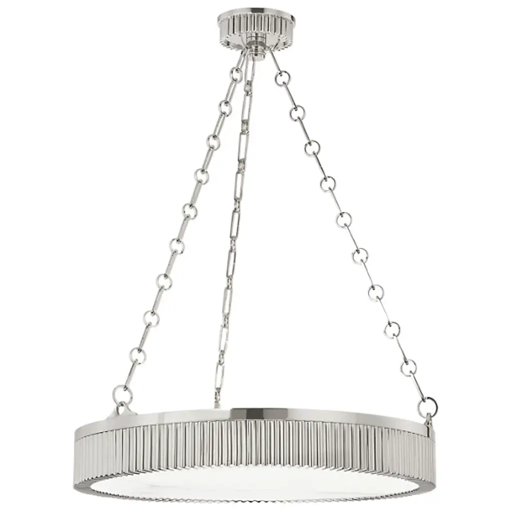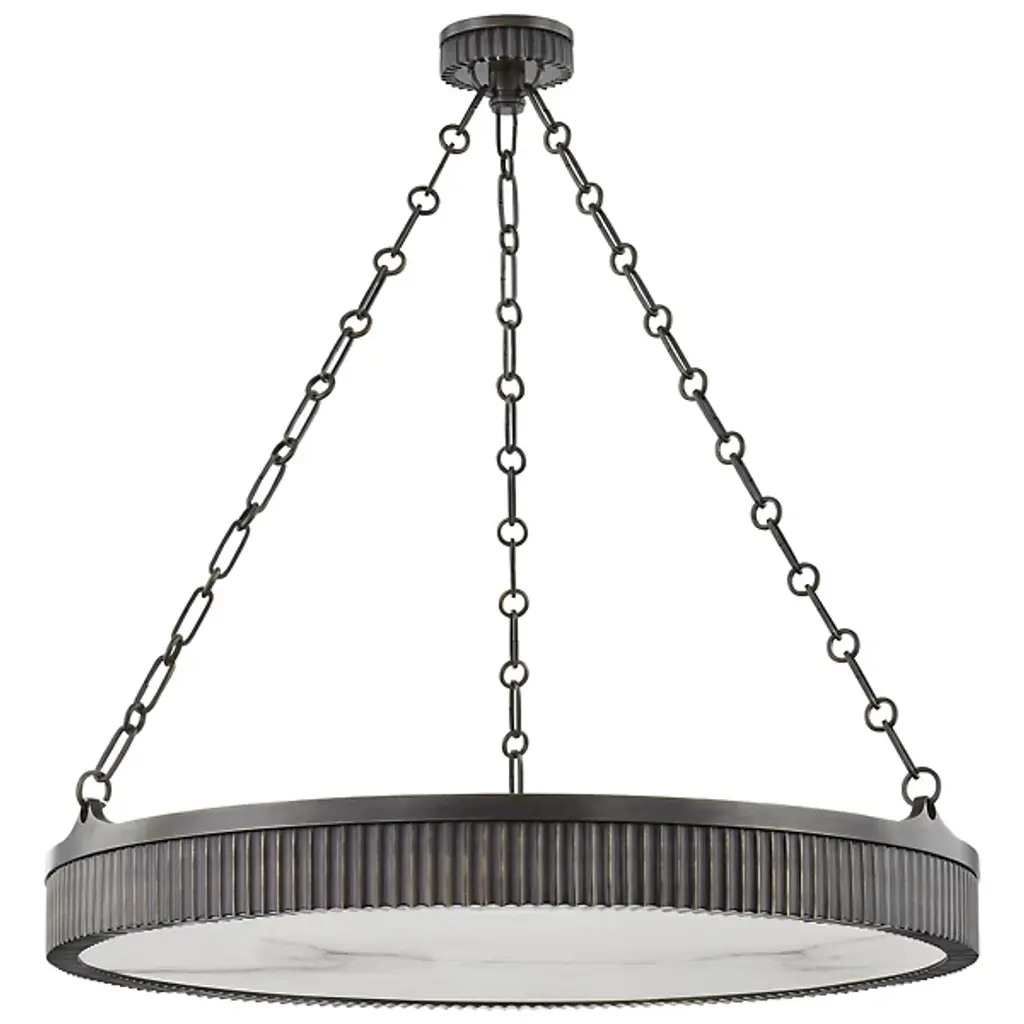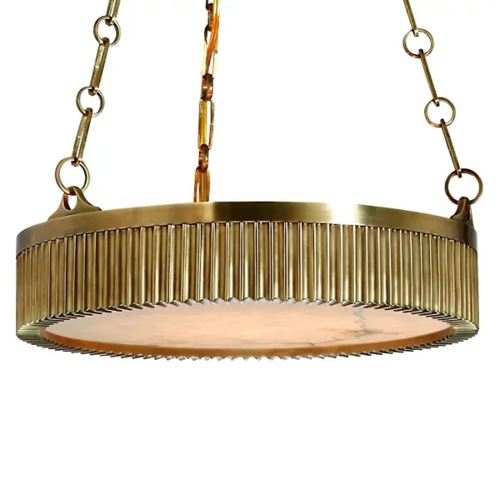The Hudson Valley Lynden Chandelier offers a stunning combination of varying hues (marbled and metallic) and materials (solid brass and alabaster). Features a cream alabaster flat glass shade and a distinctive frame available in several classic and contemporary finishes. It can also be installed as a semi-flushmount without the chains.