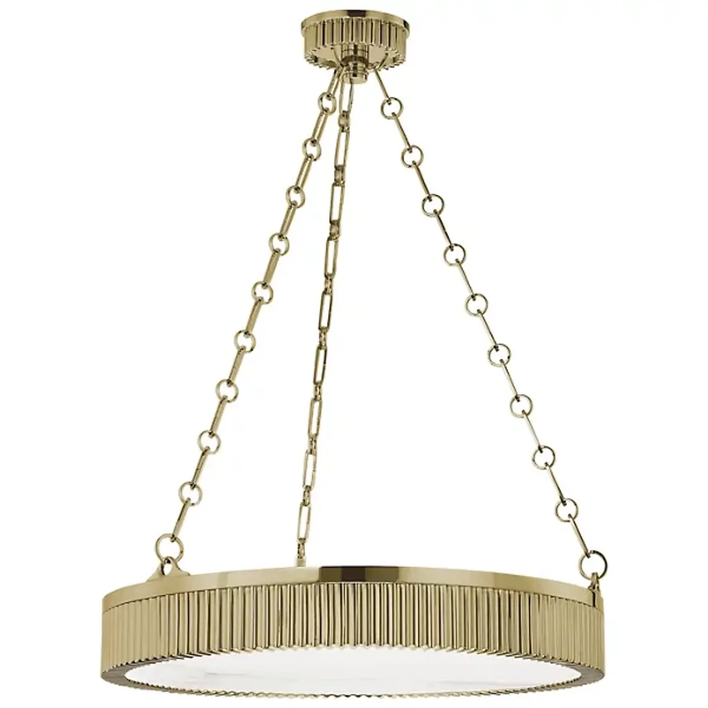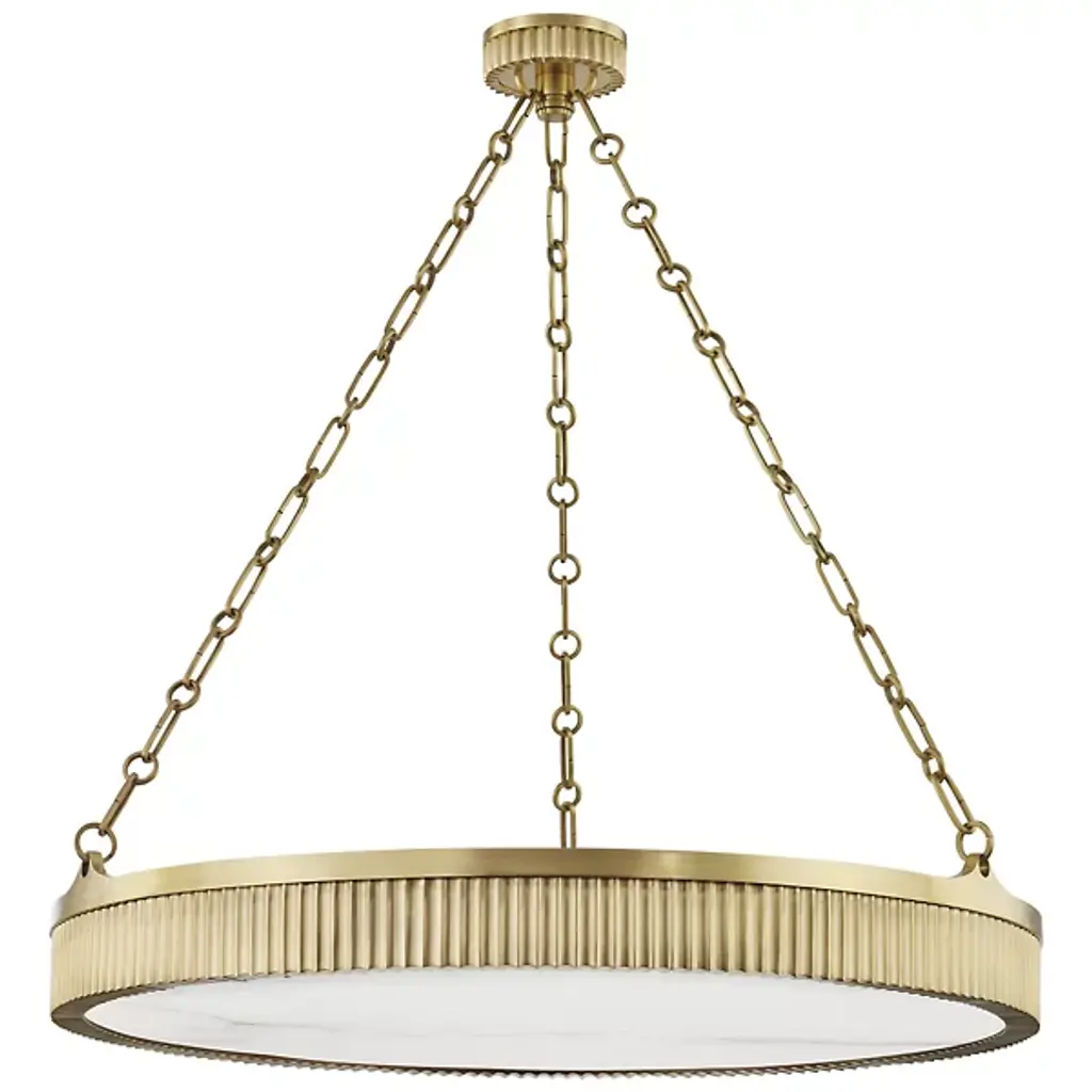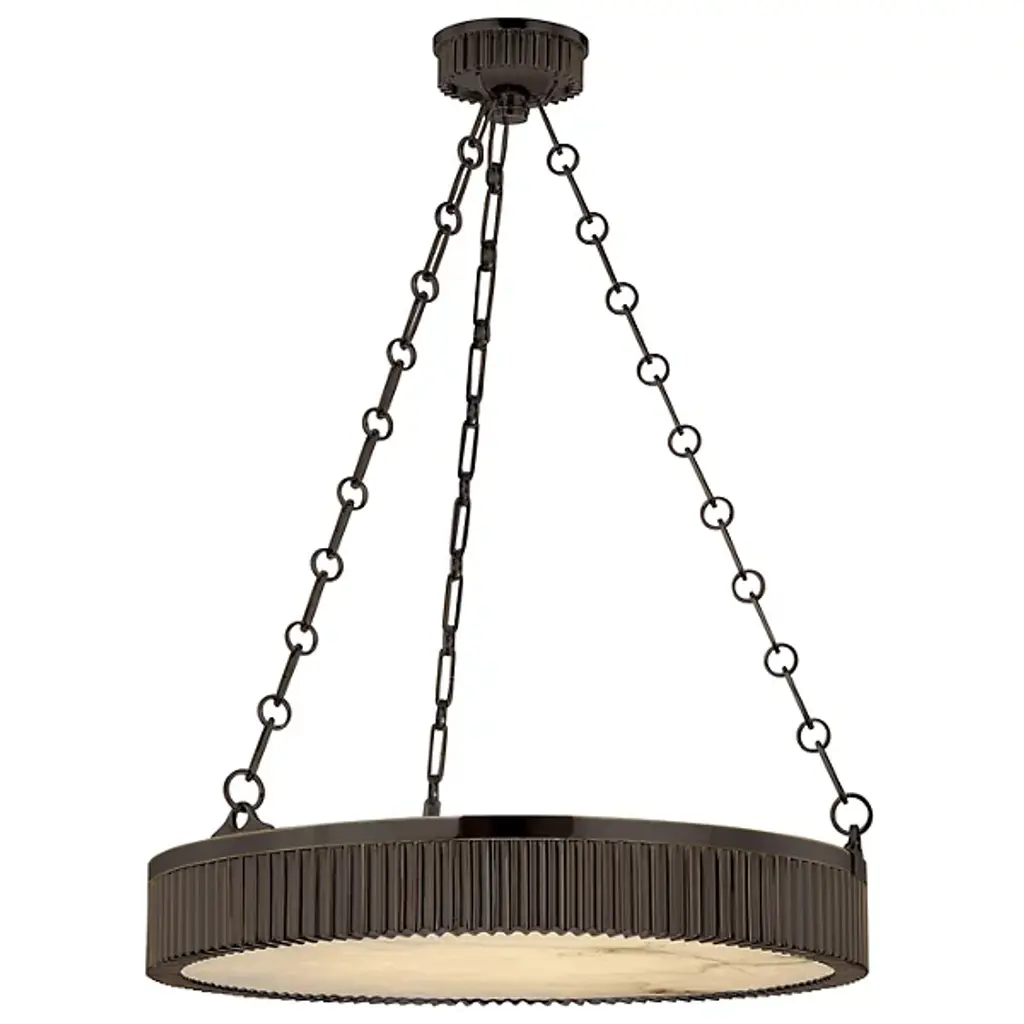The Hudson Valley Lynden Chandelier offers a stunning combination of varying hues (marbled and metallic) and materials (solid brass and alabaster). Features a cream alabaster flat glass shade and a distinctive frame available in several classic and contemporary finishes. It can also be installed as a semi-flushmount without the chains.