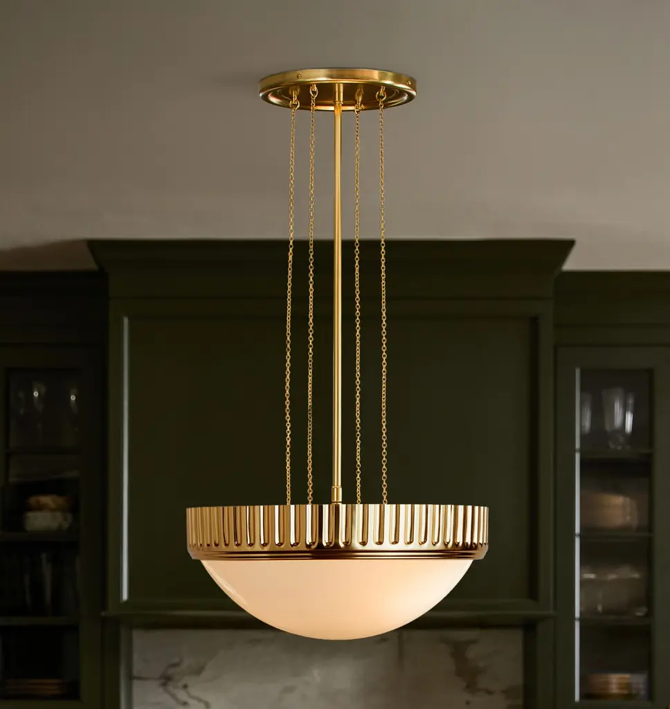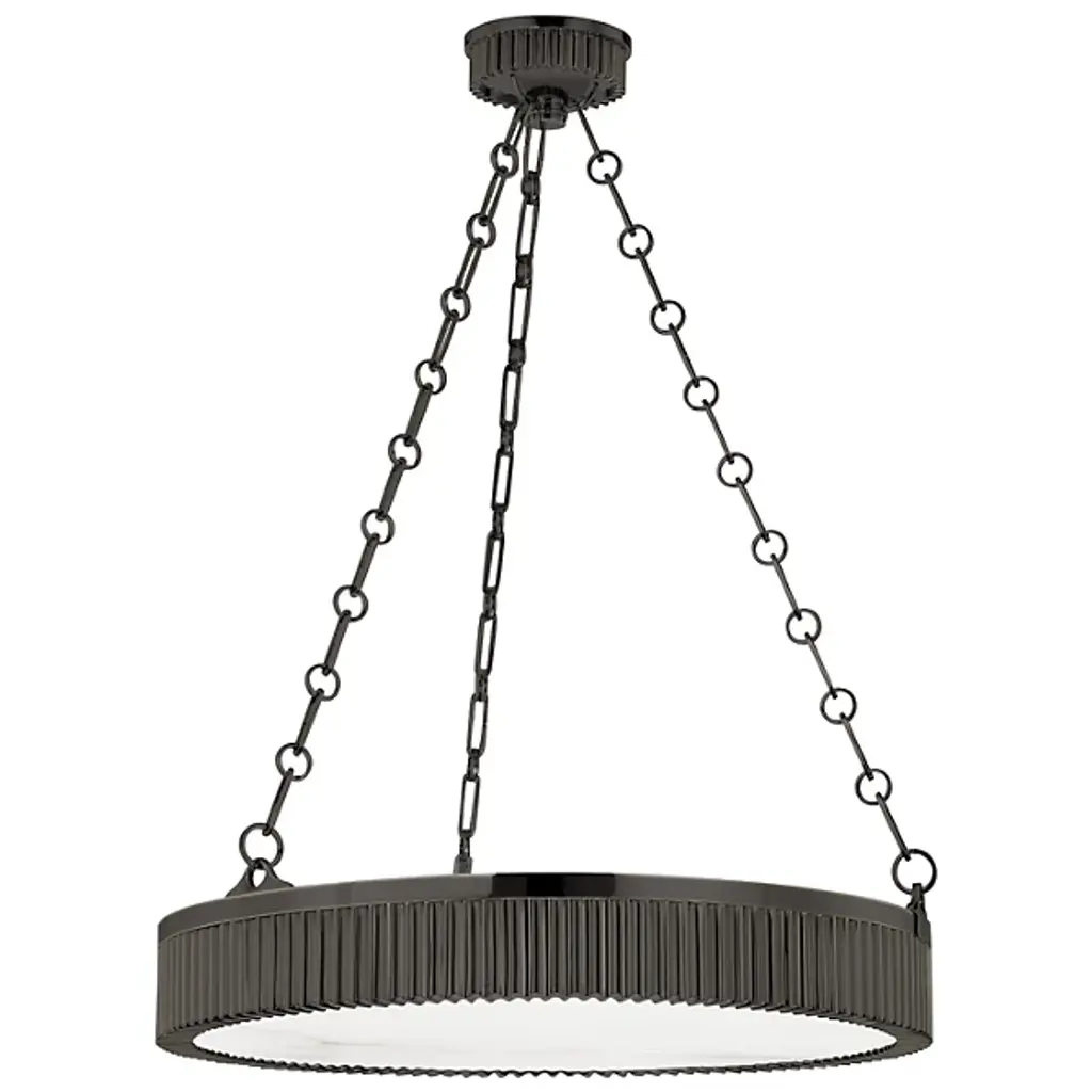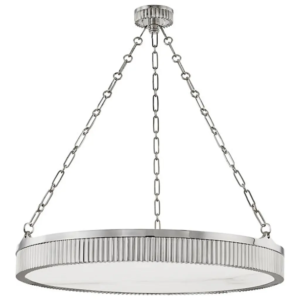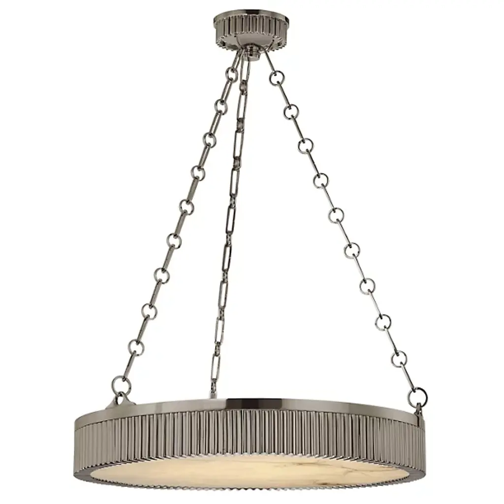 The Hudson Valley Lynden Chandelier offers a stunning combination of varying hues (marbled and metallic) and materials (solid brass and alabaster). Features a cream alabaster flat glass shade and a distinctive frame available in several classic and contemporary finishes. It can also be installed as a semi-flushmount without the chains.