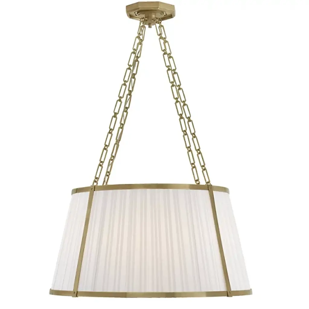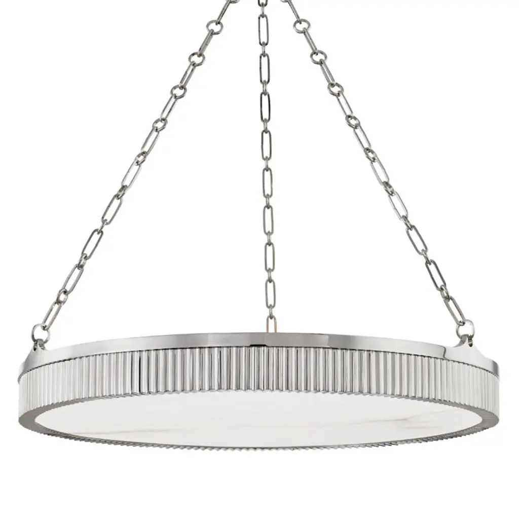 A beautifully detailed, corrugated cast metal frame surrounds the luxurious alabaster diffuser of this stunning drum-shaped pendant. Light passes through the alabaster giving off a soft glow. Available in three sizes and four finishes, Lynden is perfect in entryways, libraries, over large round tables or anywhere you want to make a statement. Choose from Aged Brass, Antique Nickel, Distressed Bronze and Polished Nickel.