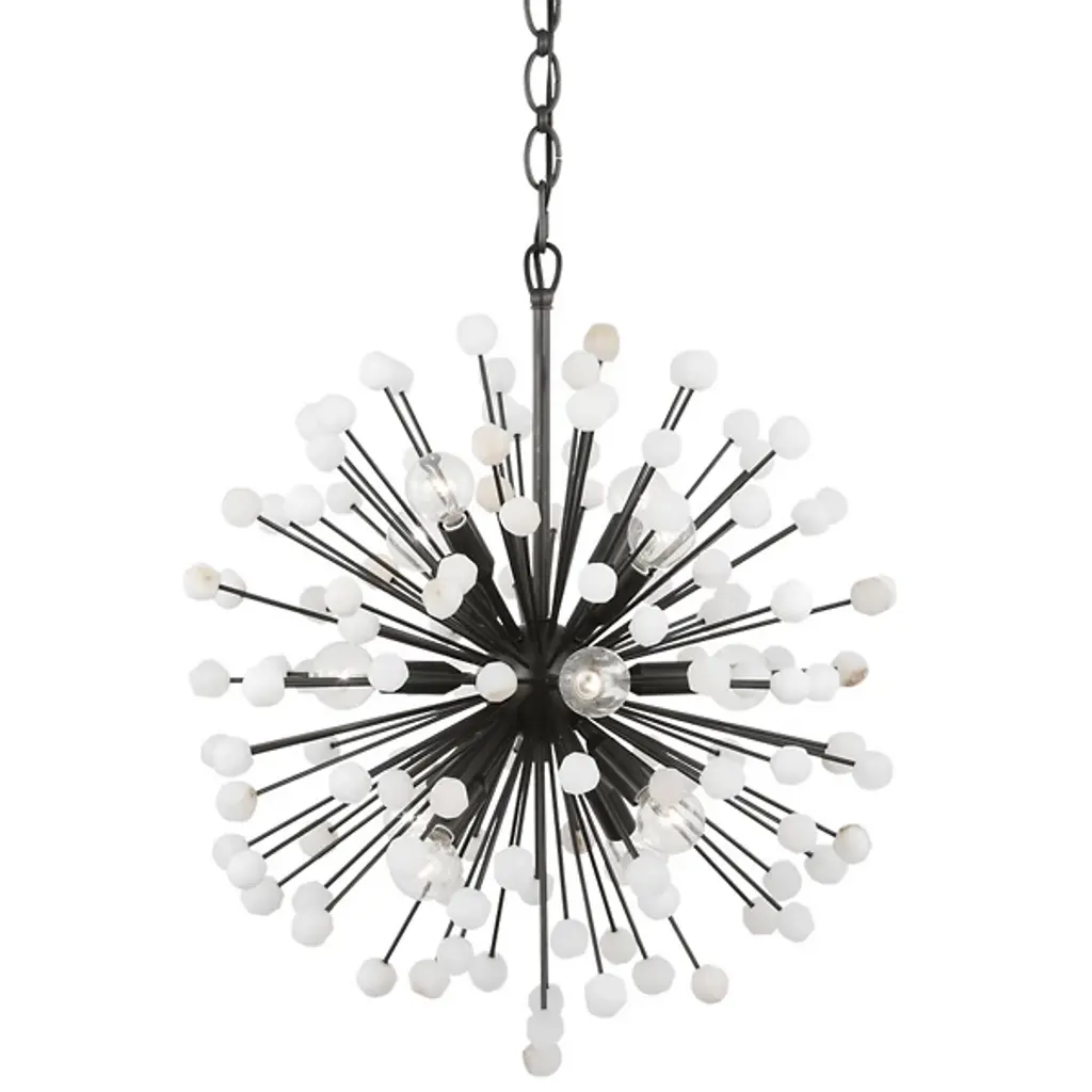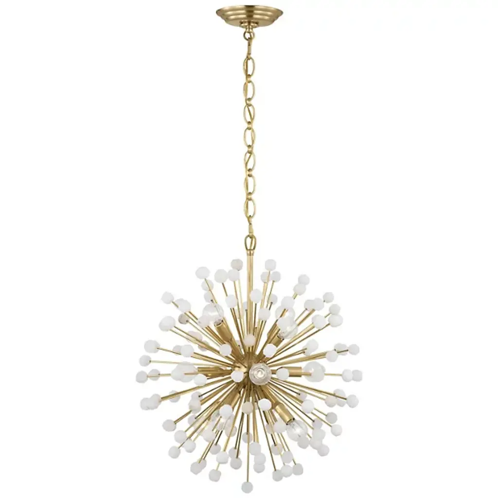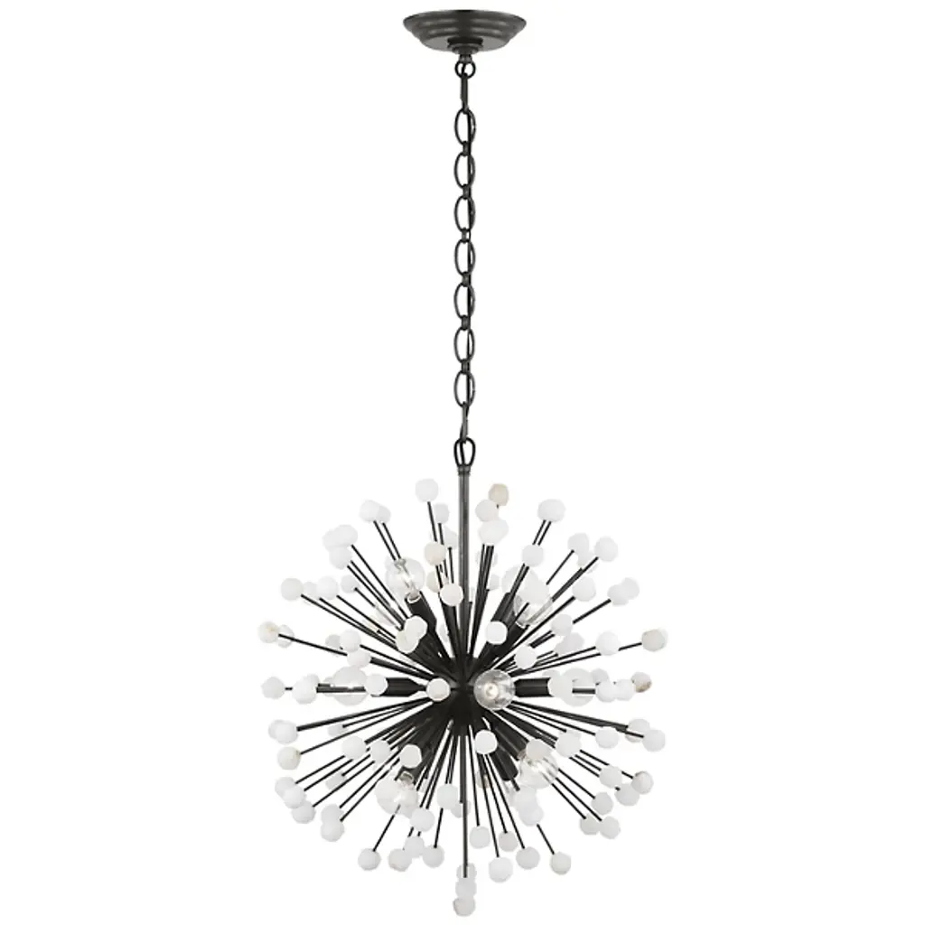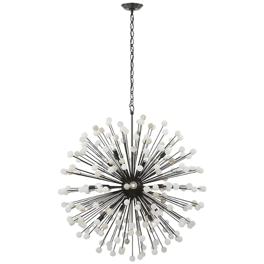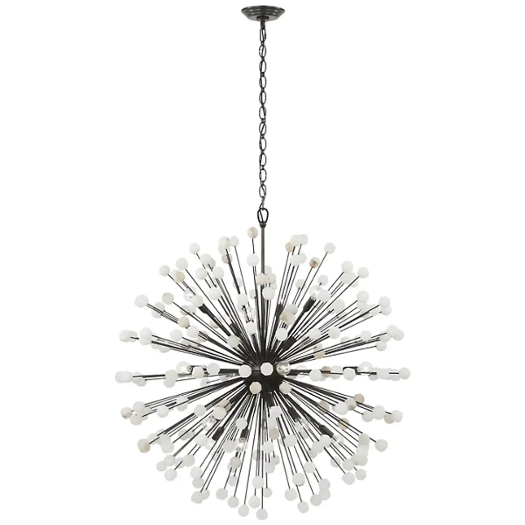 The Lys Chandelier from Visual Comfort Signature orchestrates a spectacular burst of radiance through its dynamic Sputnik design. Multiple arms radiate from the central sphere, each extending outward like frozen fireworks. The brass and alabaster composition by Suzanne Kasler delivers a theatrical display where each crystalline point of light multiplies across the space. This celestial-inspired fixture elevates spaces through its precise geometric arrangement and artful distribution of light.
